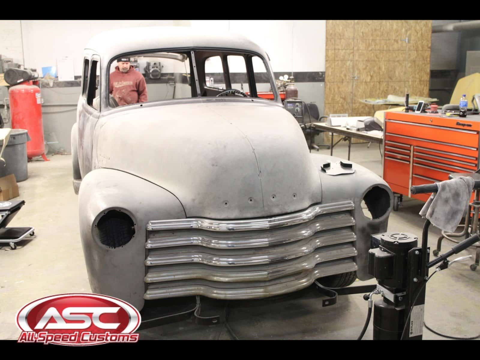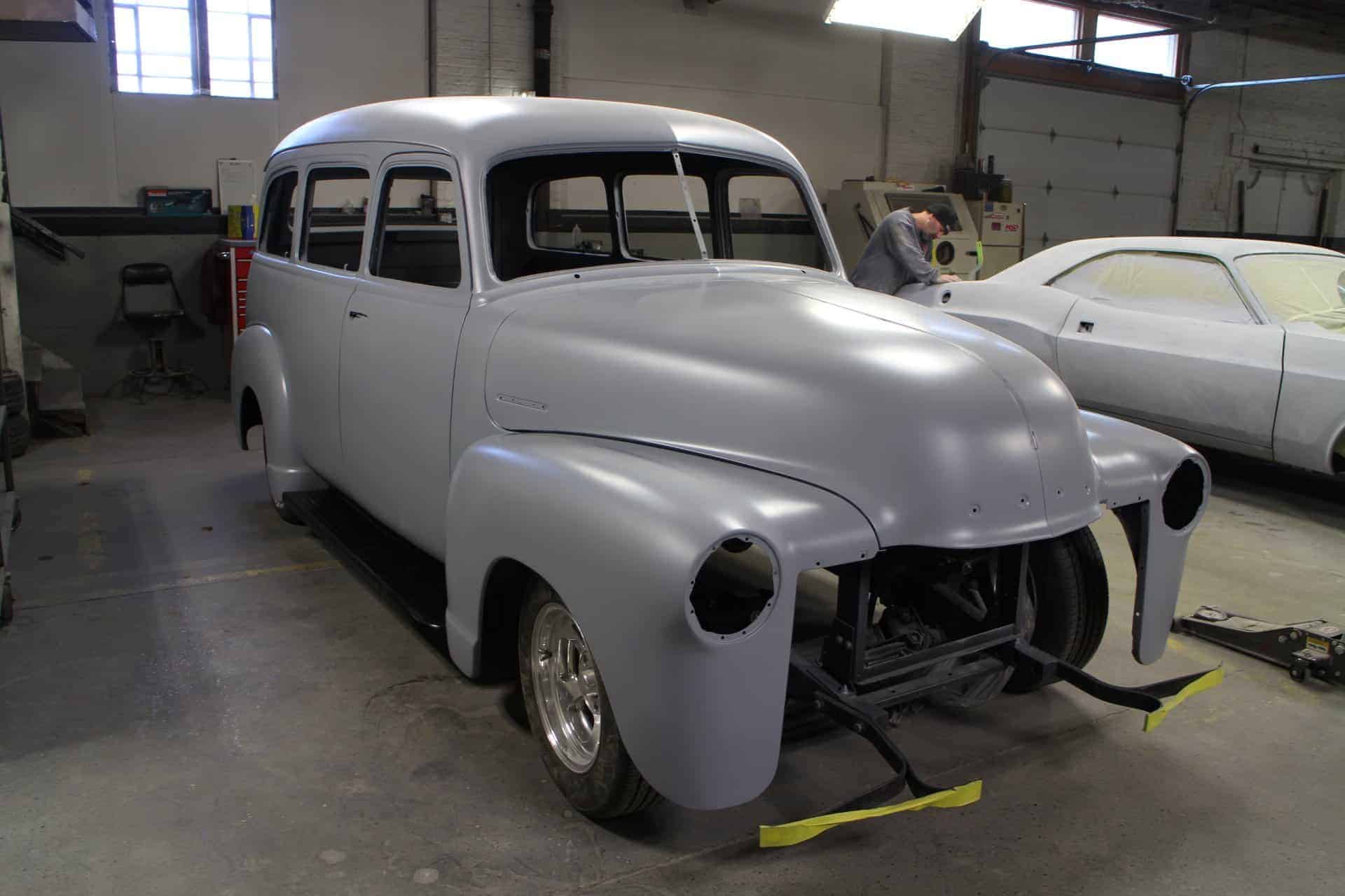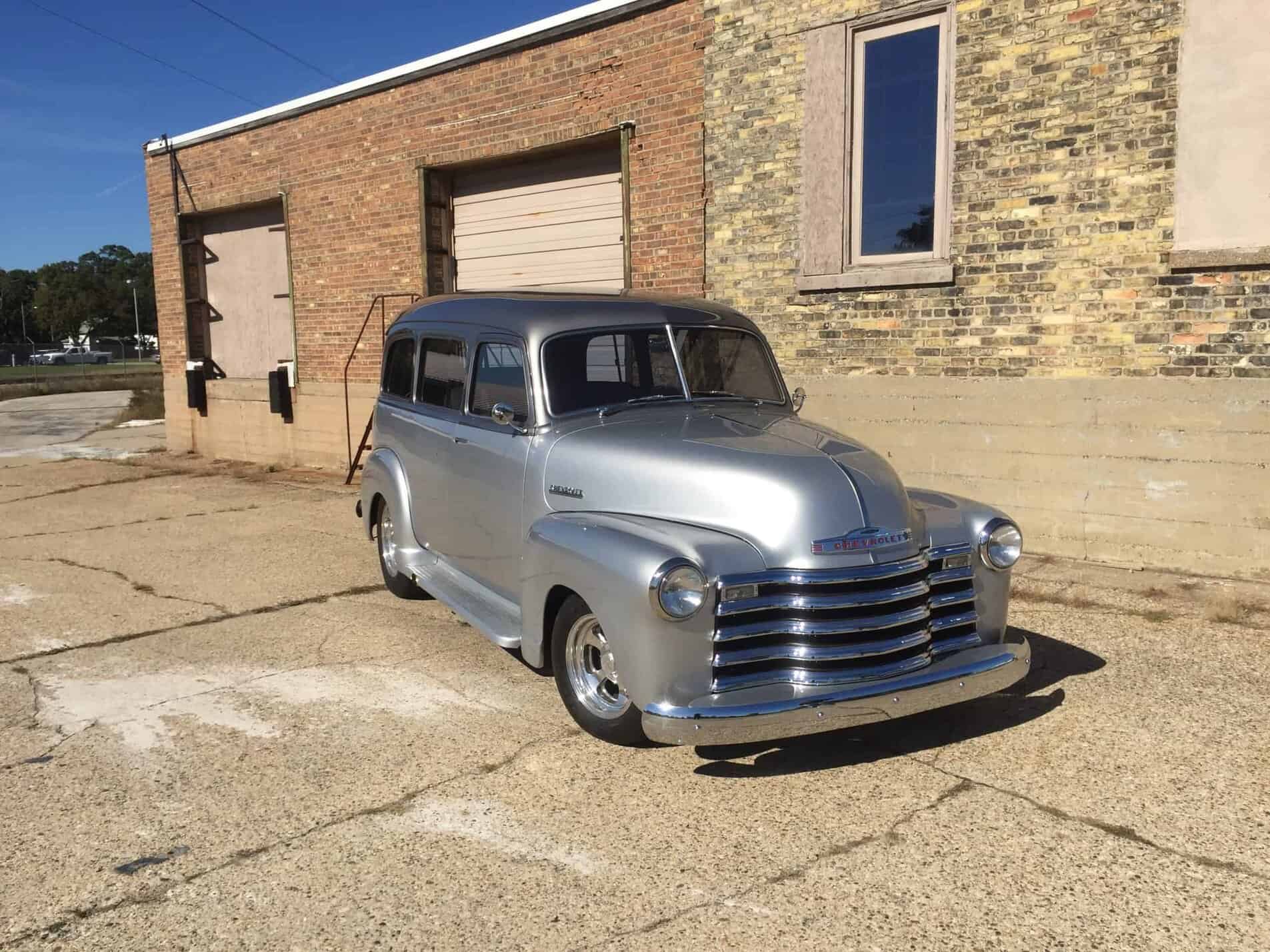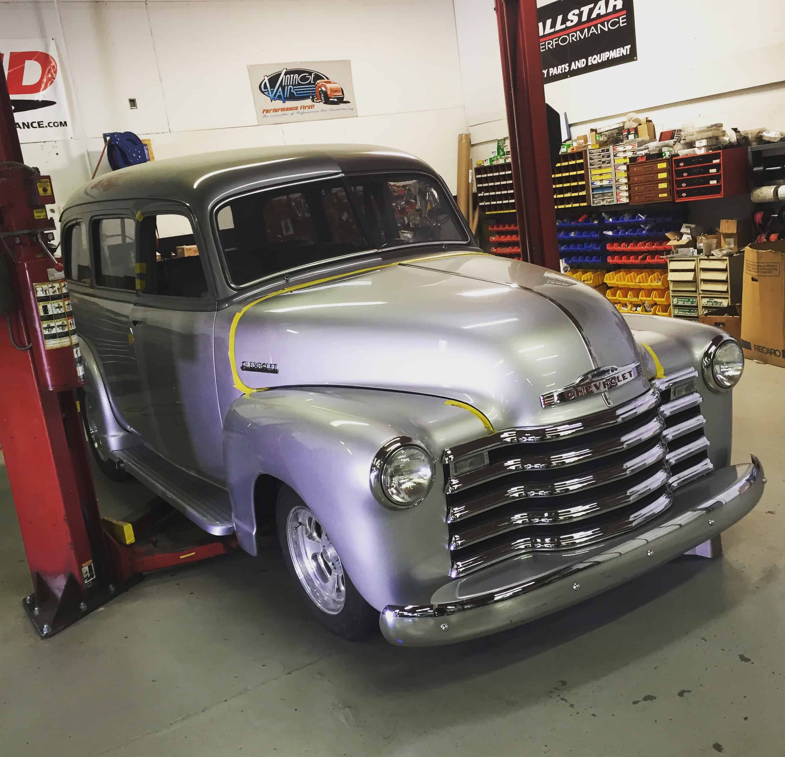 This is a 1950 Chevy Suburban completely restored and built by All Speed Customs with a lot of one-off work. We started with a Fat Man chassis, performed minor rust repair and fabrication, and installed a modern suspension, custom 2-tone paint, a big block Chevy engine, full custom interior, and a lot of other alterations.