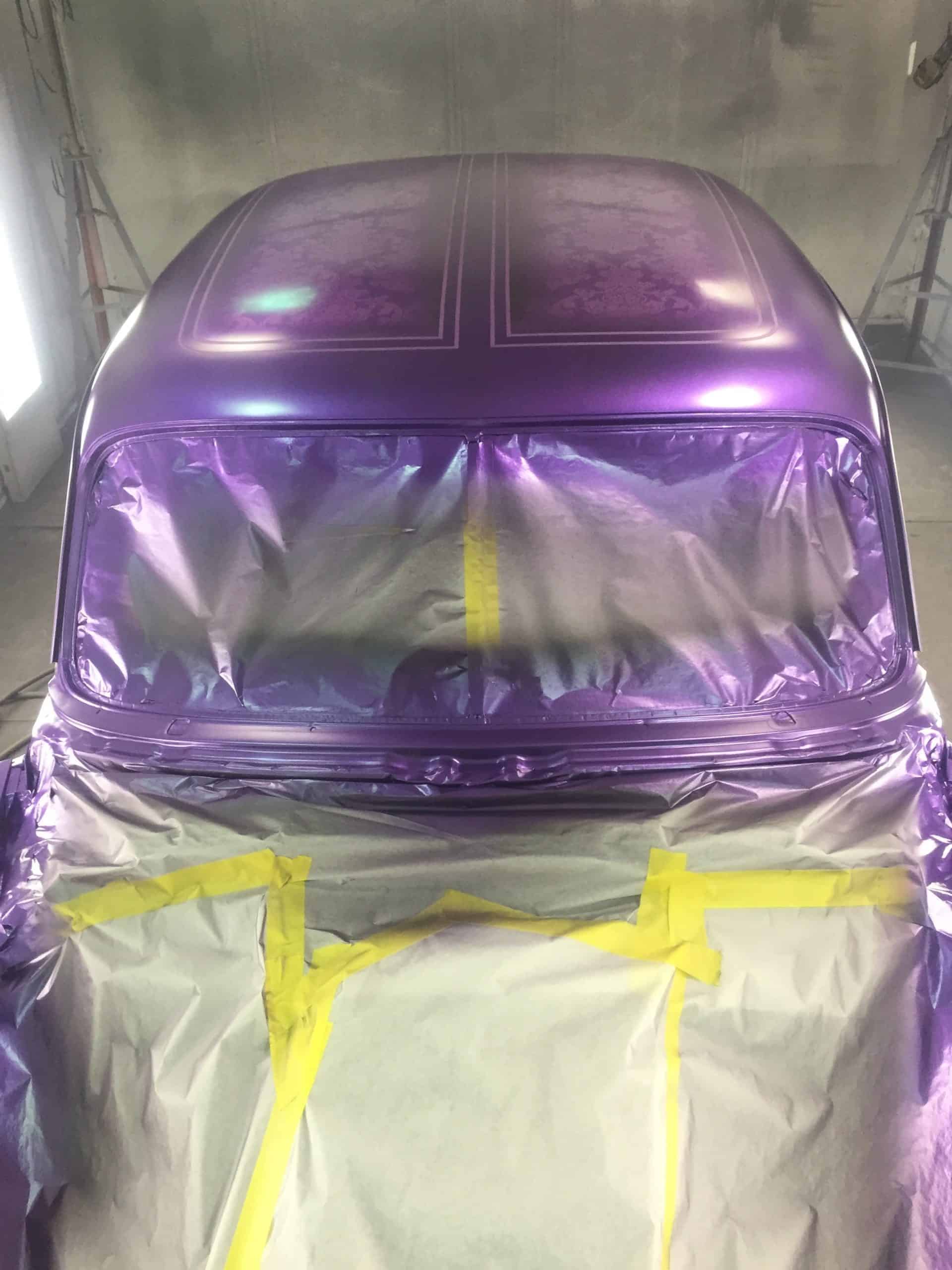 One of more unique paint schemes we’ve applied here at ASC is on this 1951 Chevy Fleetline Street Rod. Purple, purple, and more purple. Plus that doily pattern.