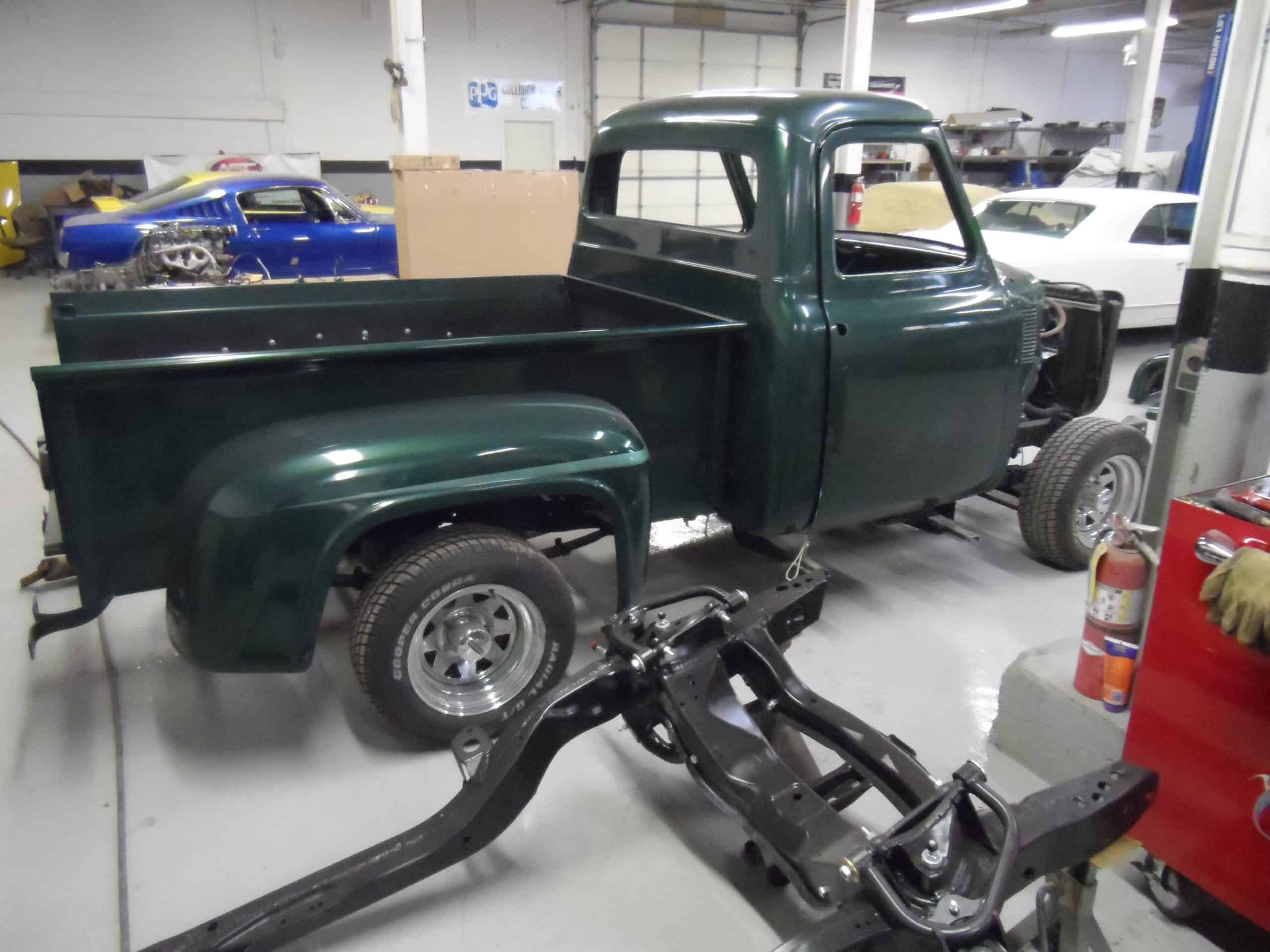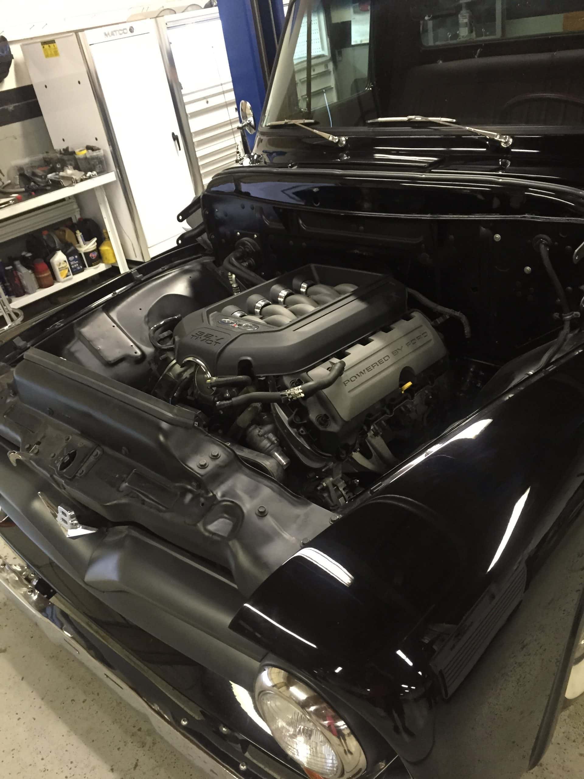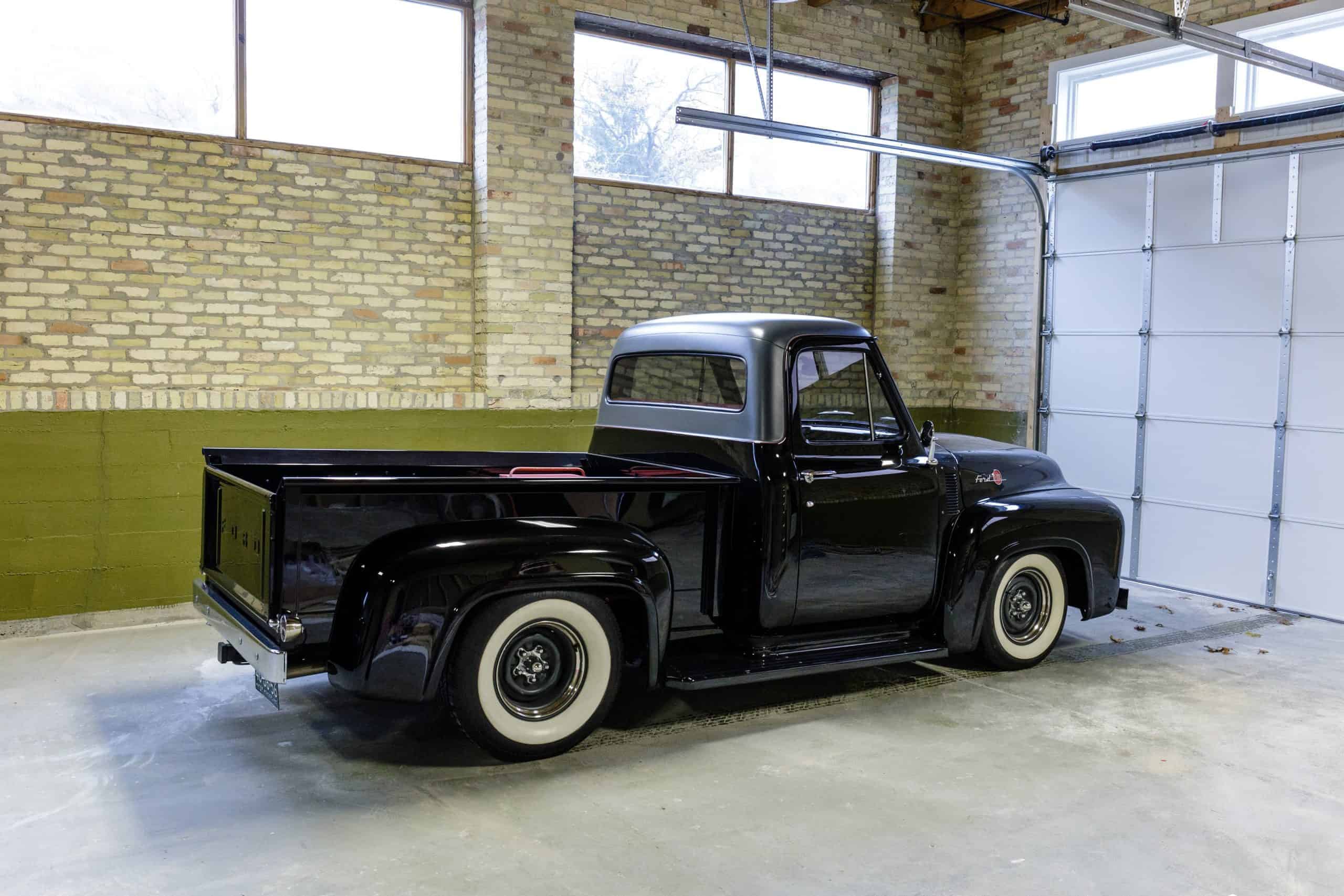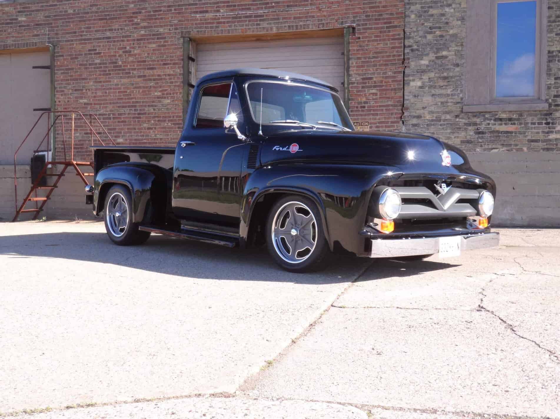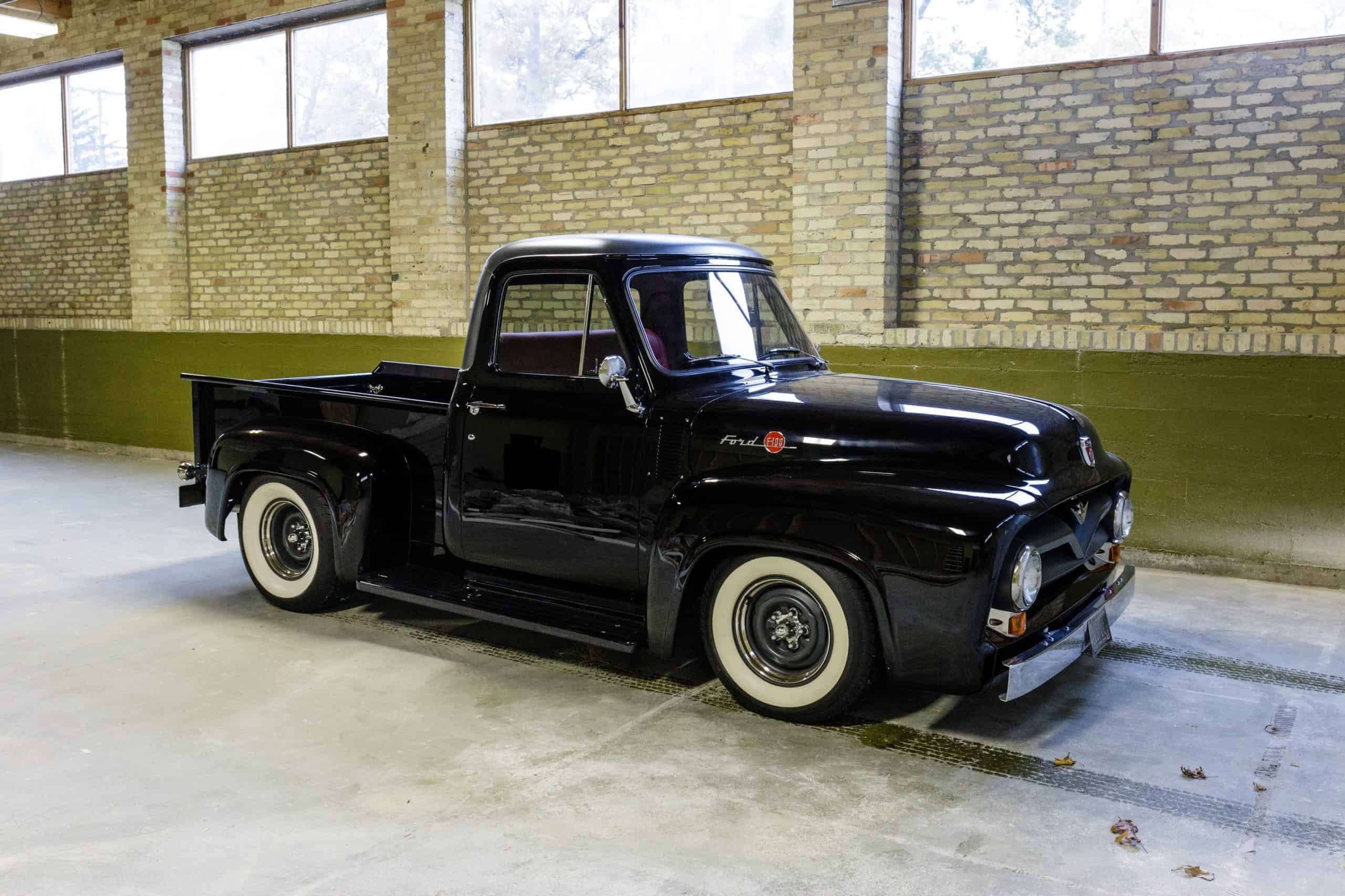 This 1955 Ford F100 pickup was completely rebuilt as a frame-off restoration with a modern Ford 5.0L Coyote V8 engine, rear 4-link suspension, and custom leather interior.