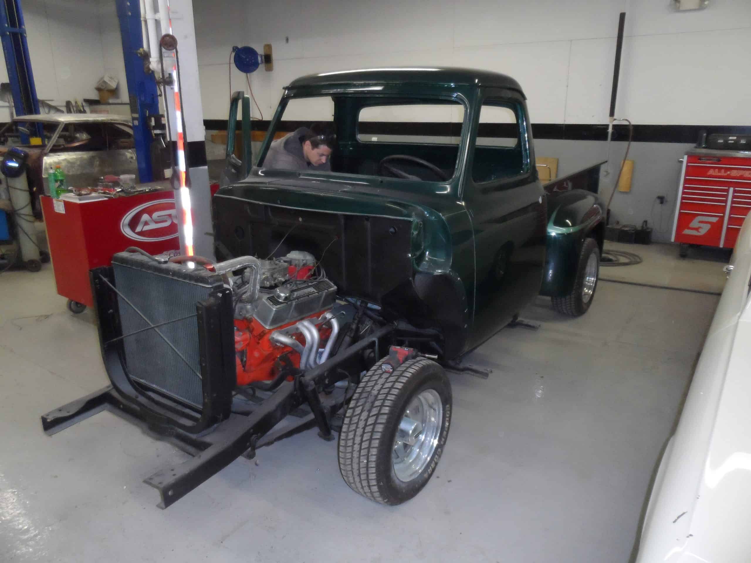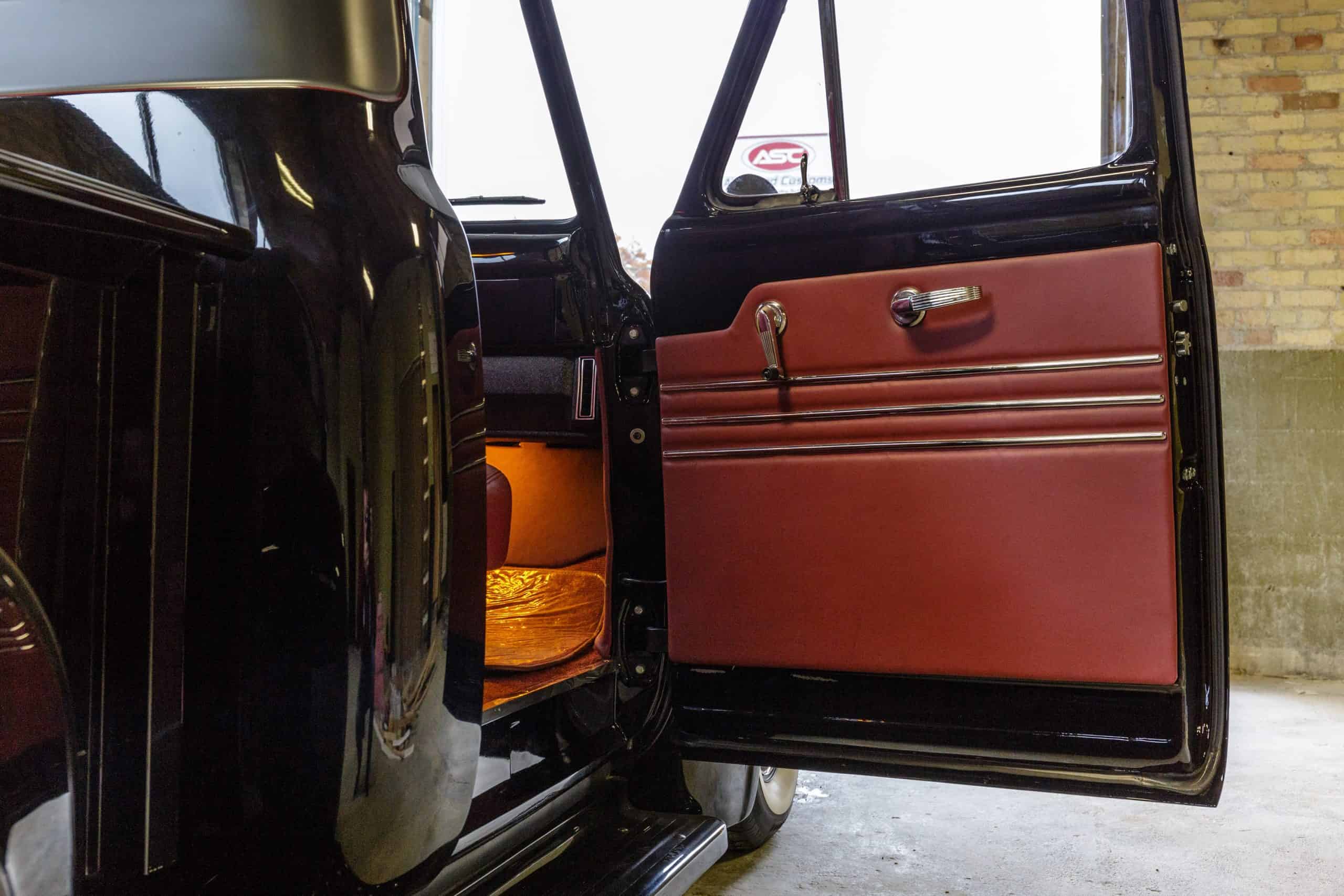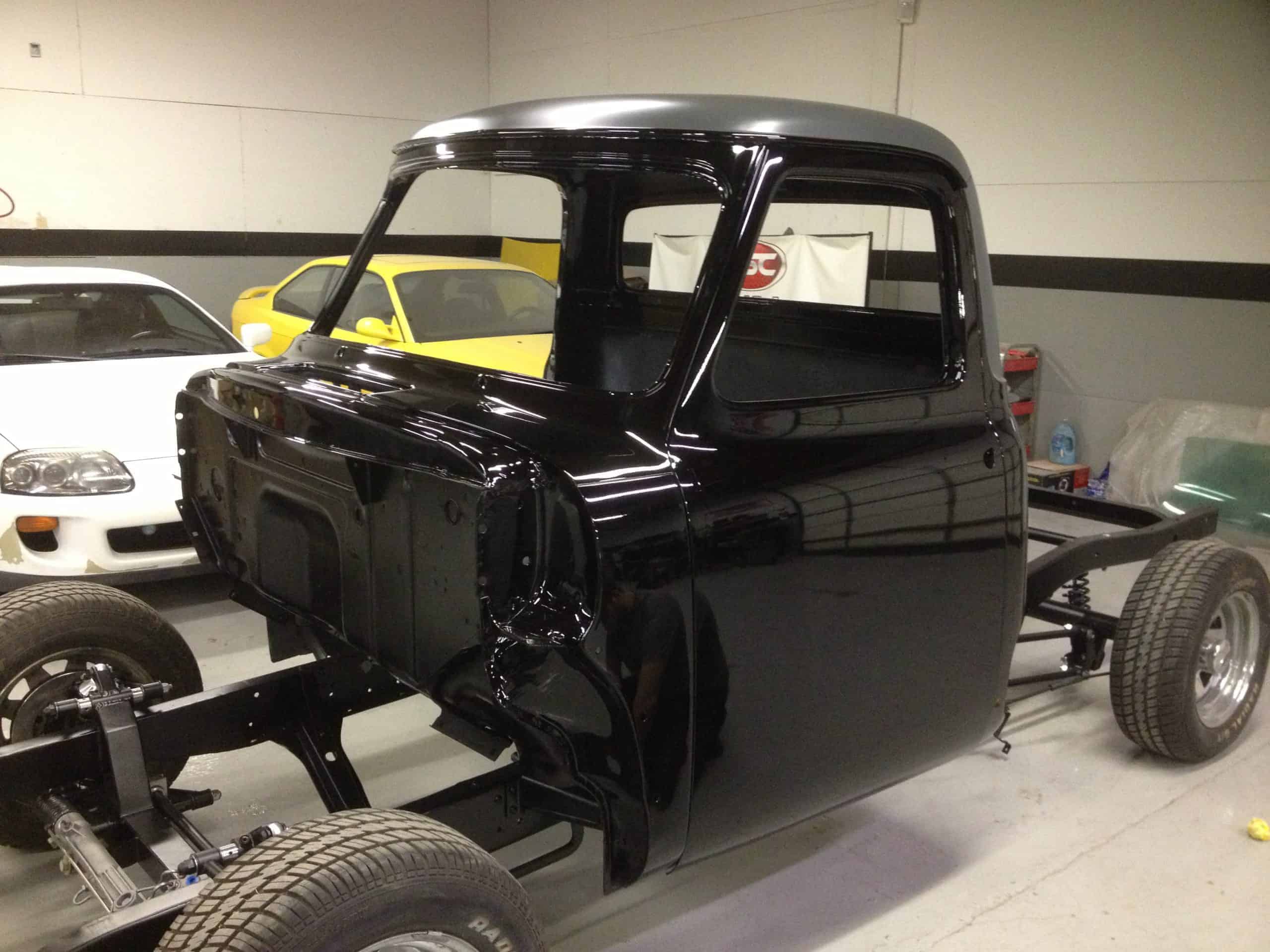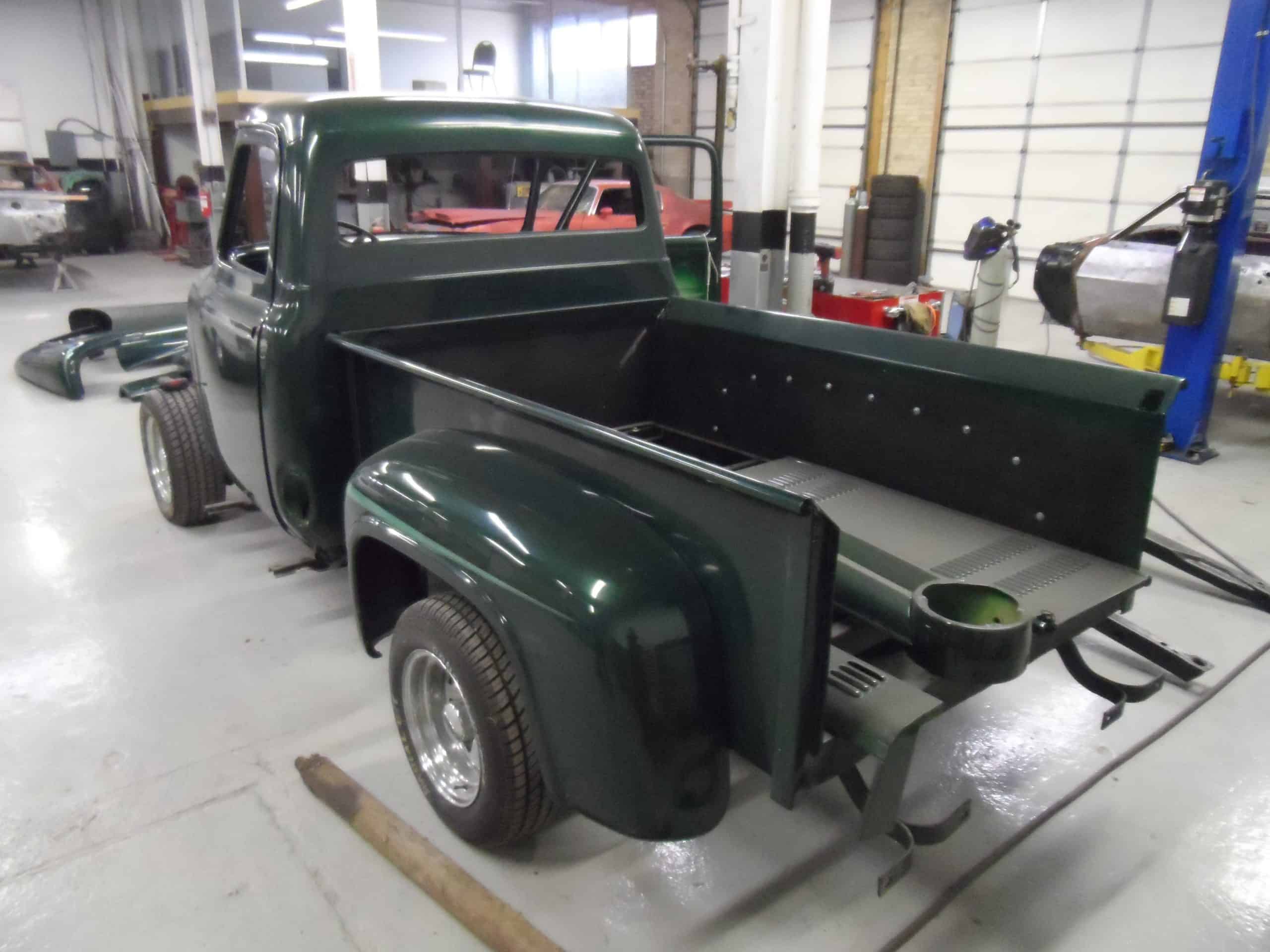 This 1955 Ford F100 pickup was completely rebuilt as a frame-off restoration with a modern Ford 5.0L Coyote V8 engine, rear 4-link suspension, and custom leather interior.