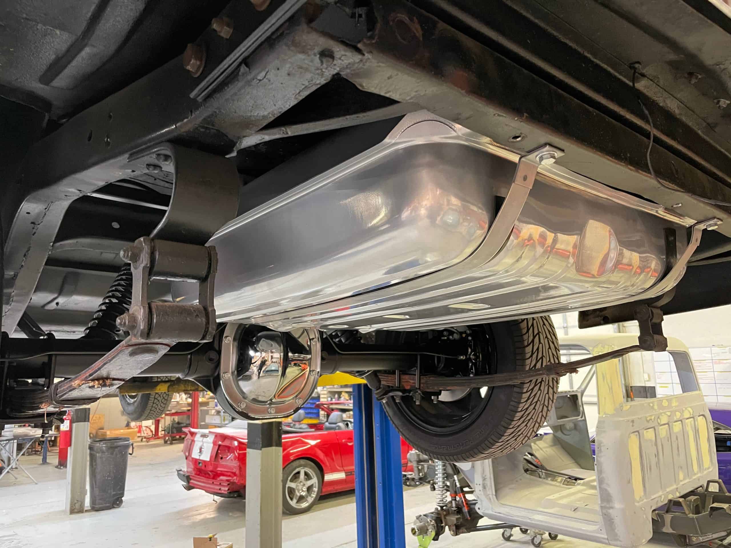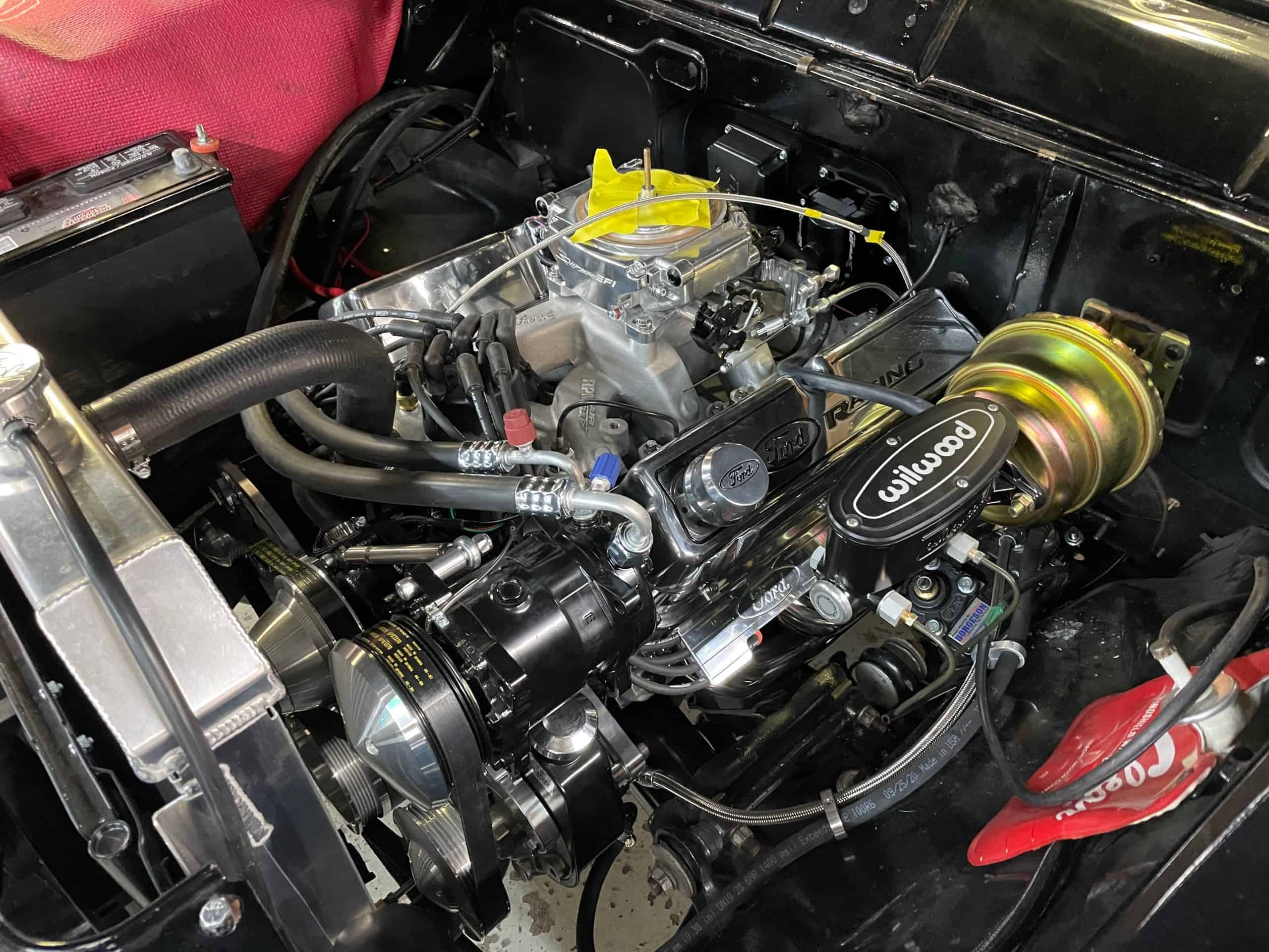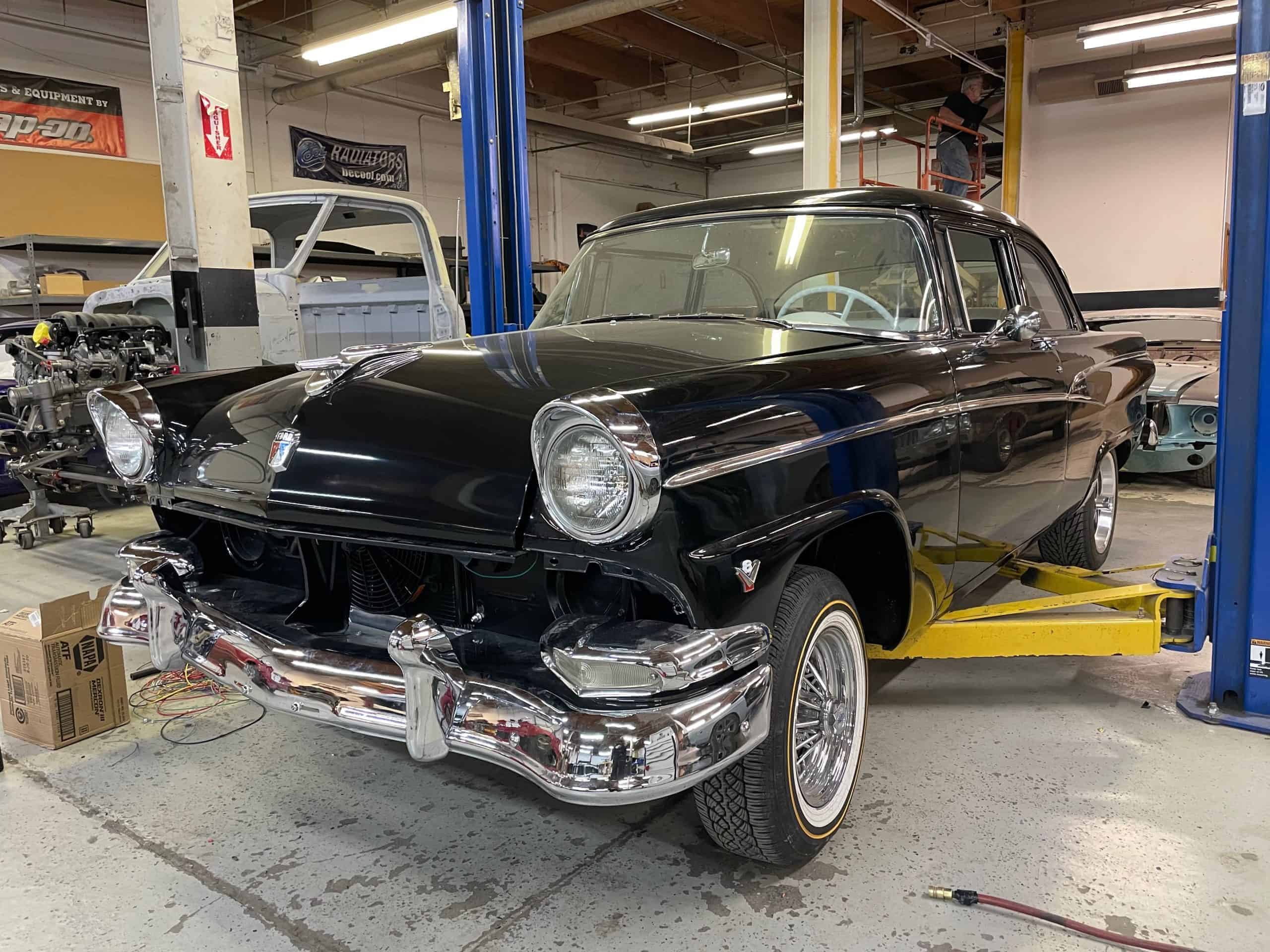 This 56 Ford Custom Line was brought to us for a whole list of performance upgrades. Our goal was to update the car with more power, reliability and the drivability features that will make it a pleasure to drive anywhere. We built a custom 351 cu in V8 with a Comp Cams hydraulic retrofit roller cam, Edelbrock aluminum heads, Holley Sniper fuel injection and much more. The car also features a 8.8″ rear end from Moser, aluminum radiator from BeCool, Wilwood disc brakes, custom built stainless exhaust with Magnaflow mufflers and a new wiring harness from American Autowire