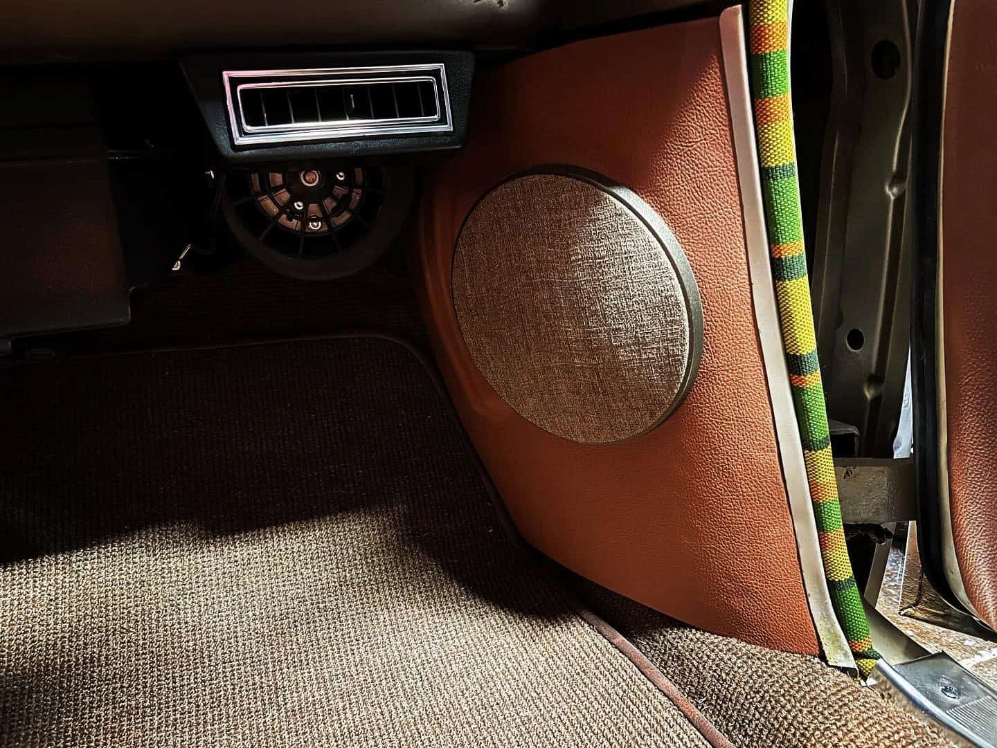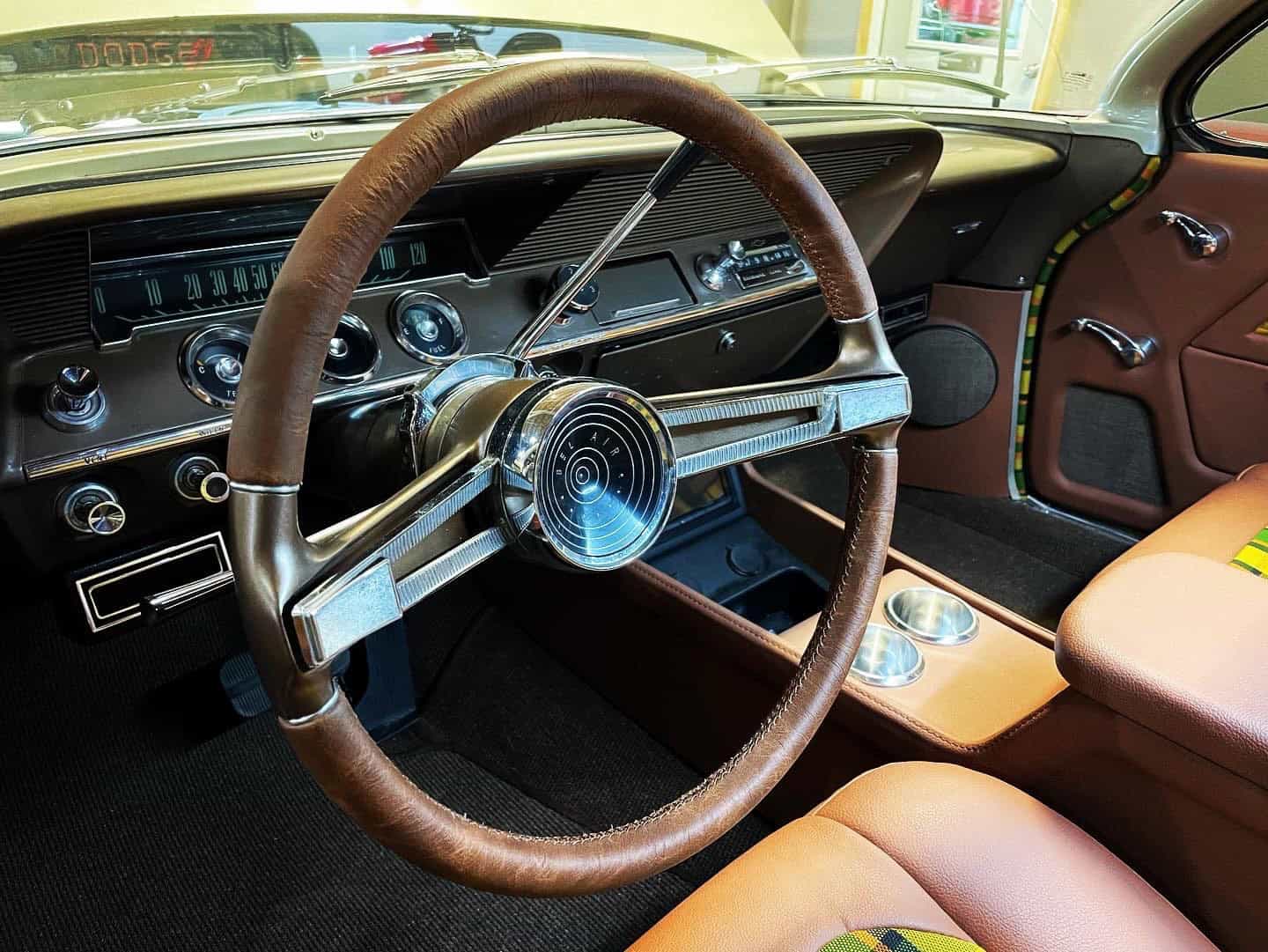 This Chevy Parkwood got a full custom interior from ASC. One-off door panels wrapped in vinyl and accented with Relicate leathers plaid cloth, 3d printed arm rests, door handle and window cranks from Billet Specialties, a custom center console, Kenwood deck, custom seats using factory frames and custom shaping foam with ASC-made custom wraps, a custom headliner and custom rear close-out panels and floor.