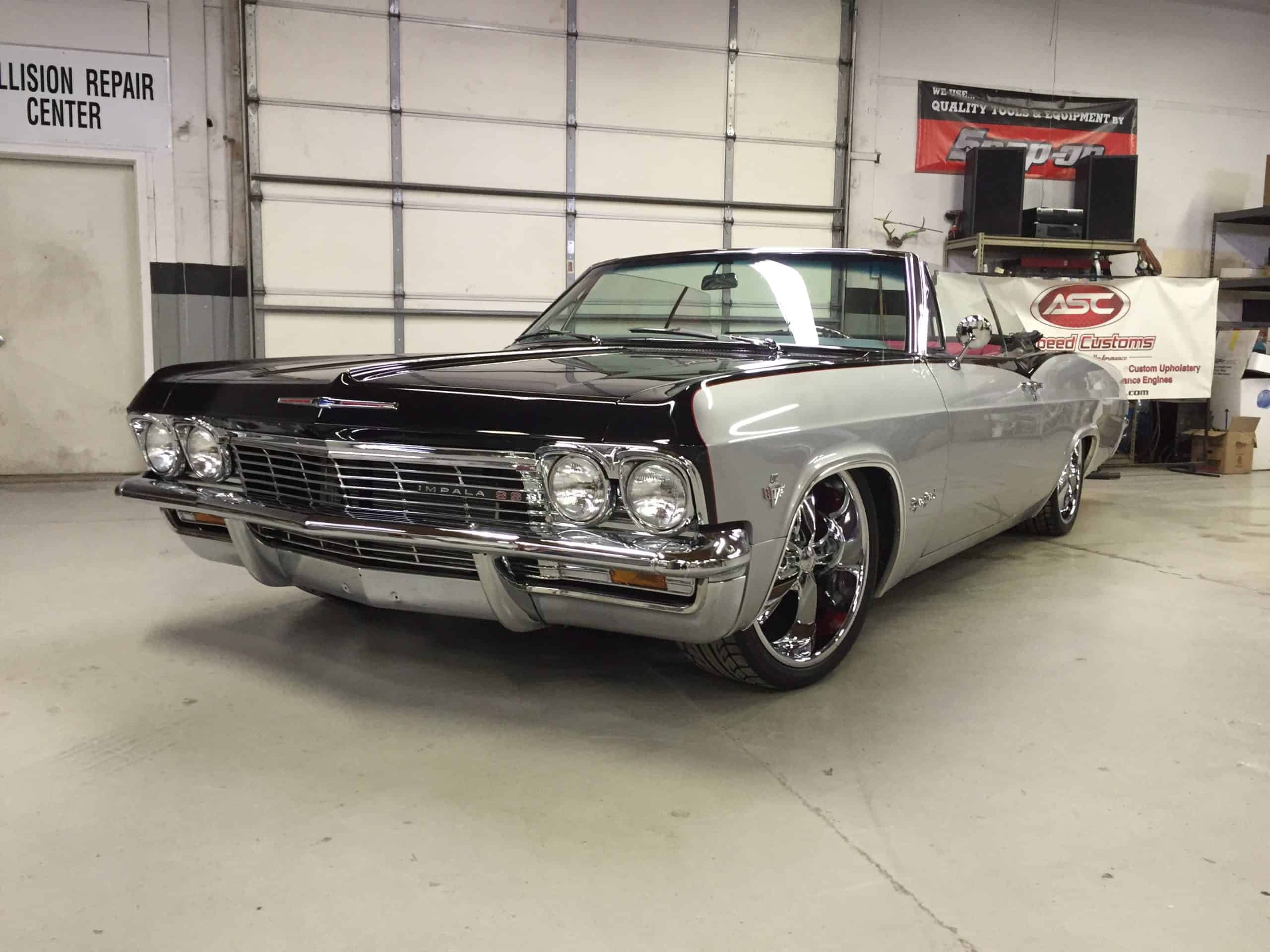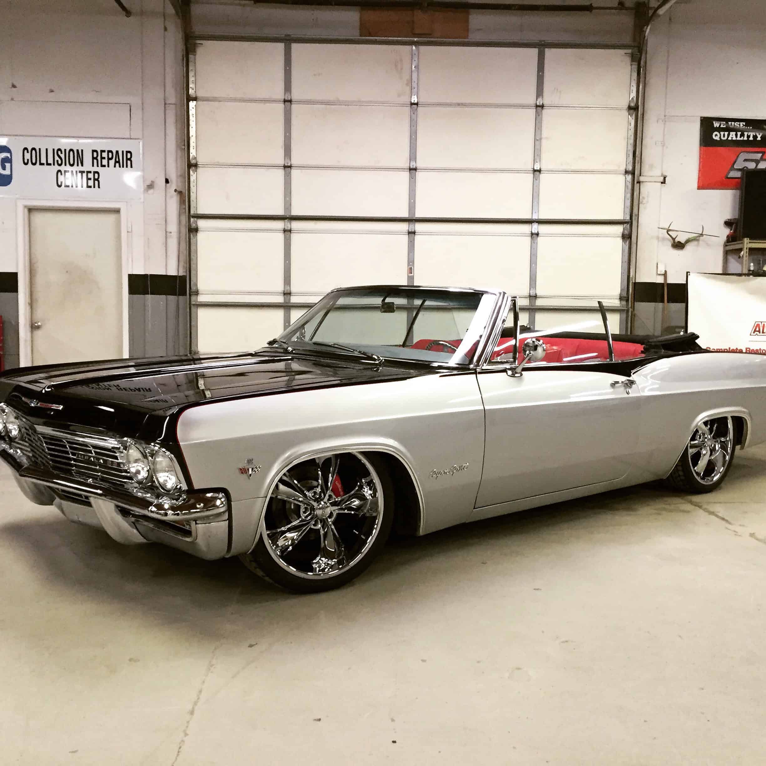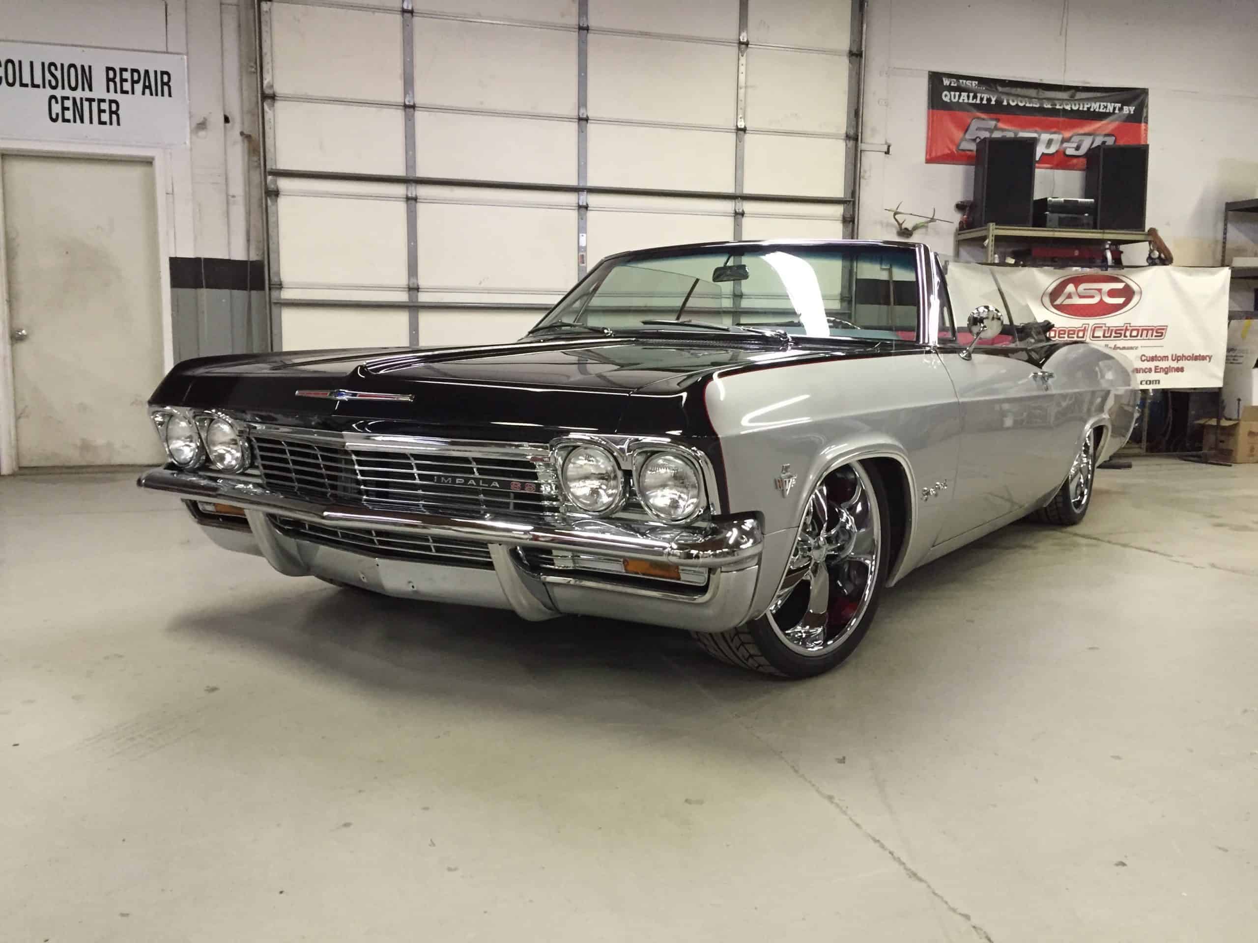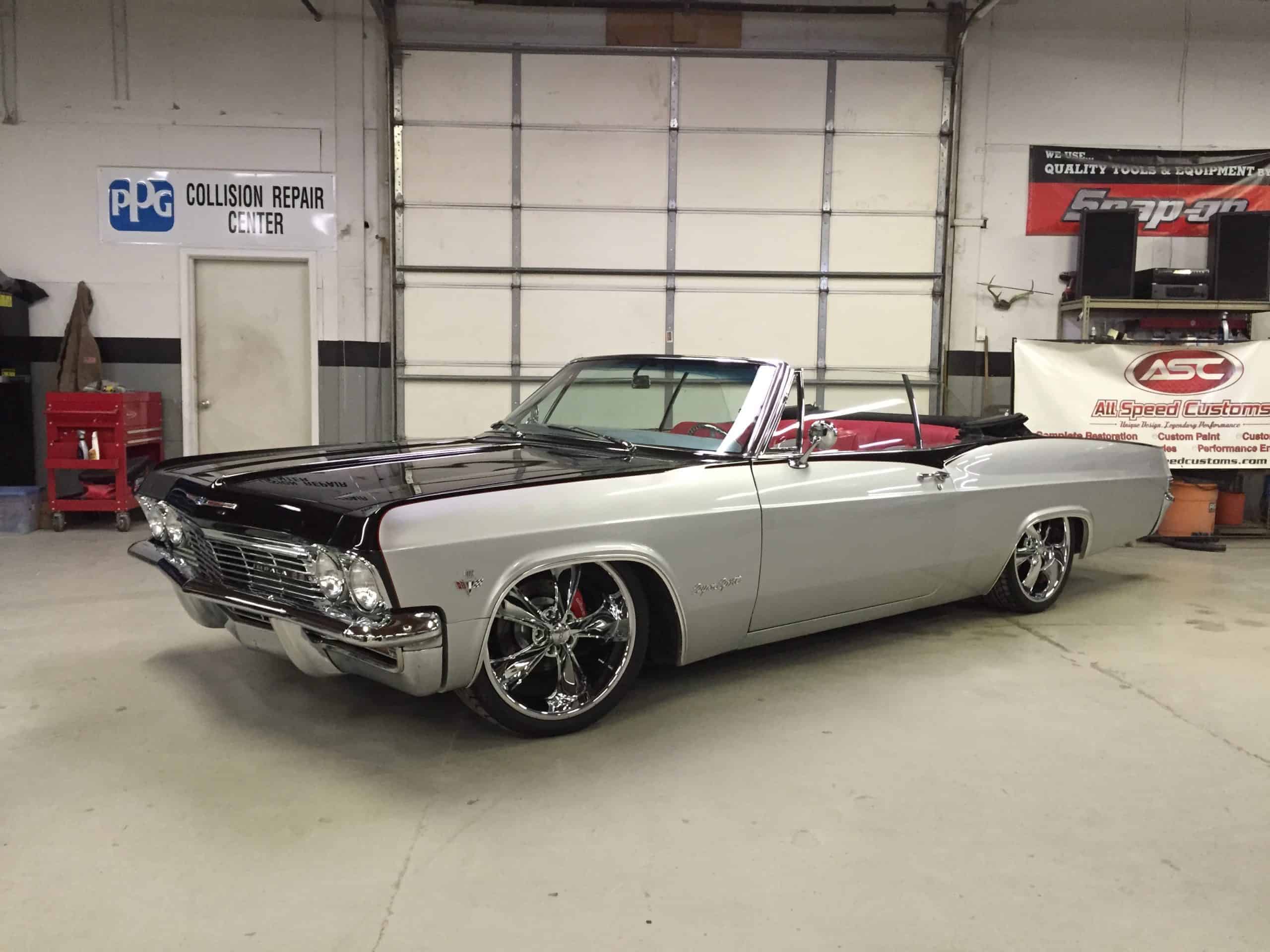 This 1965 Impala features a full restoration with a 480 hp LS V8, Ridetech air ride suspension, Wilwood disc brakes, custom two tone PPG paint and a full custom interior