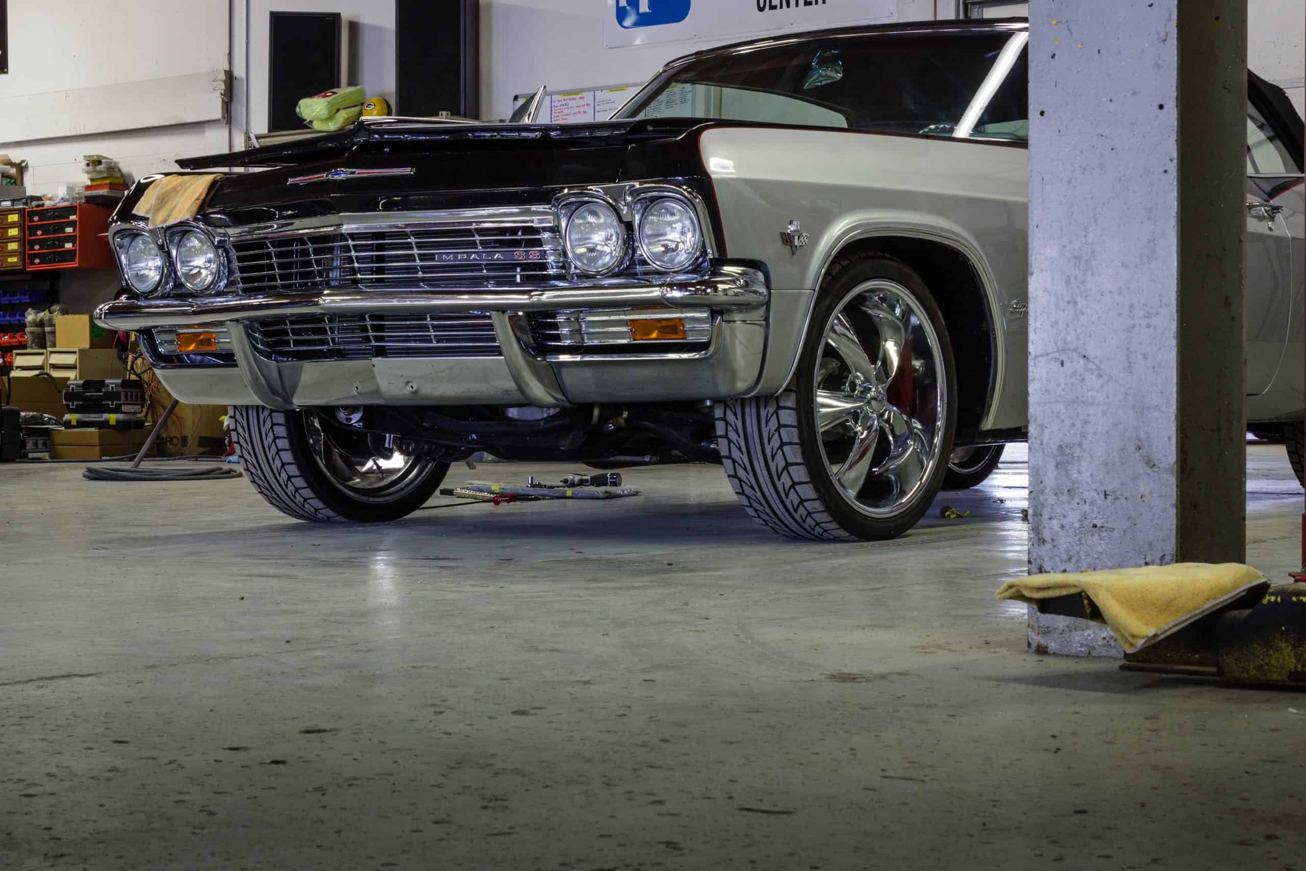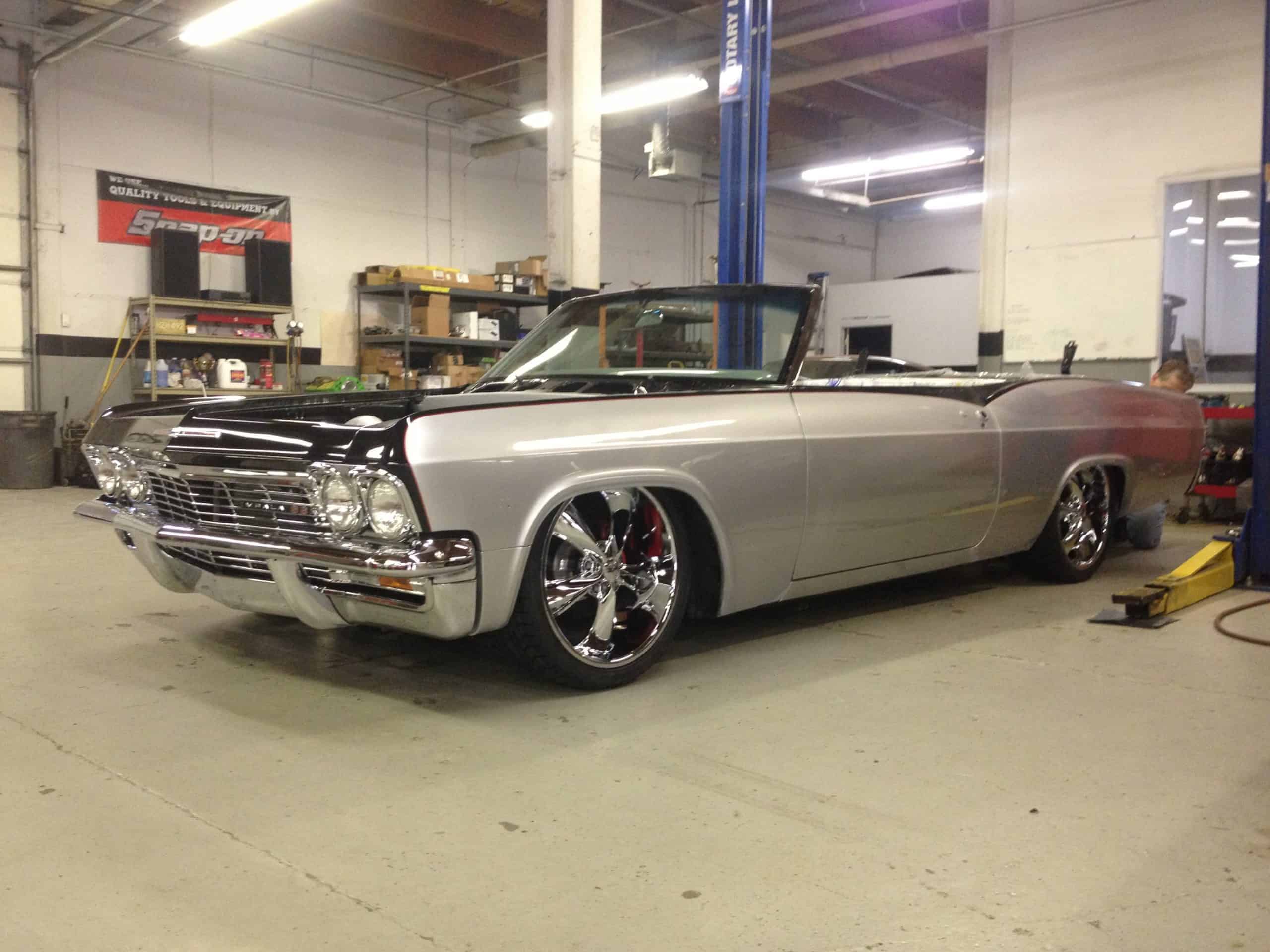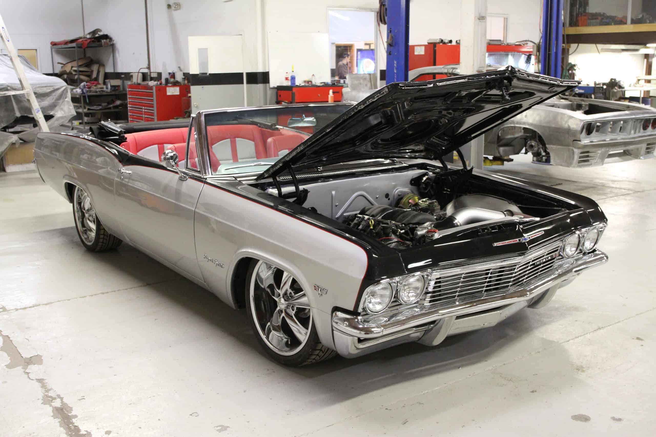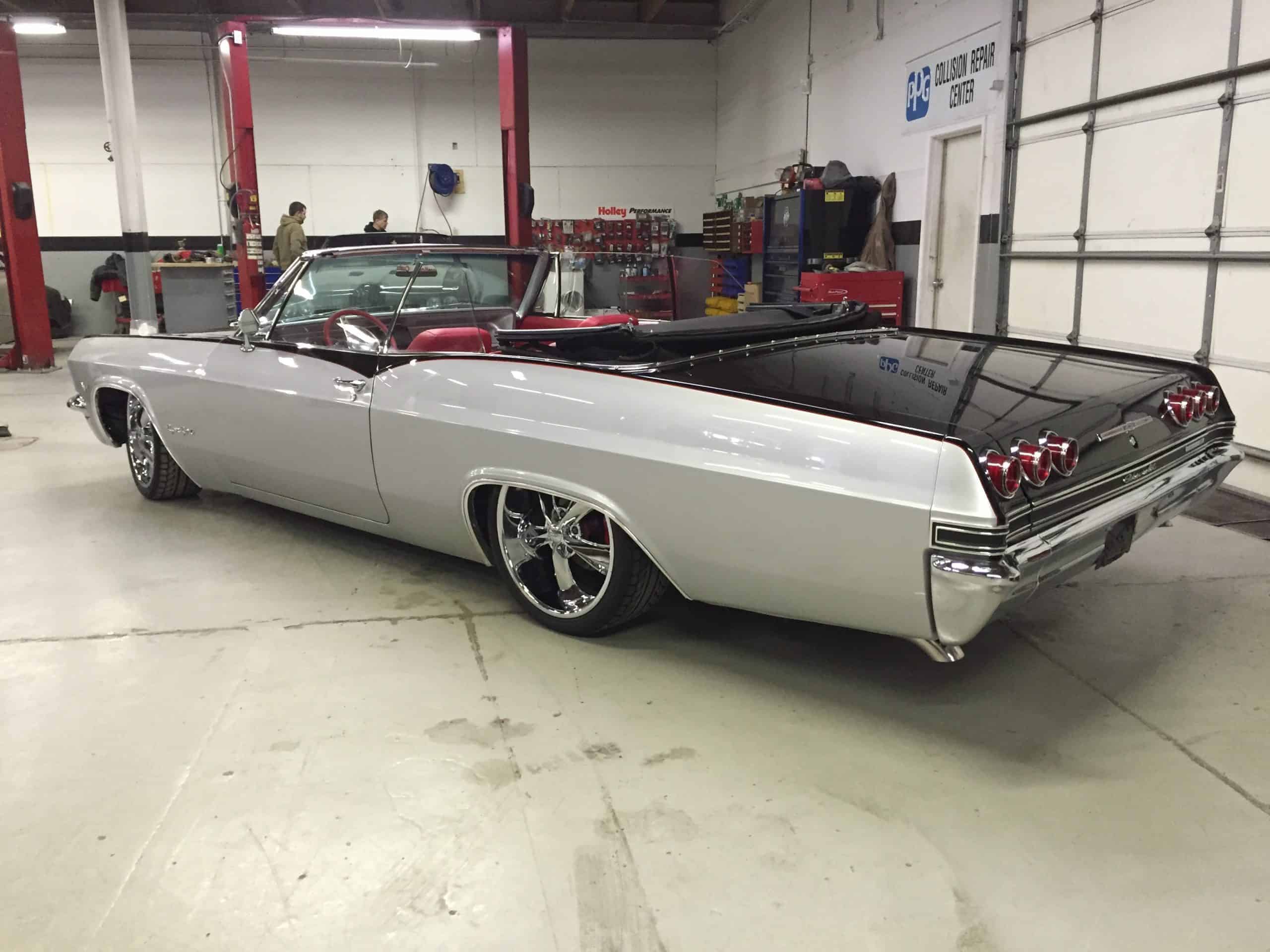 This 1965 Impala features a full restoration with a 480 hp LS V8, Ridetech air ride suspension, Wilwood disc brakes, custom two tone PPG paint and a full custom interior