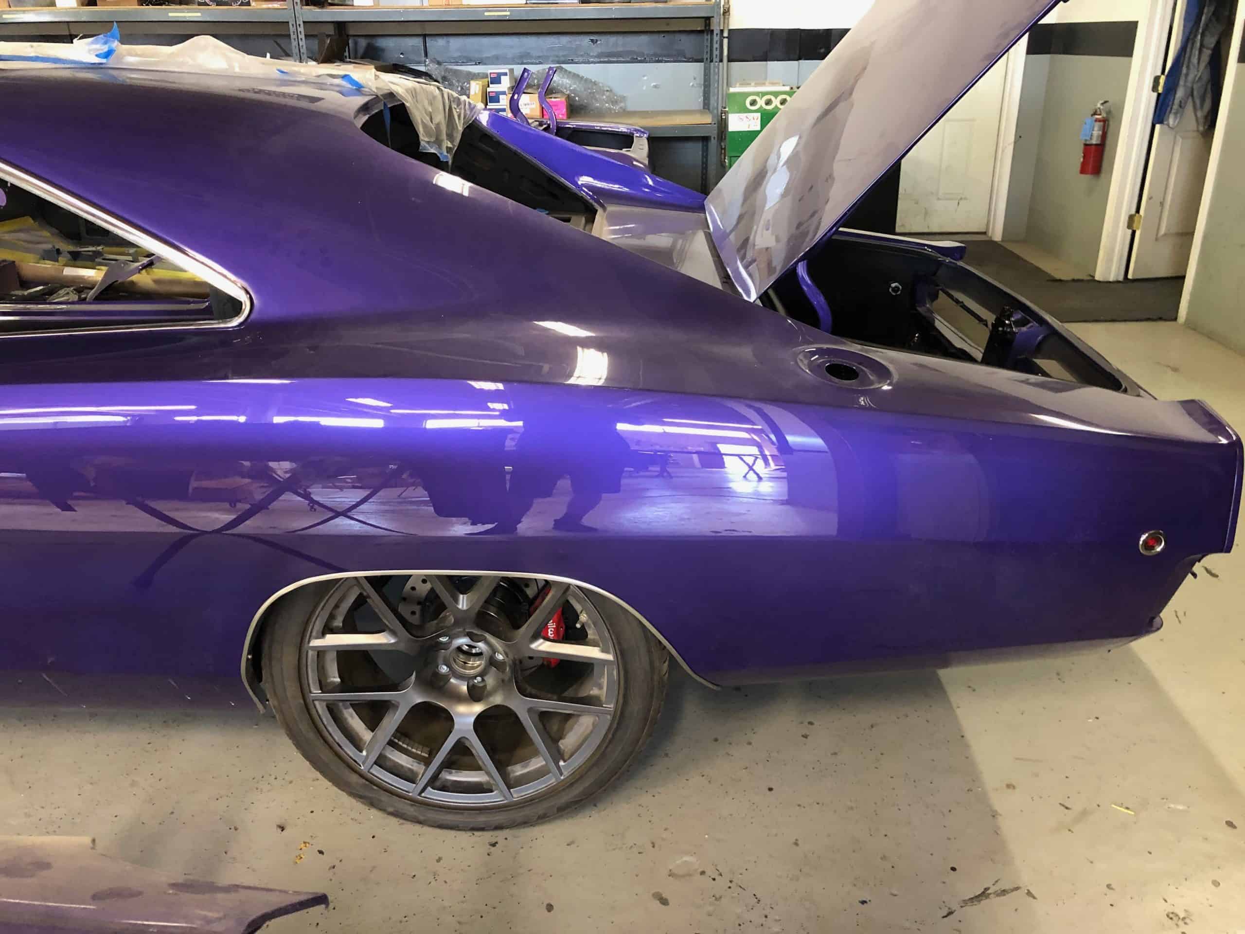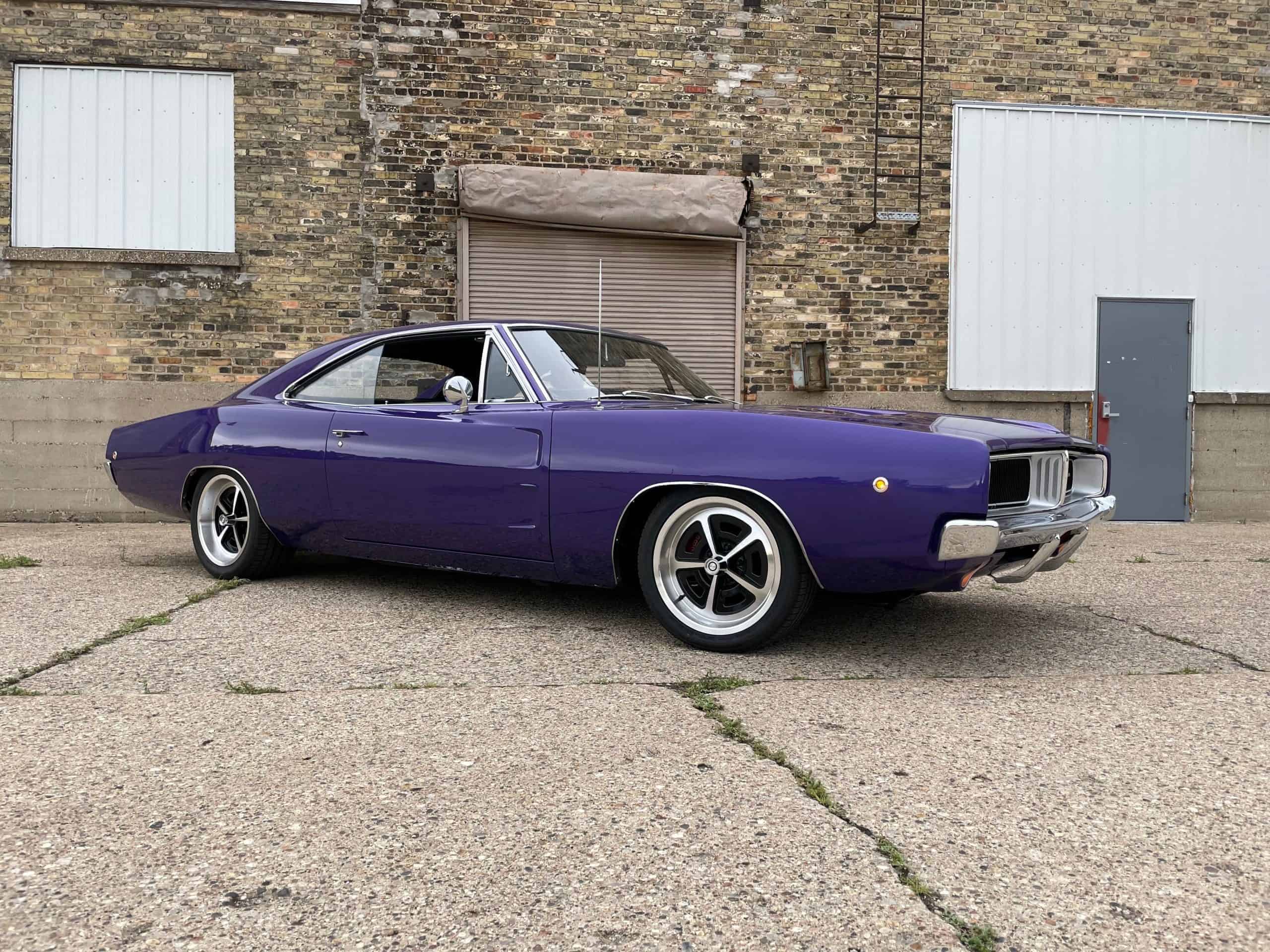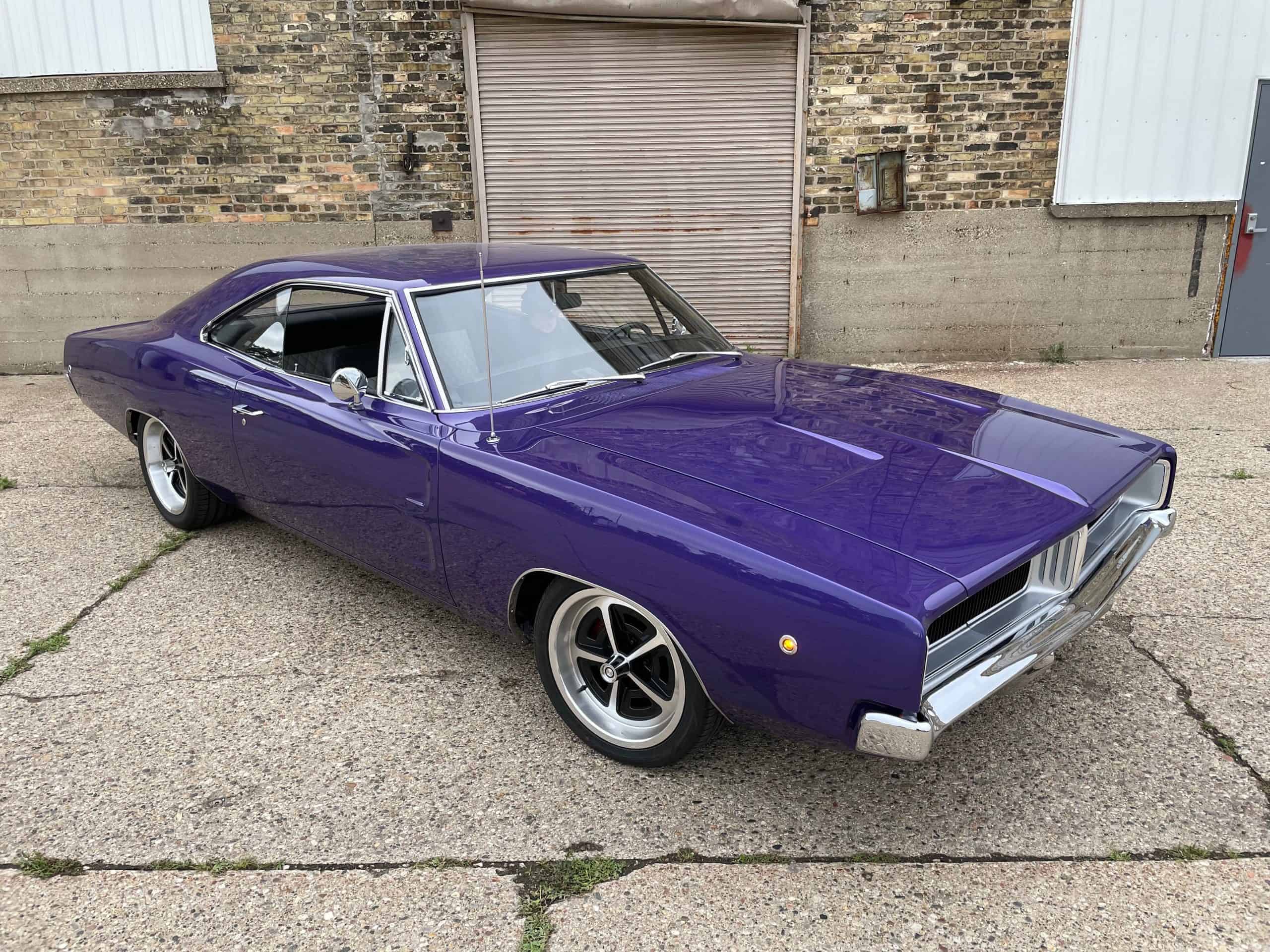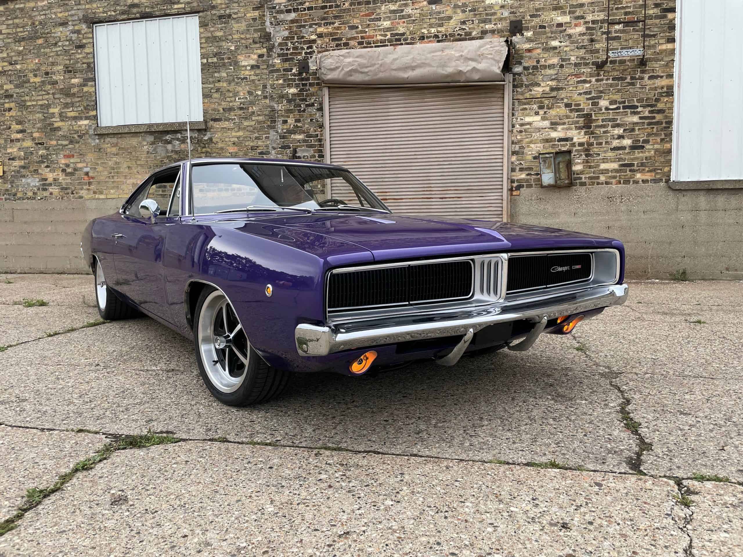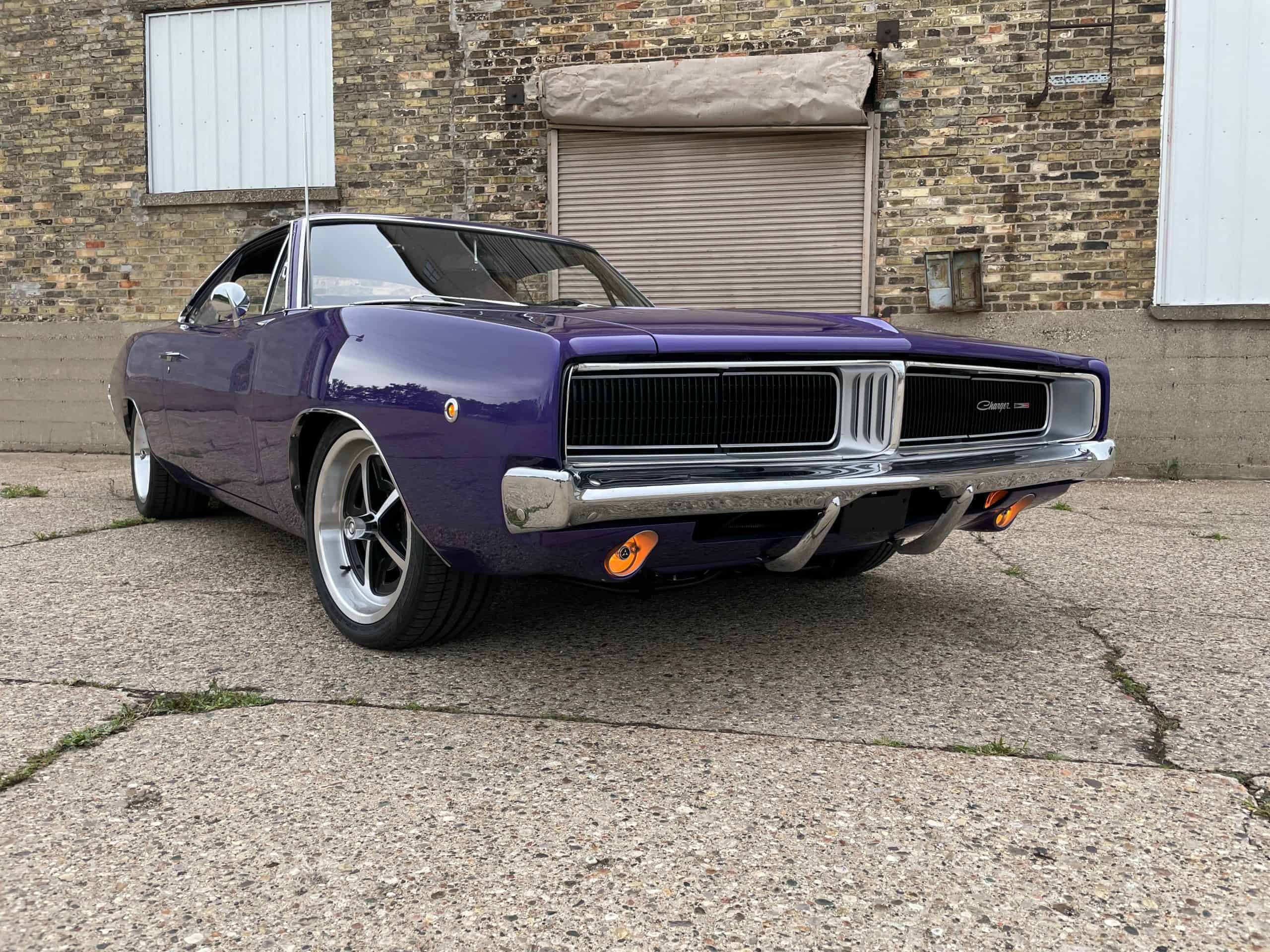 1968 Charger Restomod complete with a 6.4 L Gen IV Hemi, Ridetech air ride suspension, Wilwood disc brakes BASF Glasurit Plum Crazy paint and a full custom interior