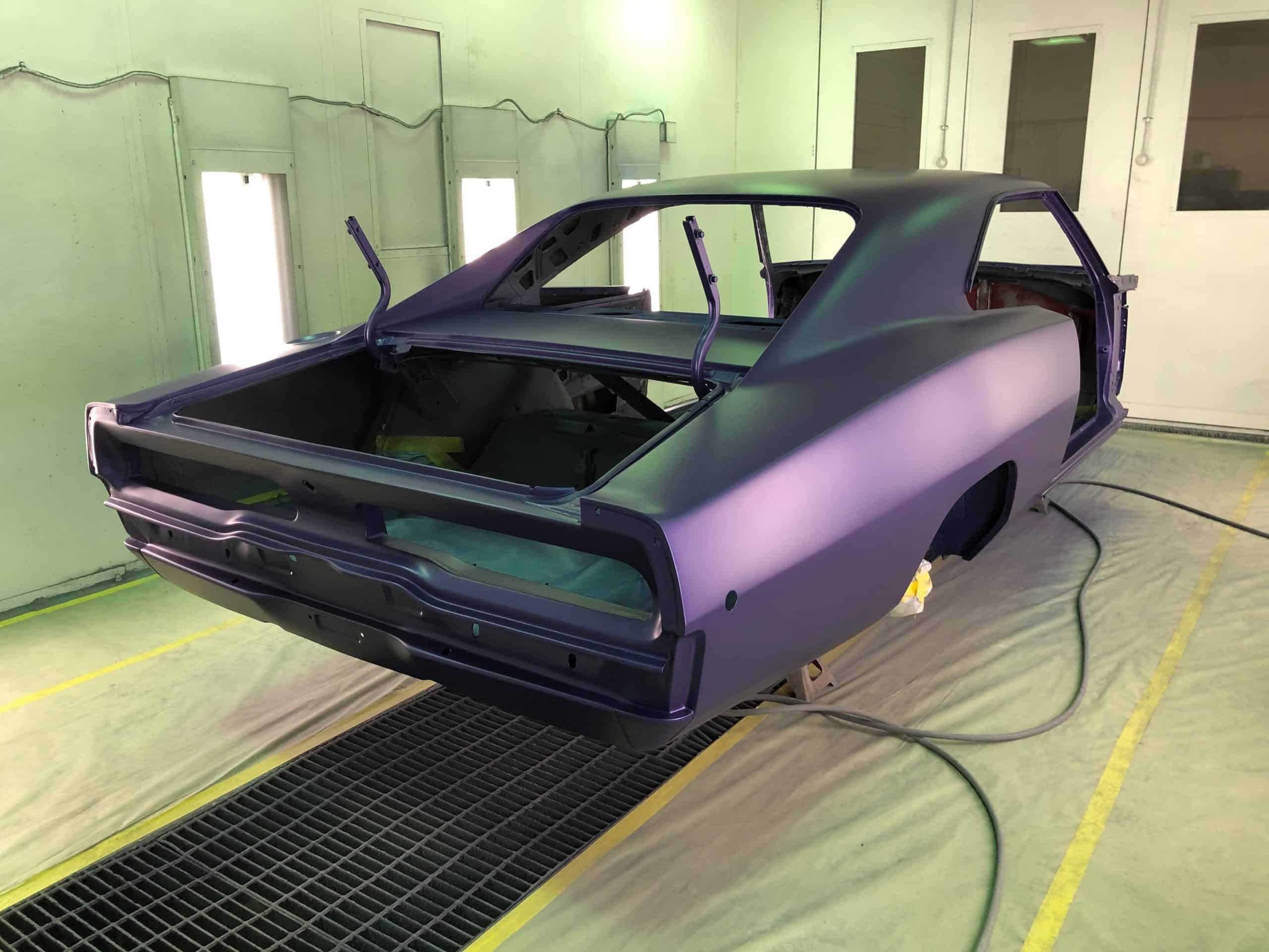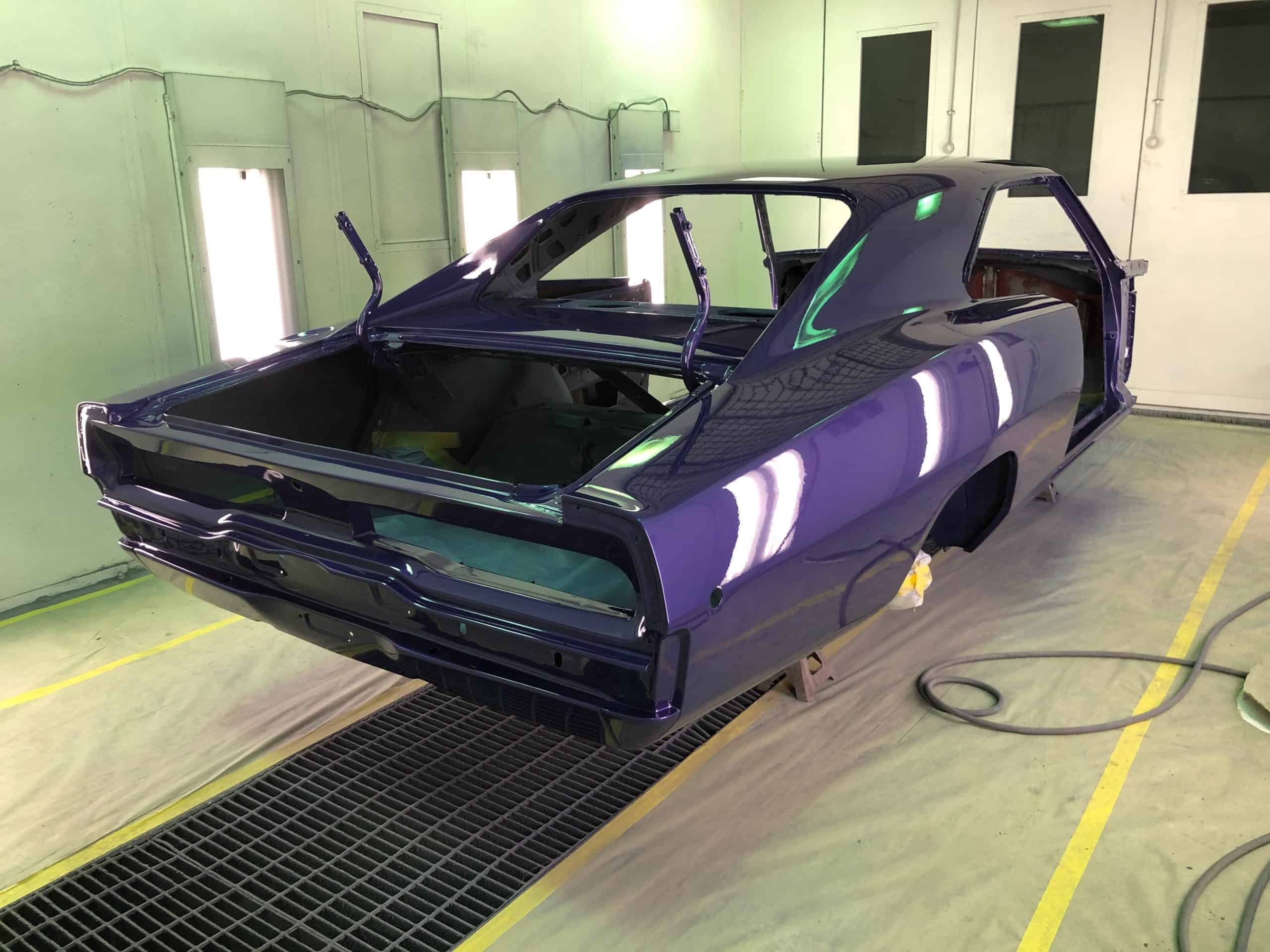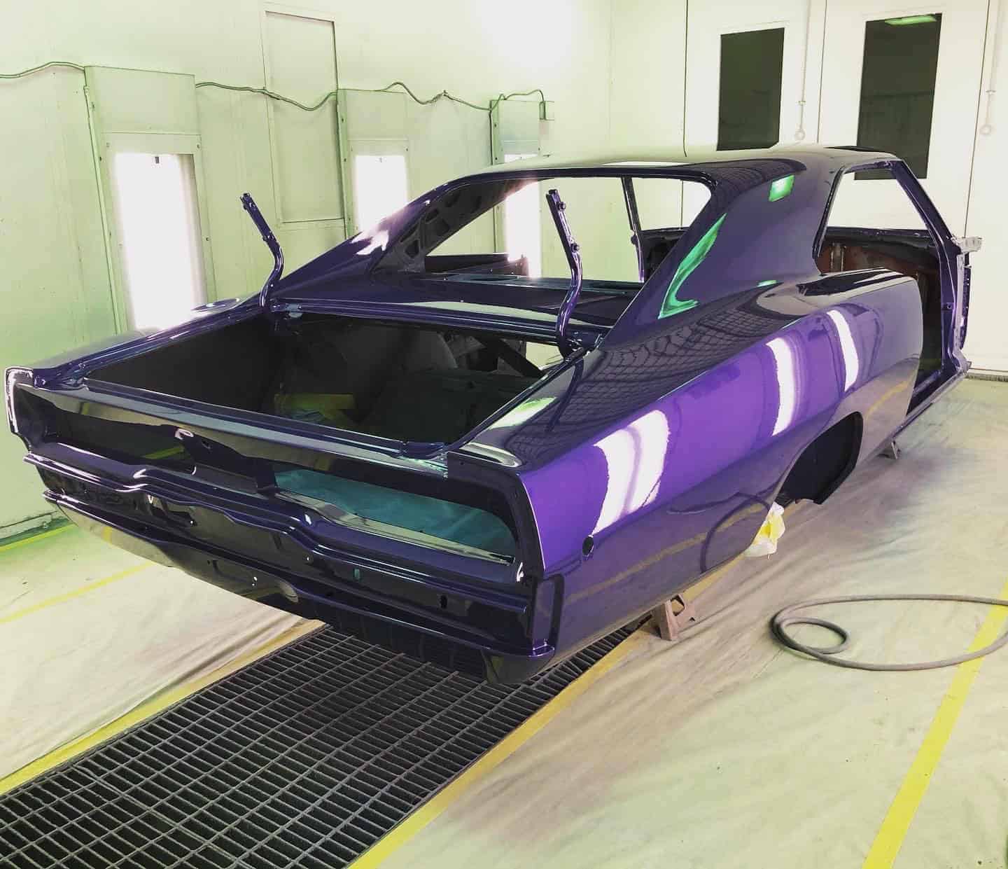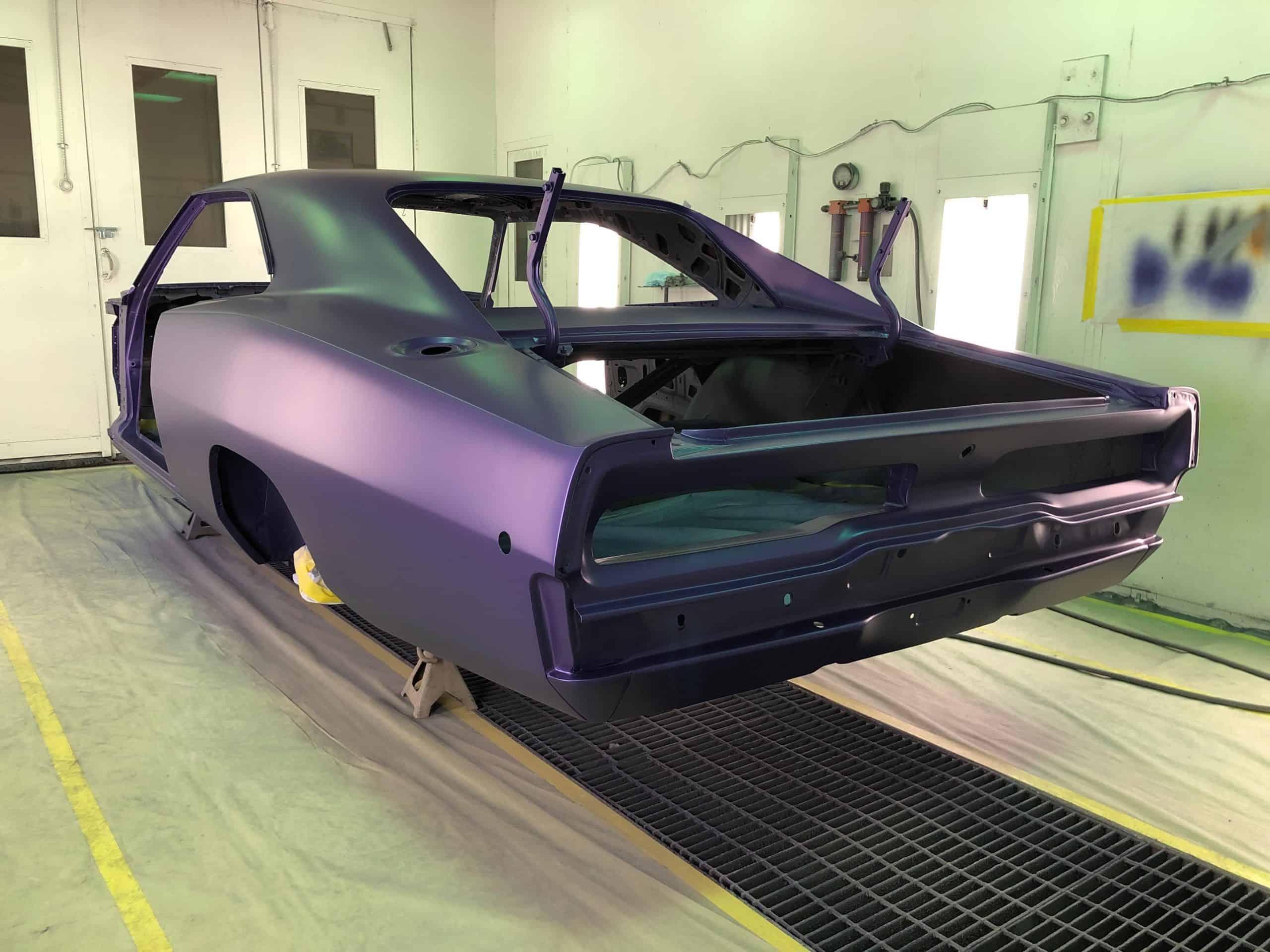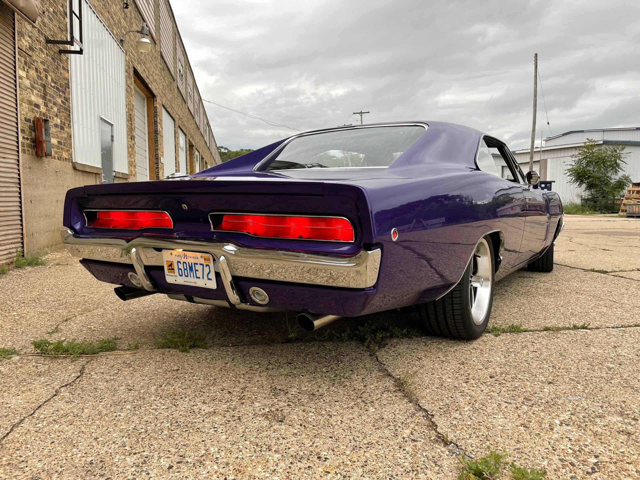 1968 Charger Restomod complete with a 6.4 L Gen IV Hemi, Ridetech air ride suspension, Wilwood disc brakes BASF Glasurit Plum Crazy paint and a full custom interior