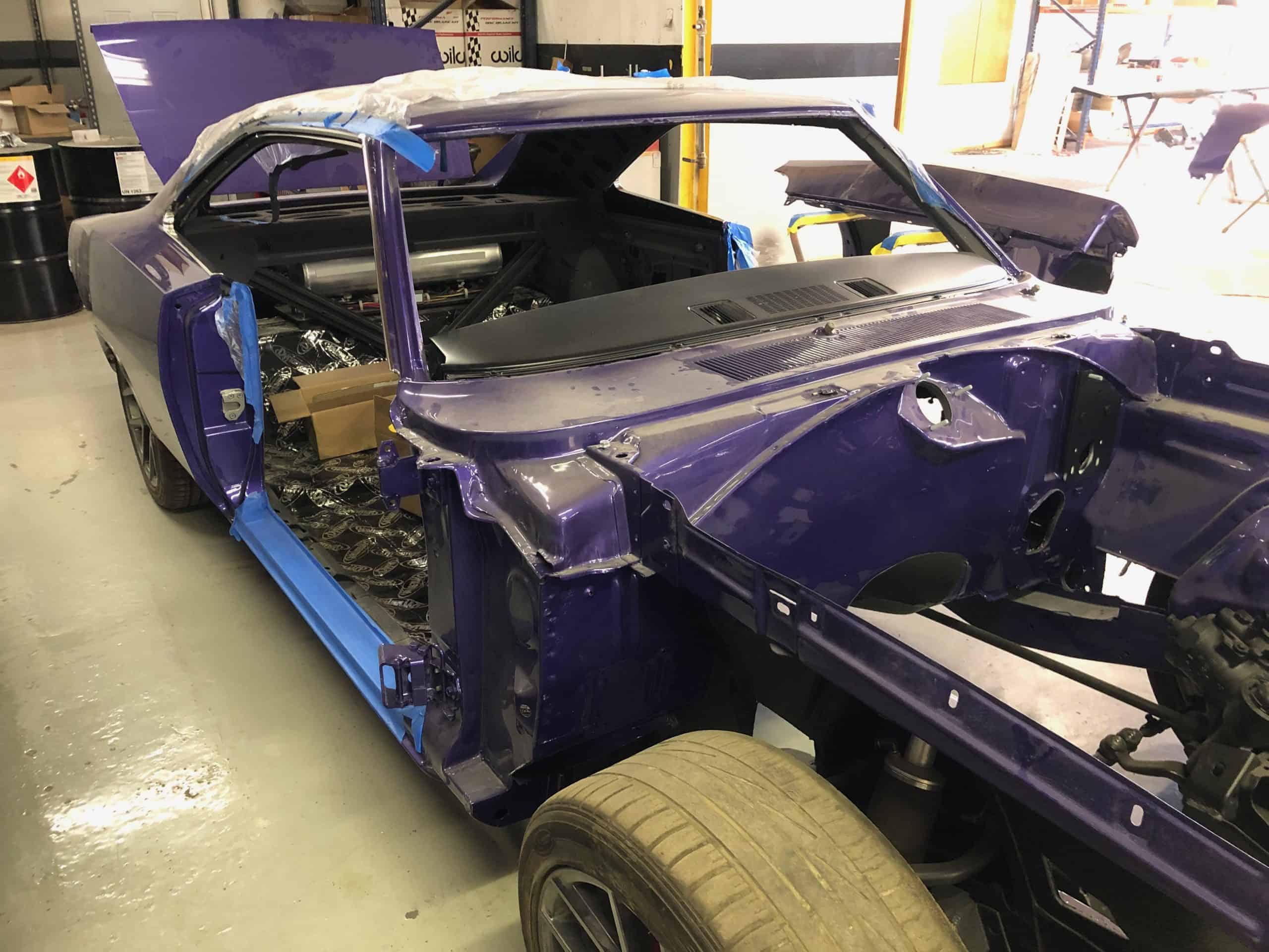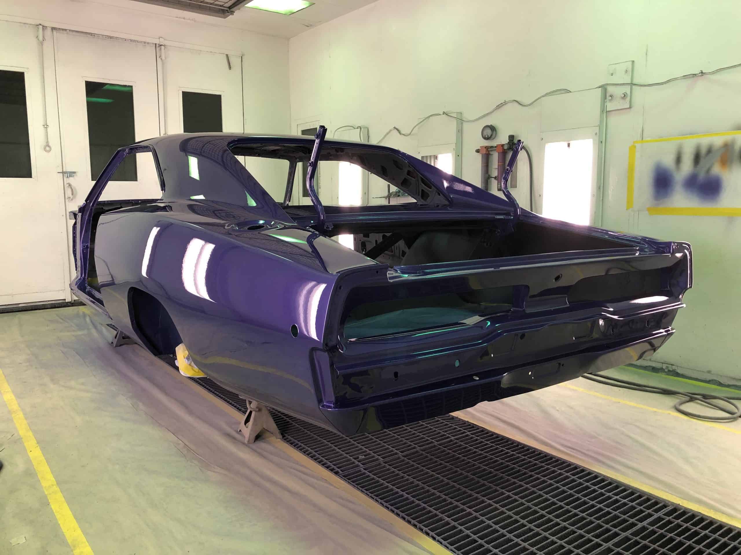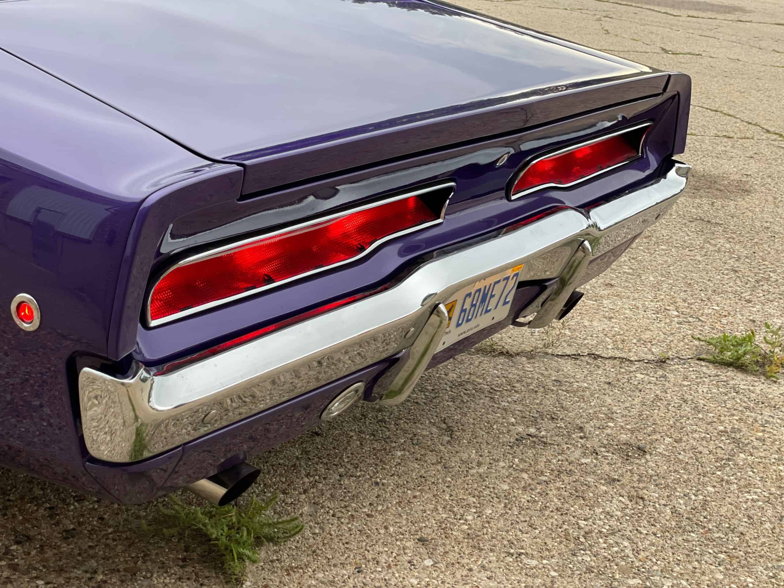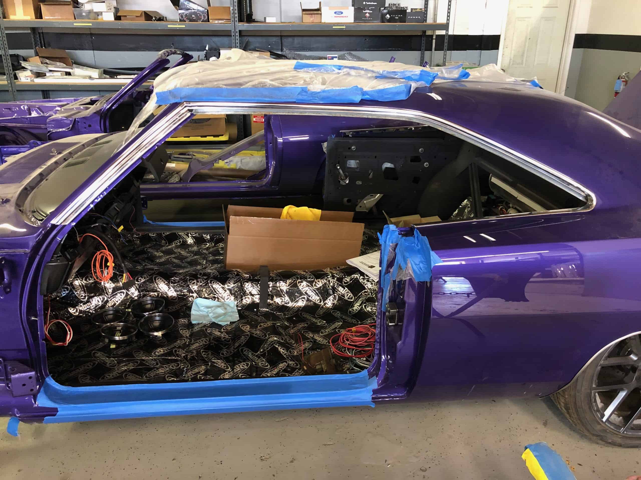 1968 Charger Restomod complete with a 6.4 L Gen IV Hemi, Ridetech air ride suspension, Wilwood disc brakes BASF Glasurit Plum Crazy paint and a full custom interior