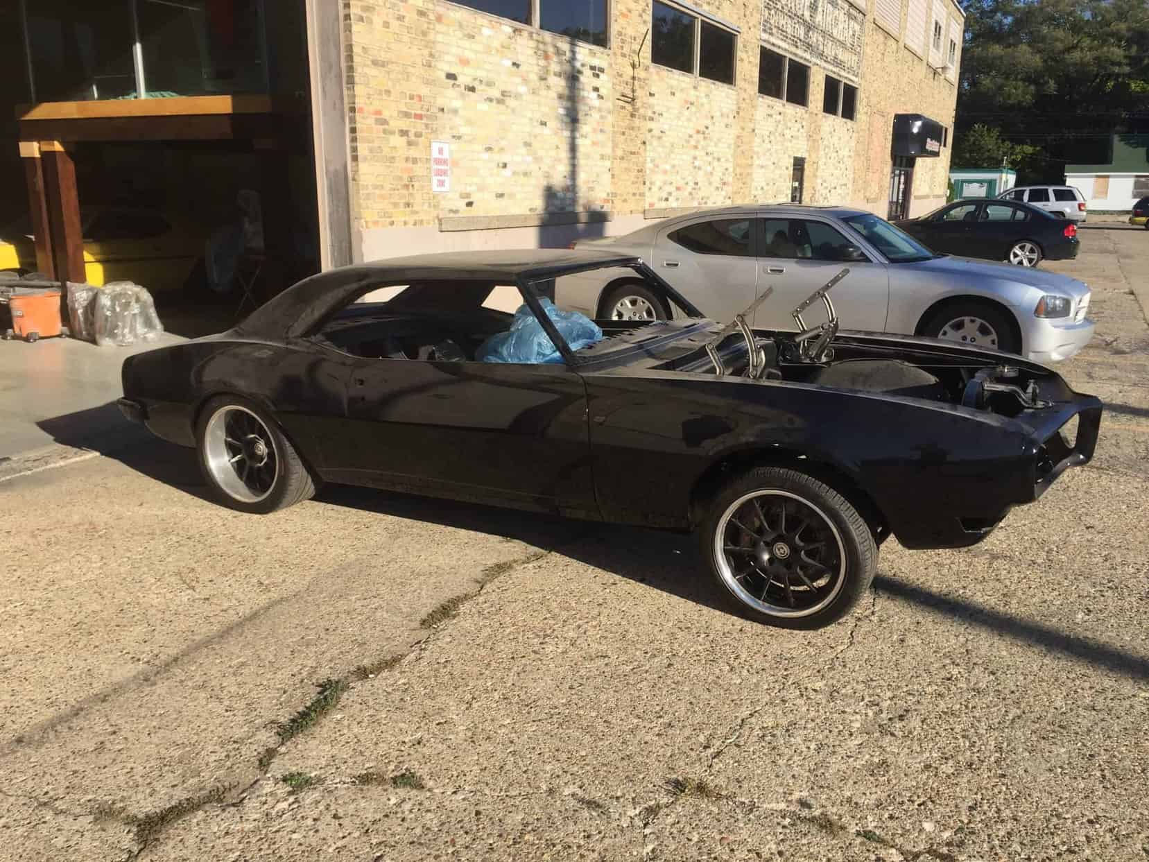 This is a 1968 Firebird, delivered to All Speed Customs for modification and finishing, including paint touchup and new clearcoat, suspension upgrades, HRE wheels over Baer brakes, and an LS3 V8 with 6-speed manual, as well as fully redone interior.