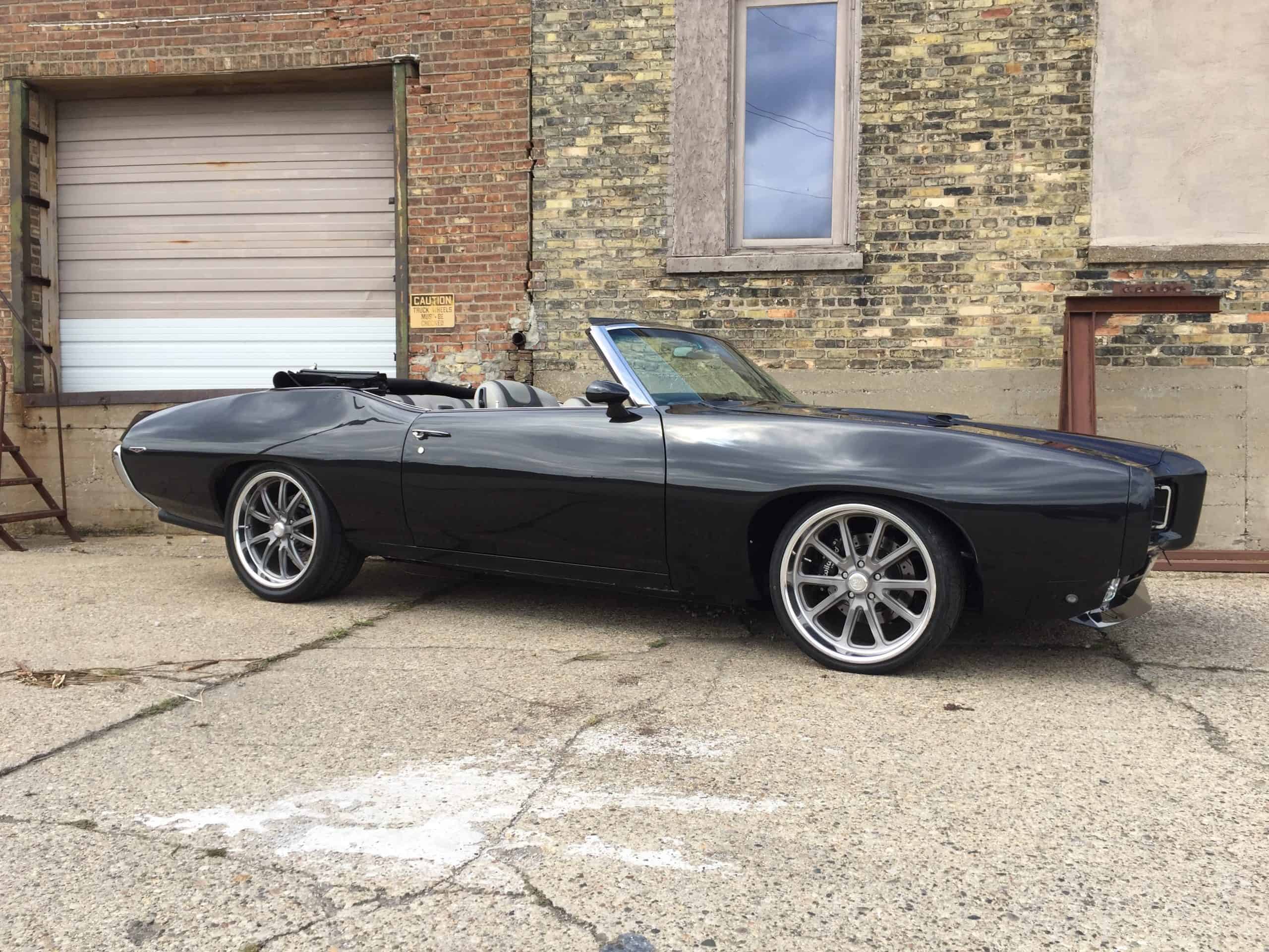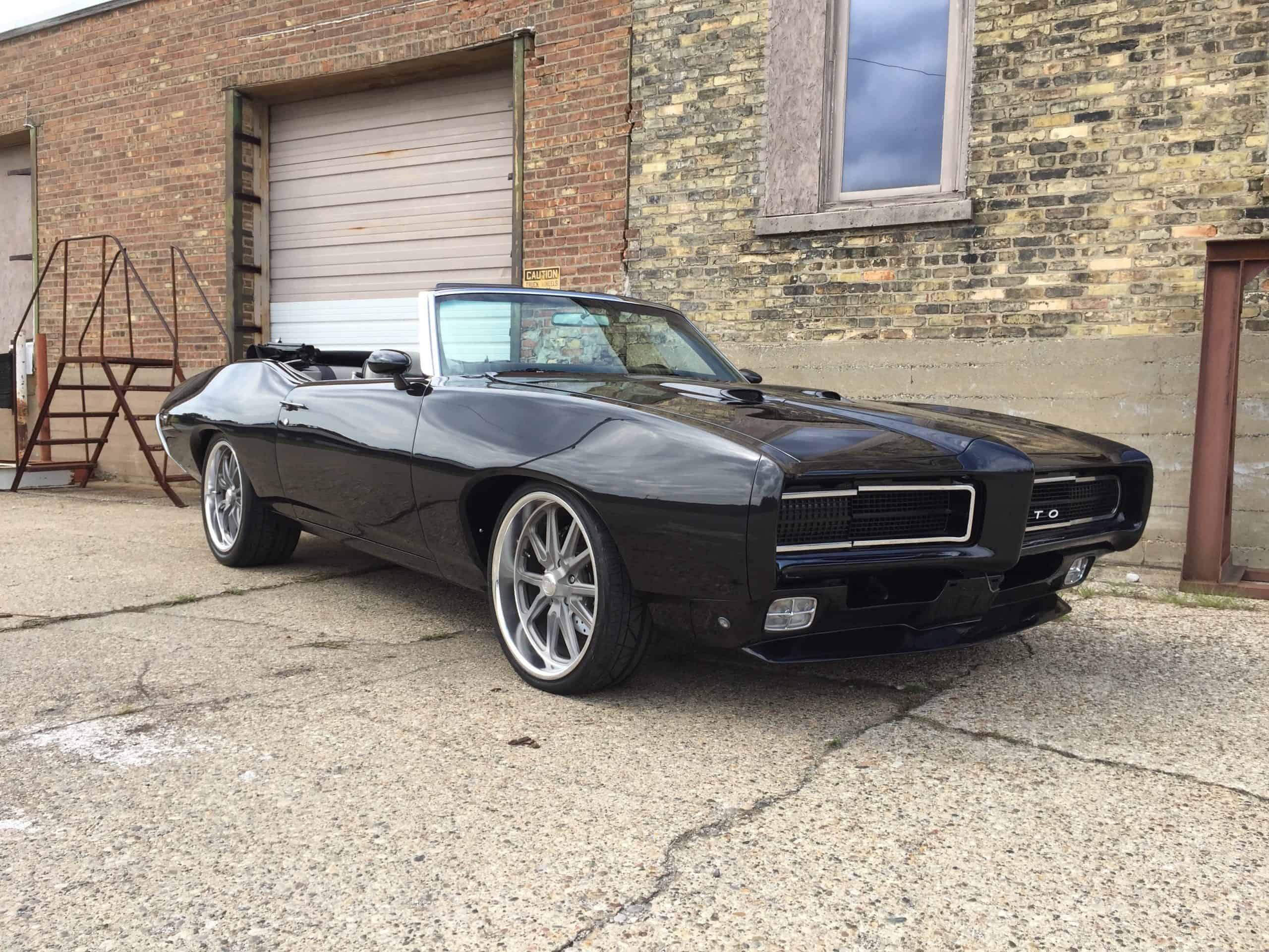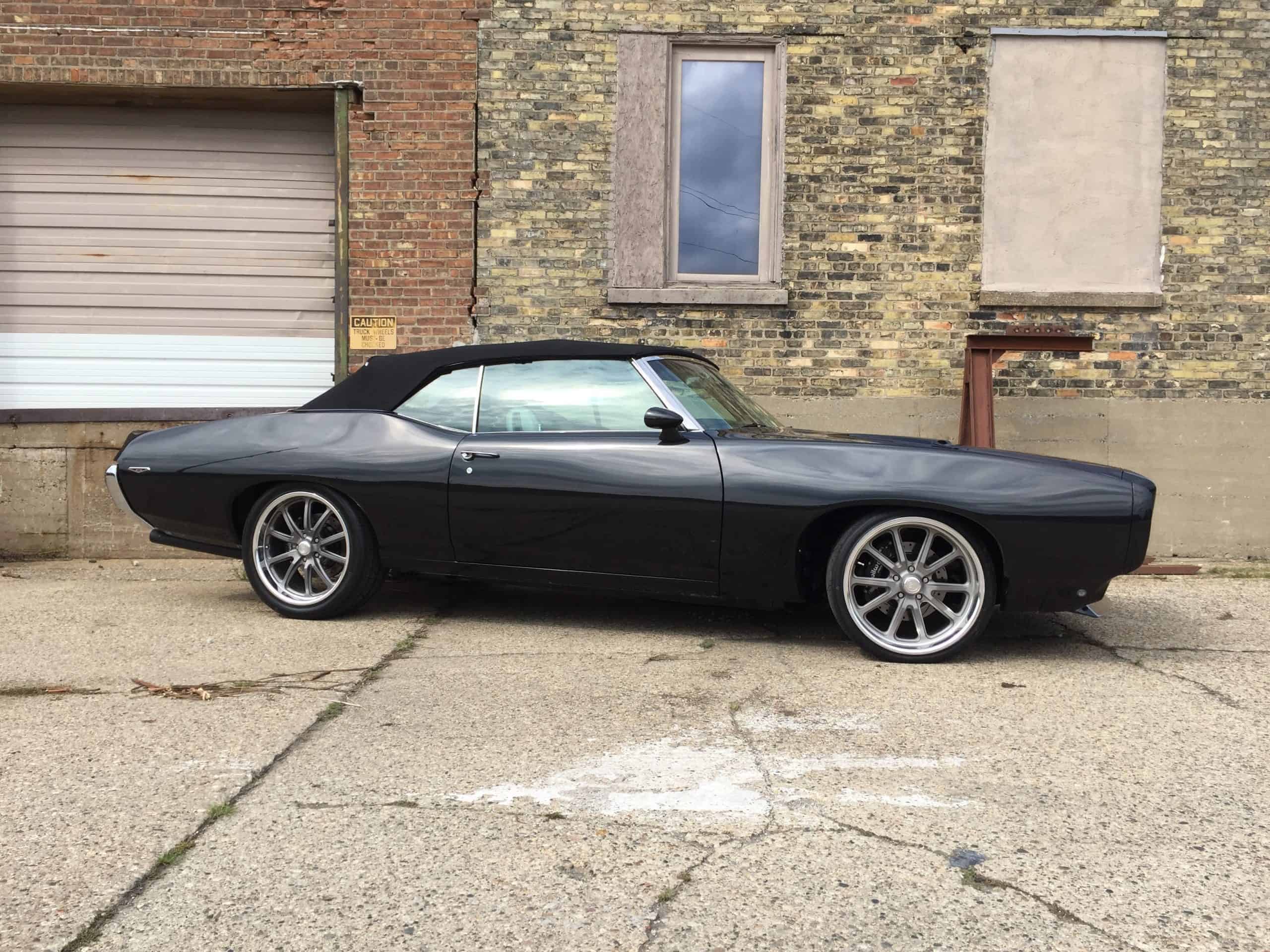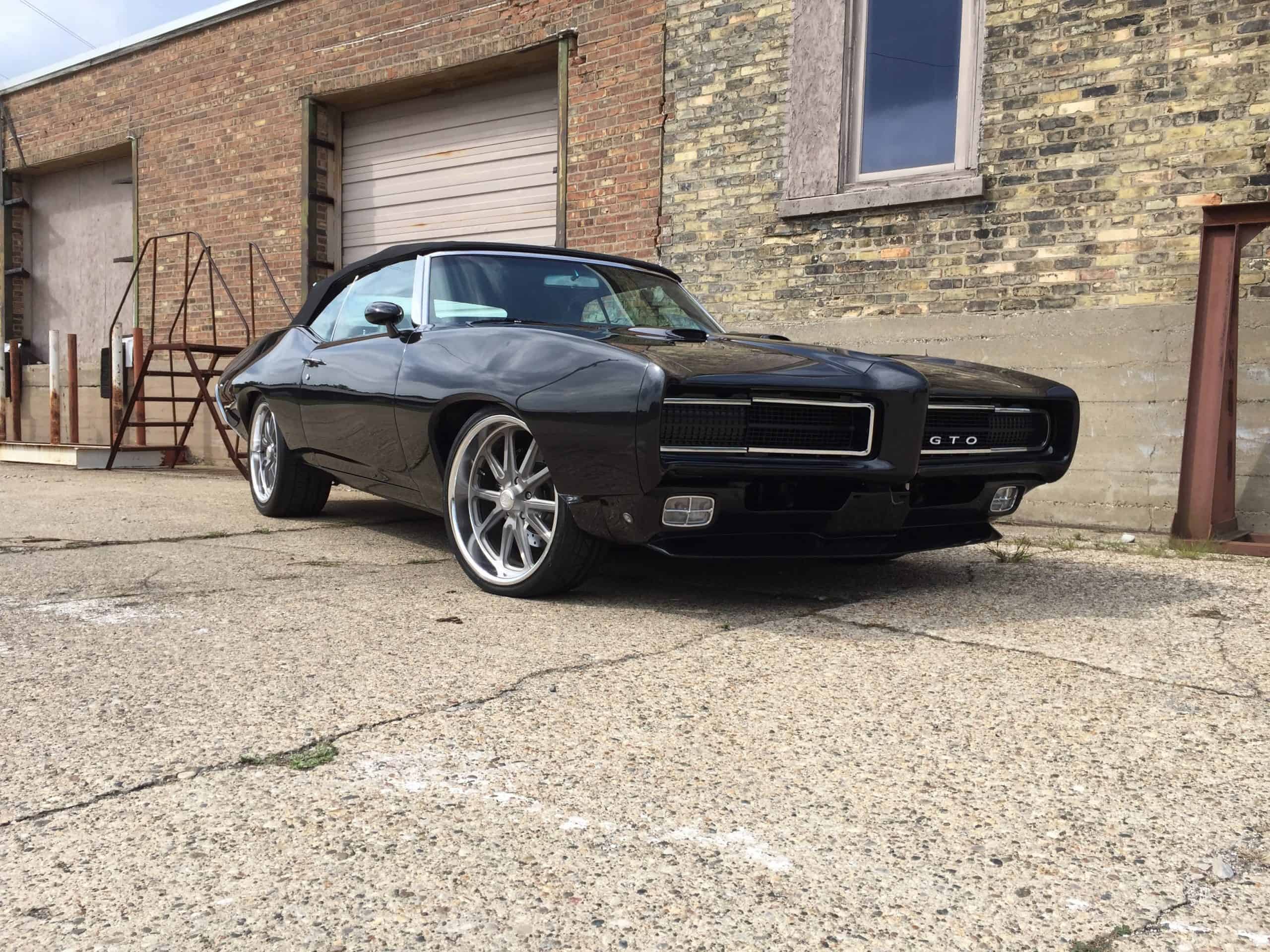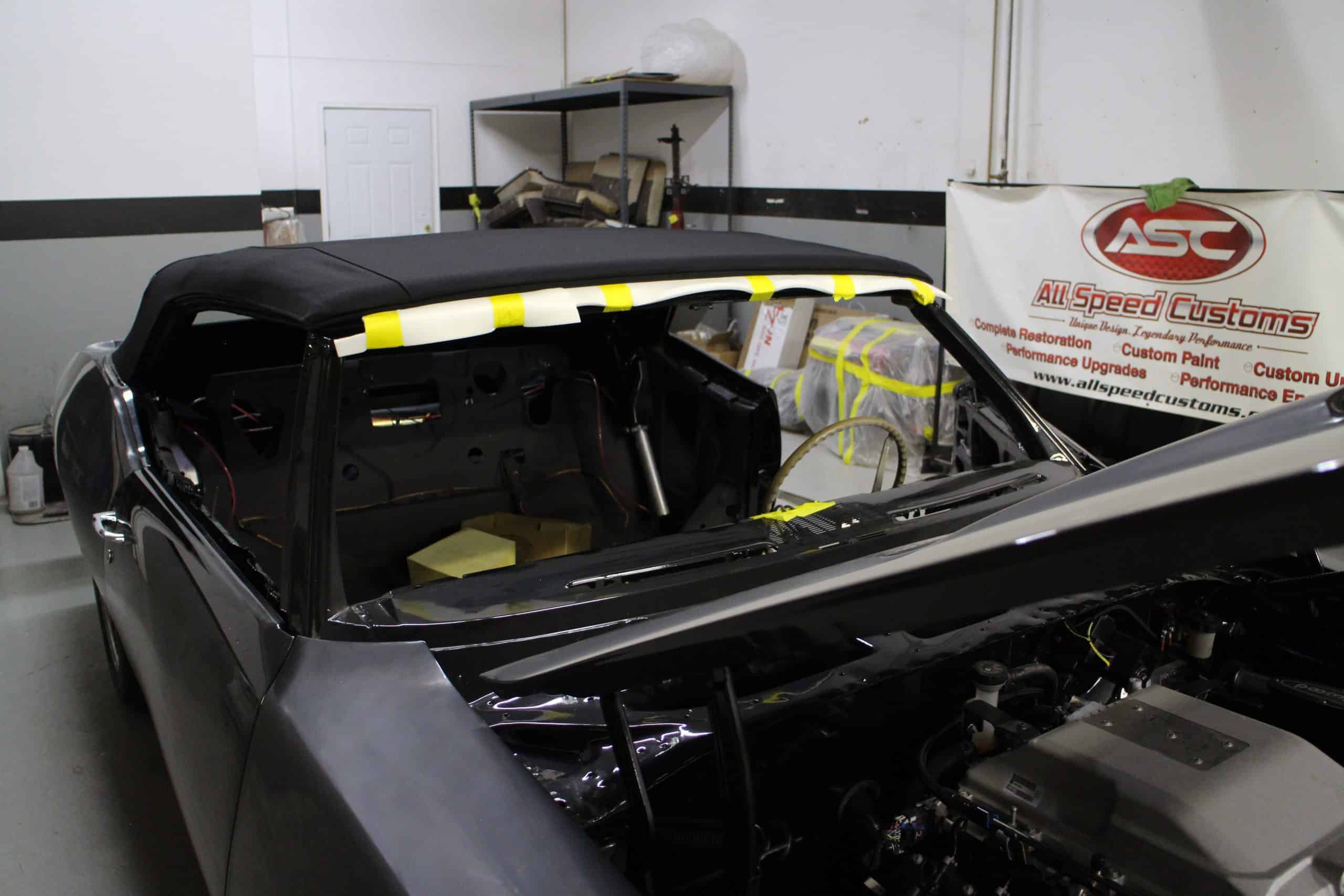 This is a 1969 Pontiac GTO convertible that was a frame-off rotisserie restoration by All Speed Customs. We completely stripped the car down, performed extensive rust repair and panel replacement with some custom molding, applied new paint, and installed an updated suspension and brakes to corral the CTS-V supercharged V8 engine and 6-speed manual trans, with a fully custom interior from our design team.