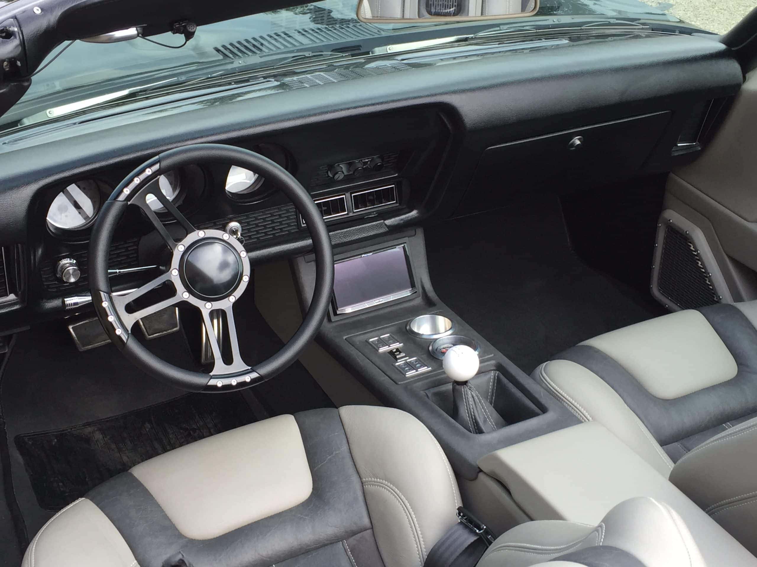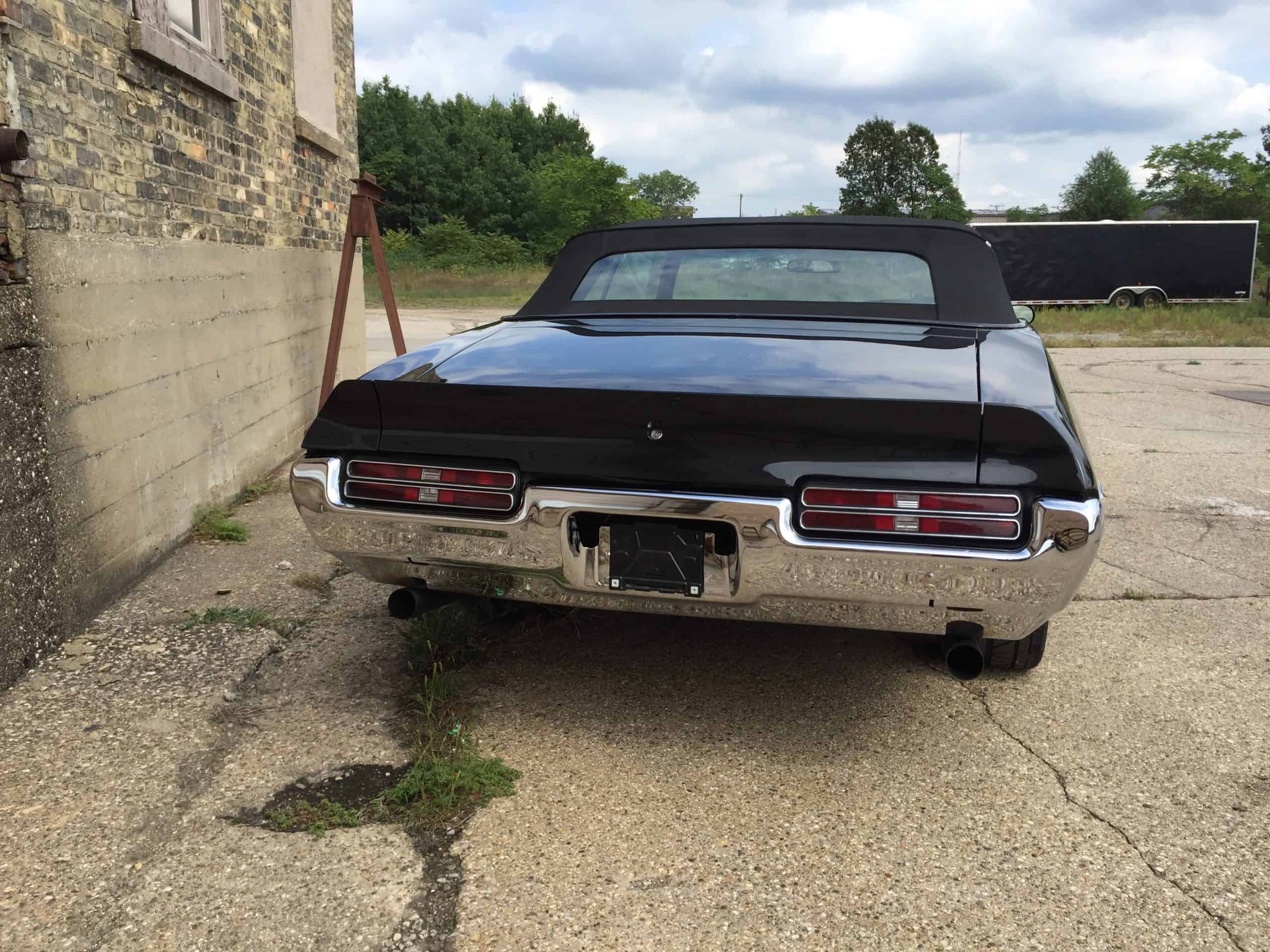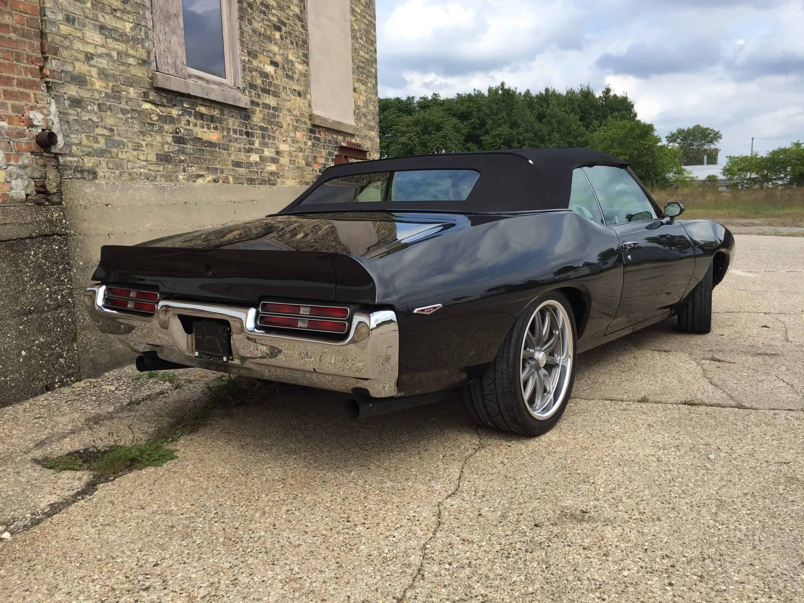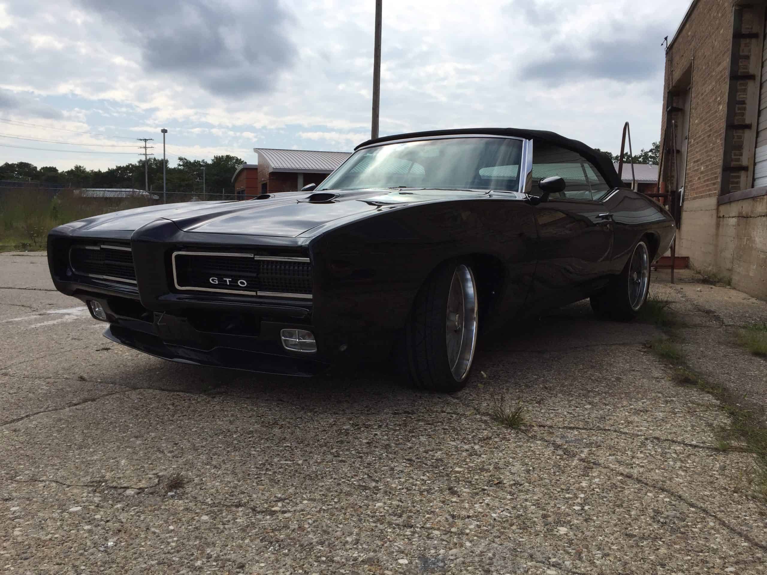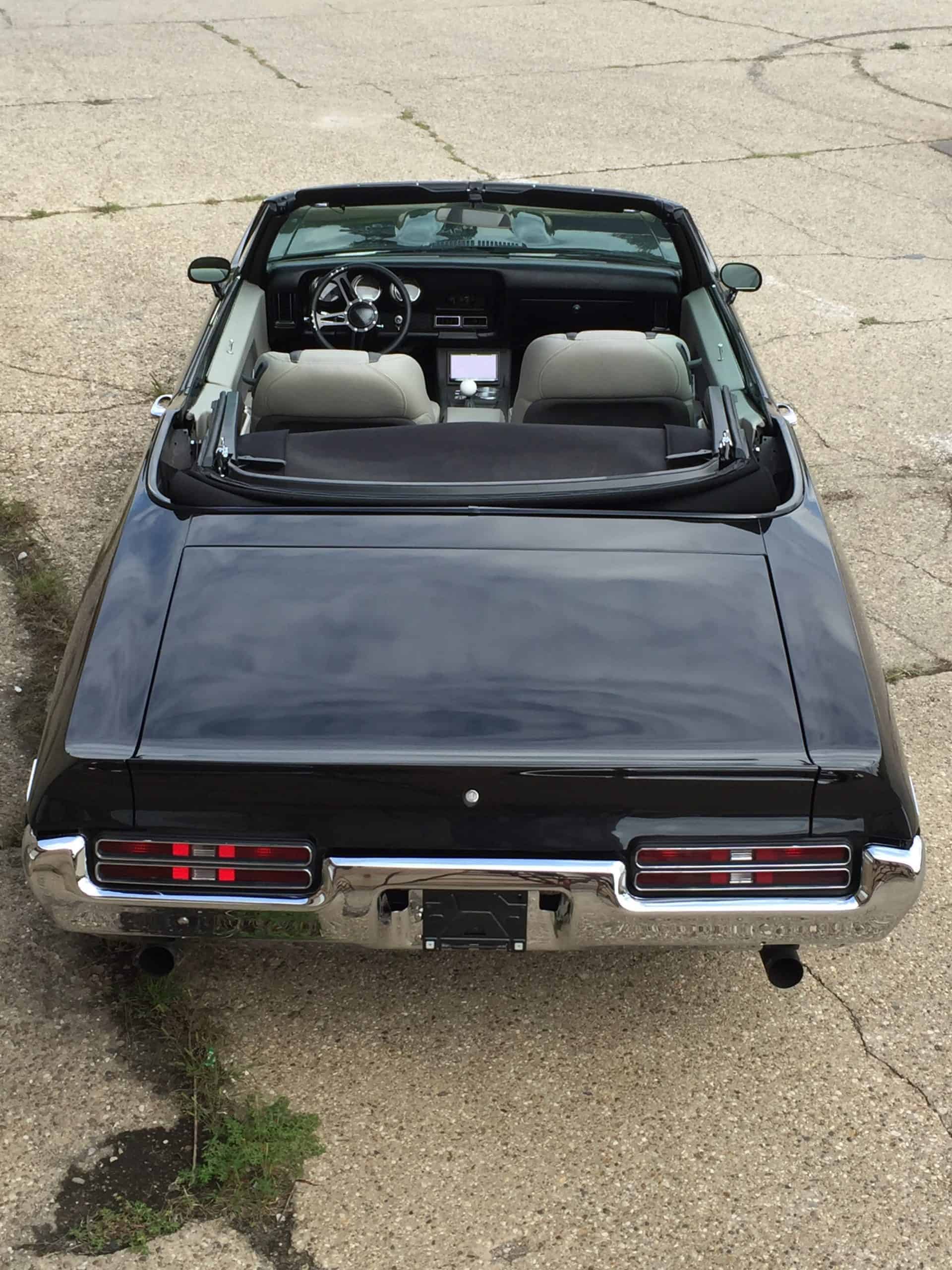 This is a 1969 Pontiac GTO convertible that was a frame-off rotisserie restoration by All Speed Customs. We completely stripped the car down, performed extensive rust repair and panel replacement with some custom molding, applied new paint, and installed an updated suspension and brakes to corral the CTS-V supercharged V8 engine and 6-speed manual trans, with a fully custom interior from our design team.