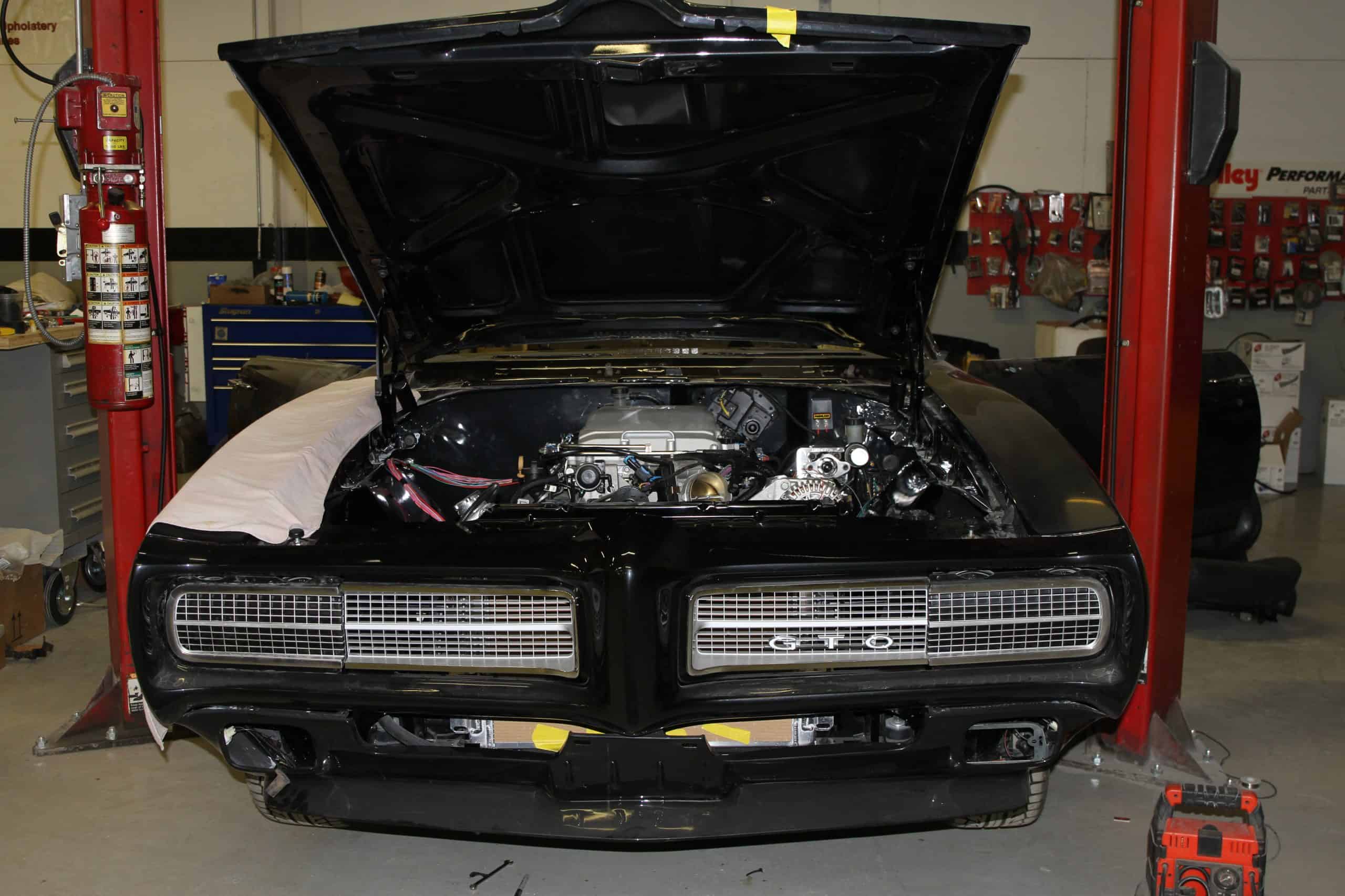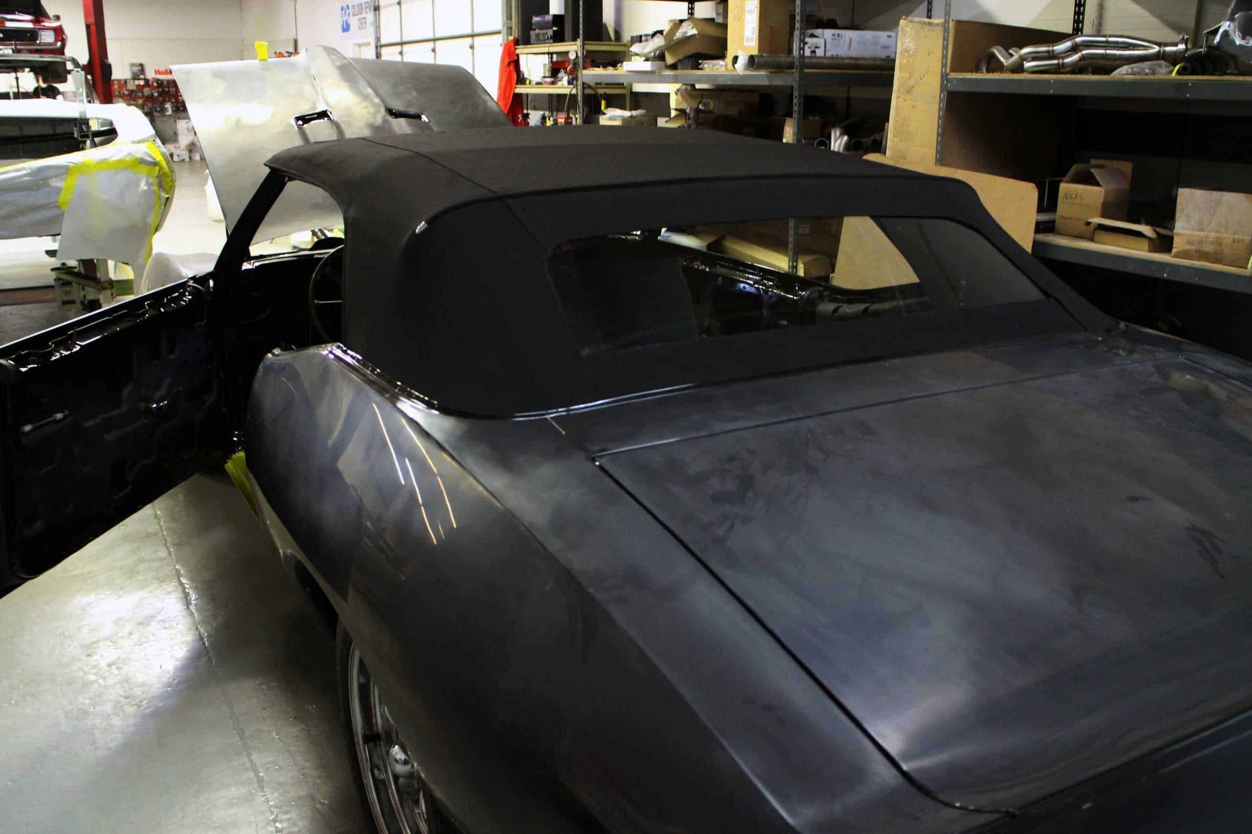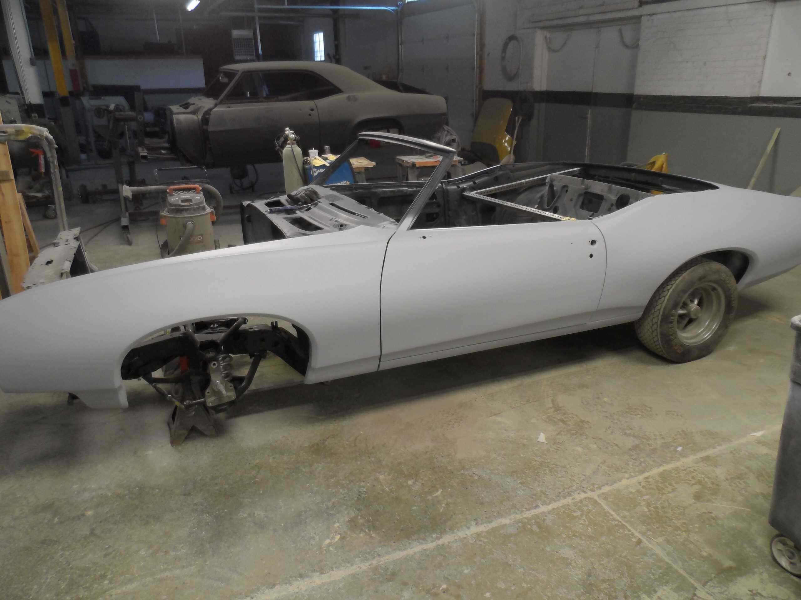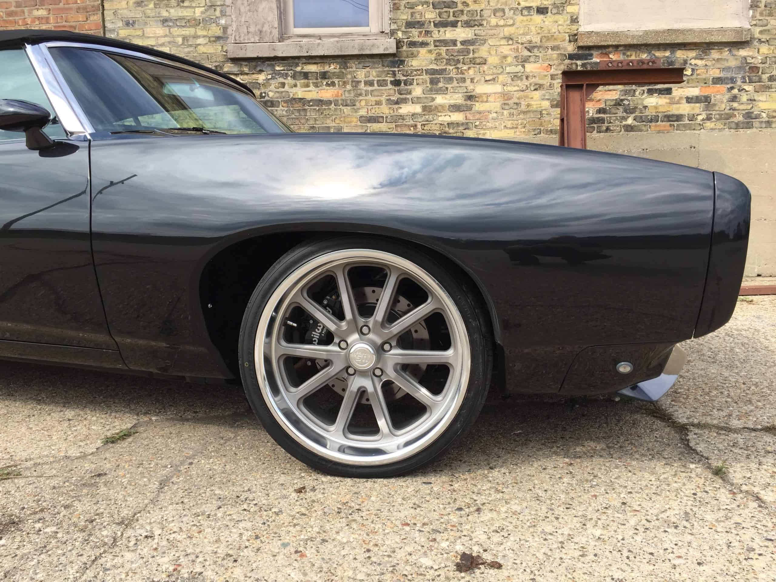 This is a 1969 Pontiac GTO convertible that was a frame-off rotisserie restoration by All Speed Customs. We completely stripped the car down, performed extensive rust repair and panel replacement with some custom molding, applied new paint, and installed an updated suspension and brakes to corral the CTS-V supercharged V8 engine and 6-speed manual trans, with a fully custom interior from our design team.