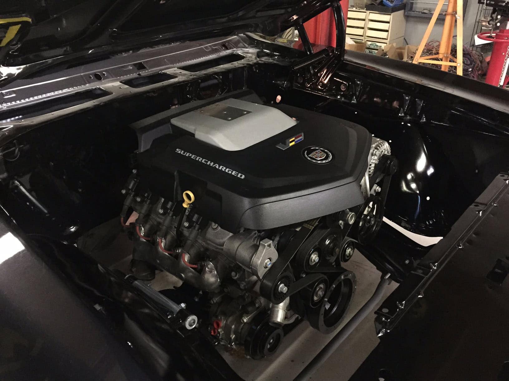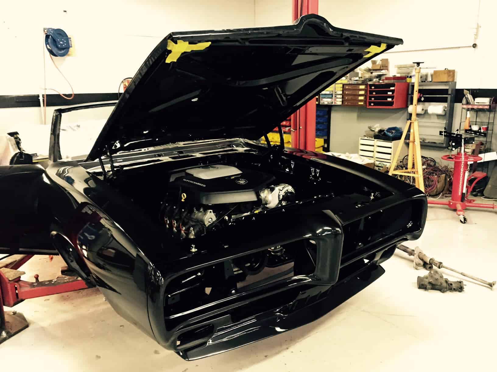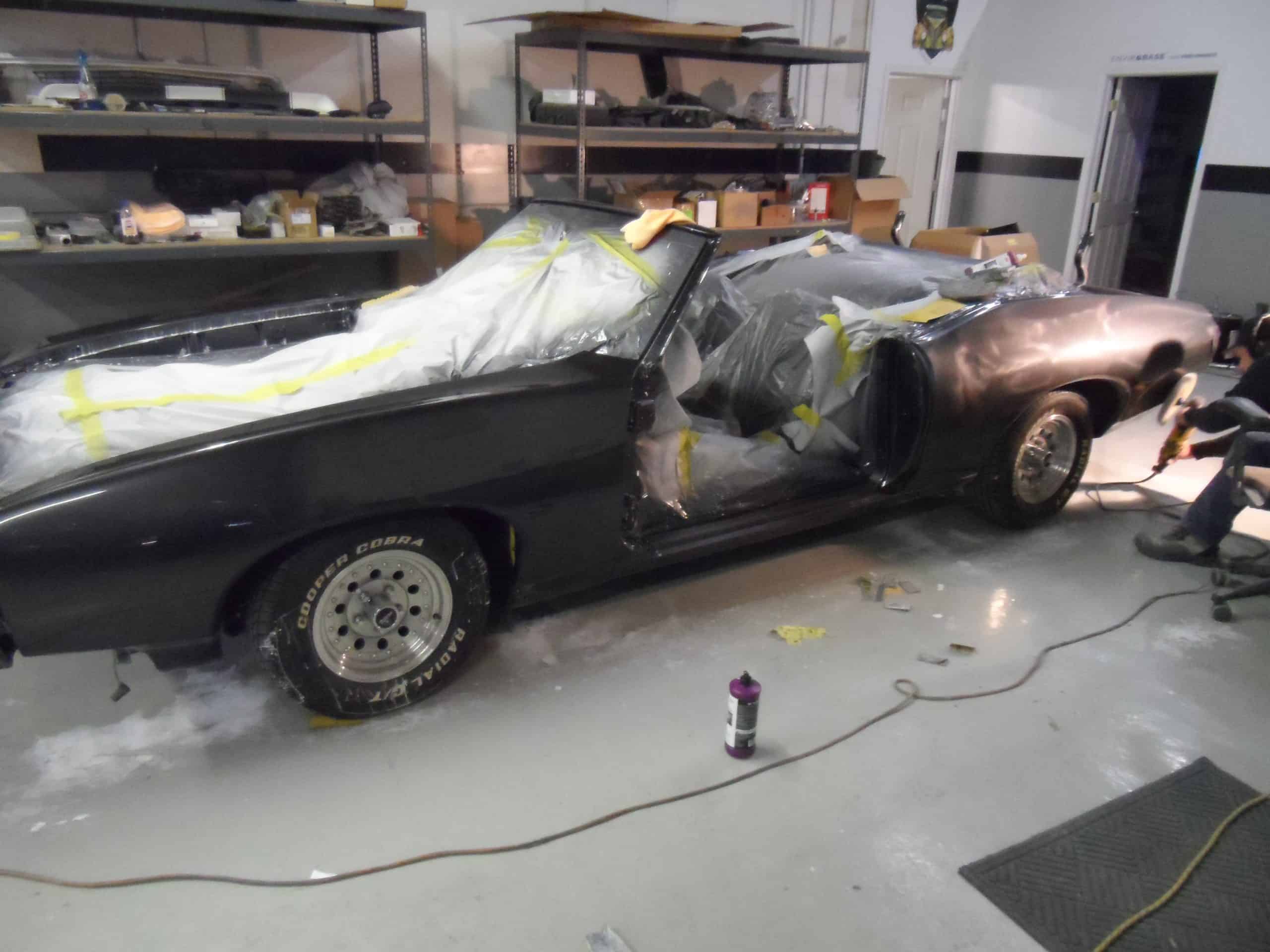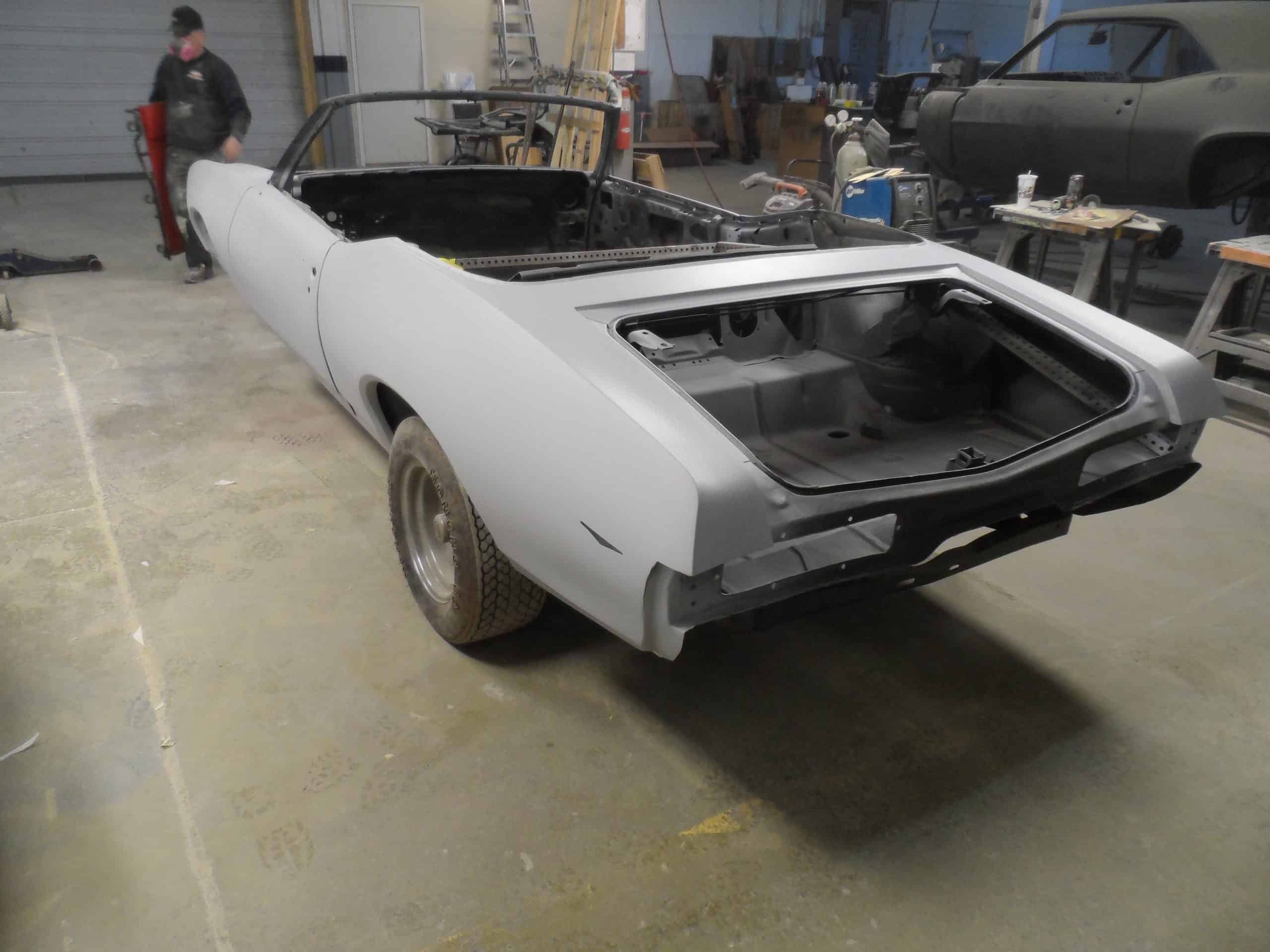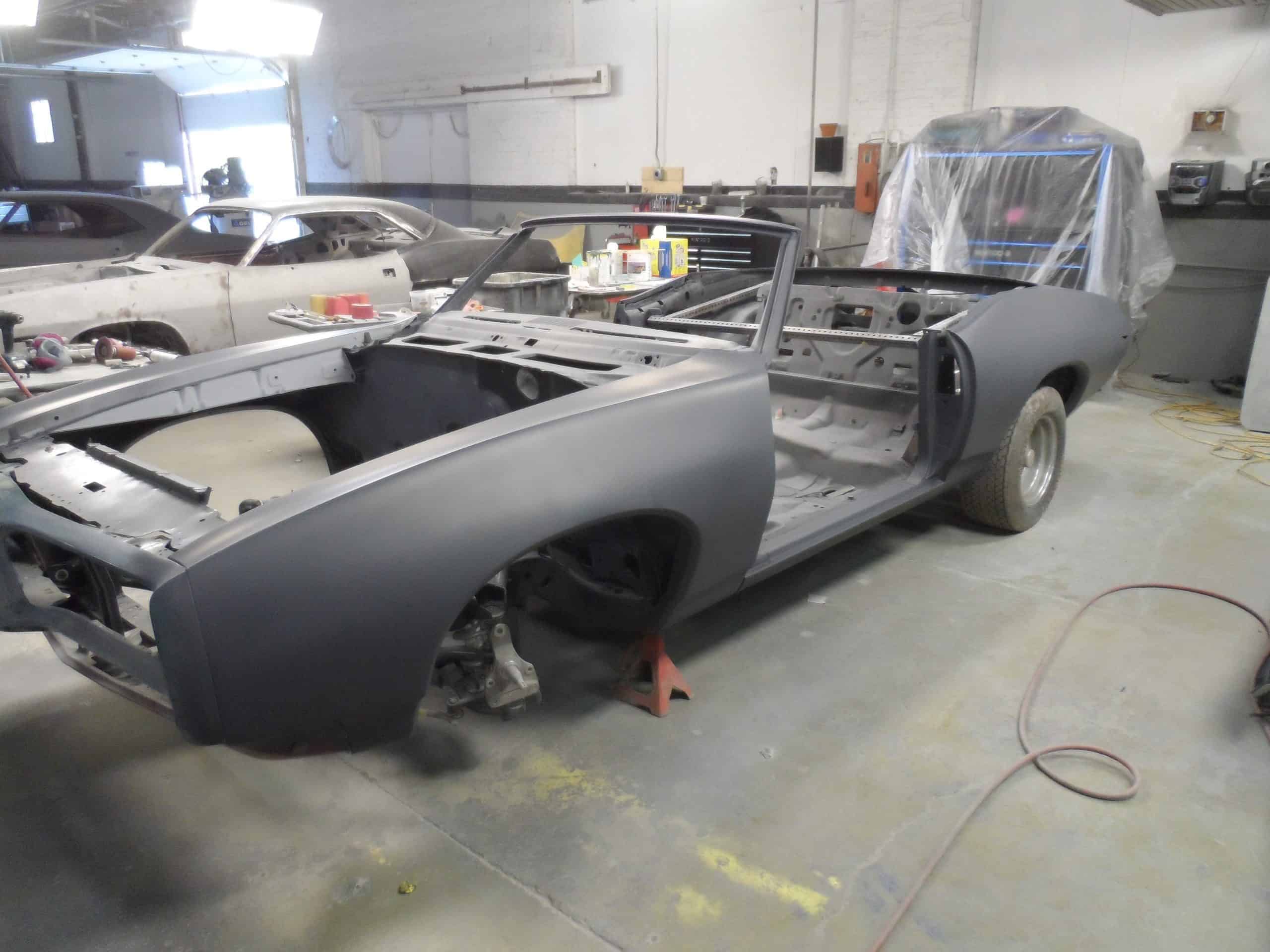 This is a 1969 Pontiac GTO convertible that was a frame-off rotisserie restoration by All Speed Customs. We completely stripped the car down, performed extensive rust repair and panel replacement with some custom molding, applied new paint, and installed an updated suspension and brakes to corral the CTS-V supercharged V8 engine and 6-speed manual trans, with a fully custom interior from our design team.