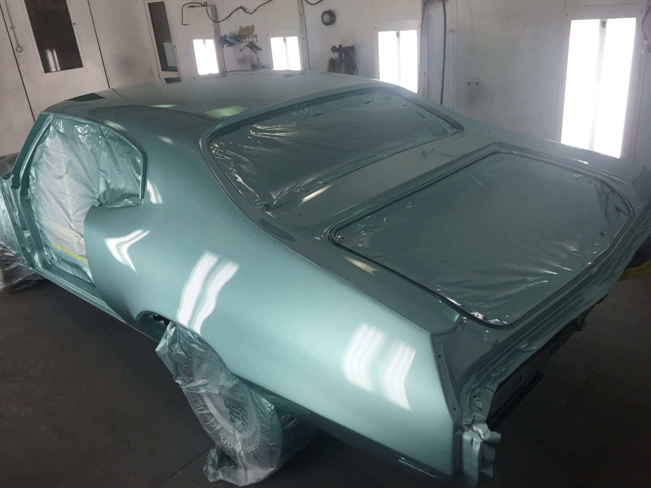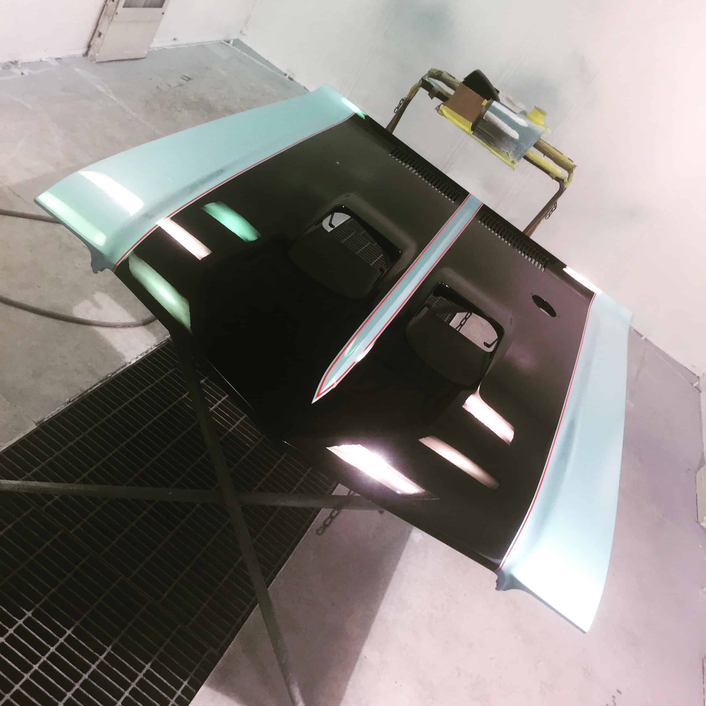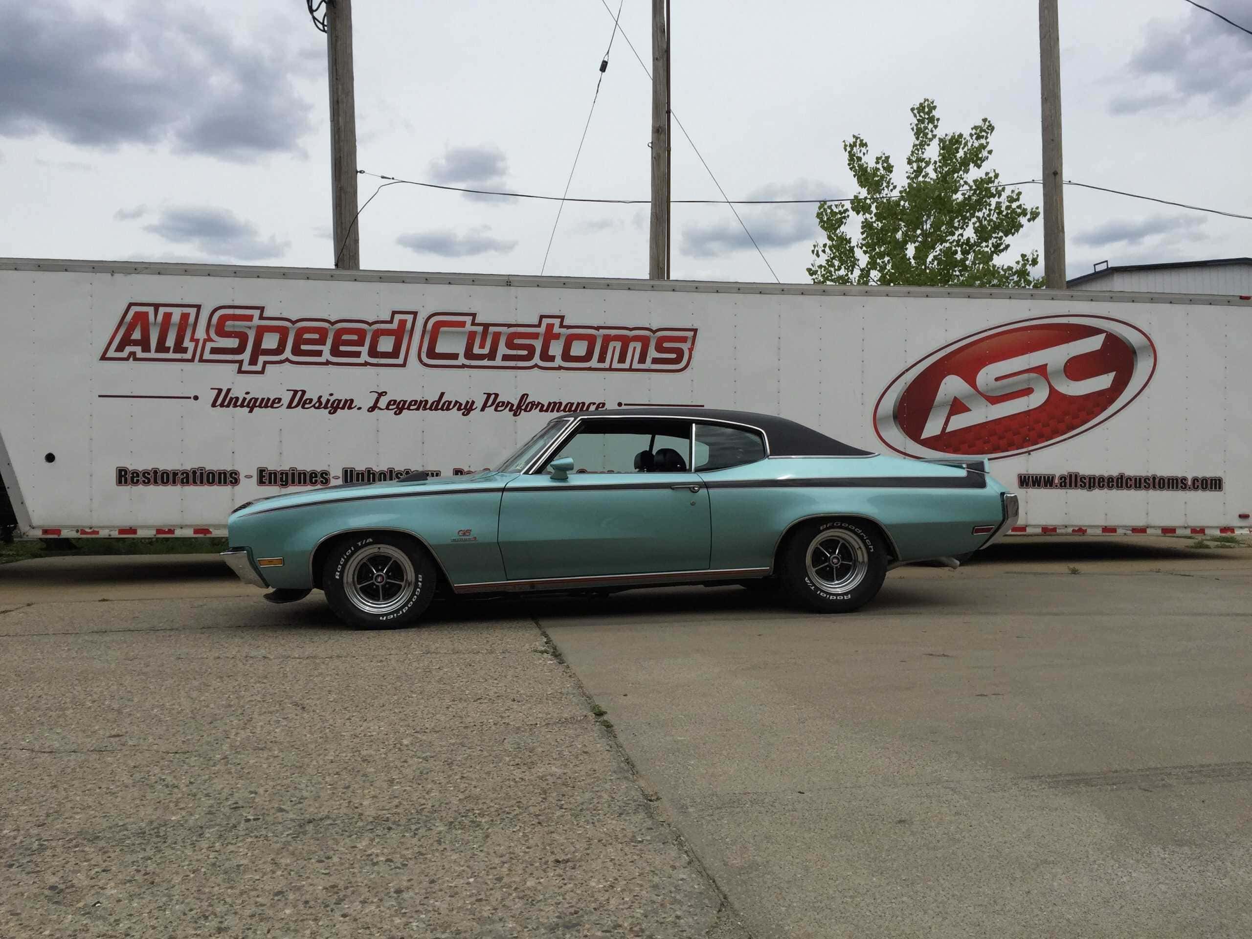 This 1970 Buick GS Stage I arrived needing a fresh paint job. We prepped the body and applied a beautiful teal green paint scheme with wide black full-length stripes, outlined by red pinstriping.