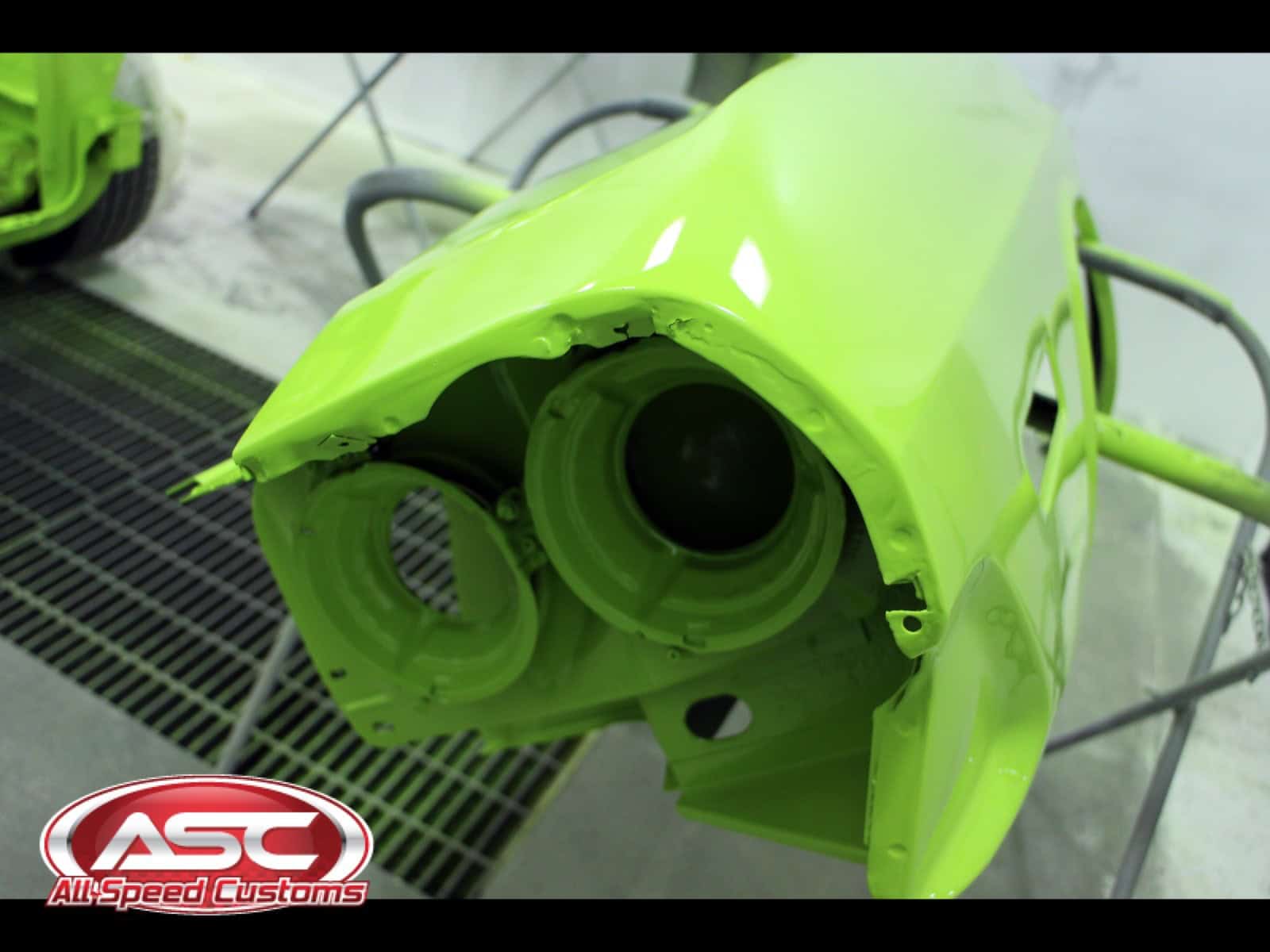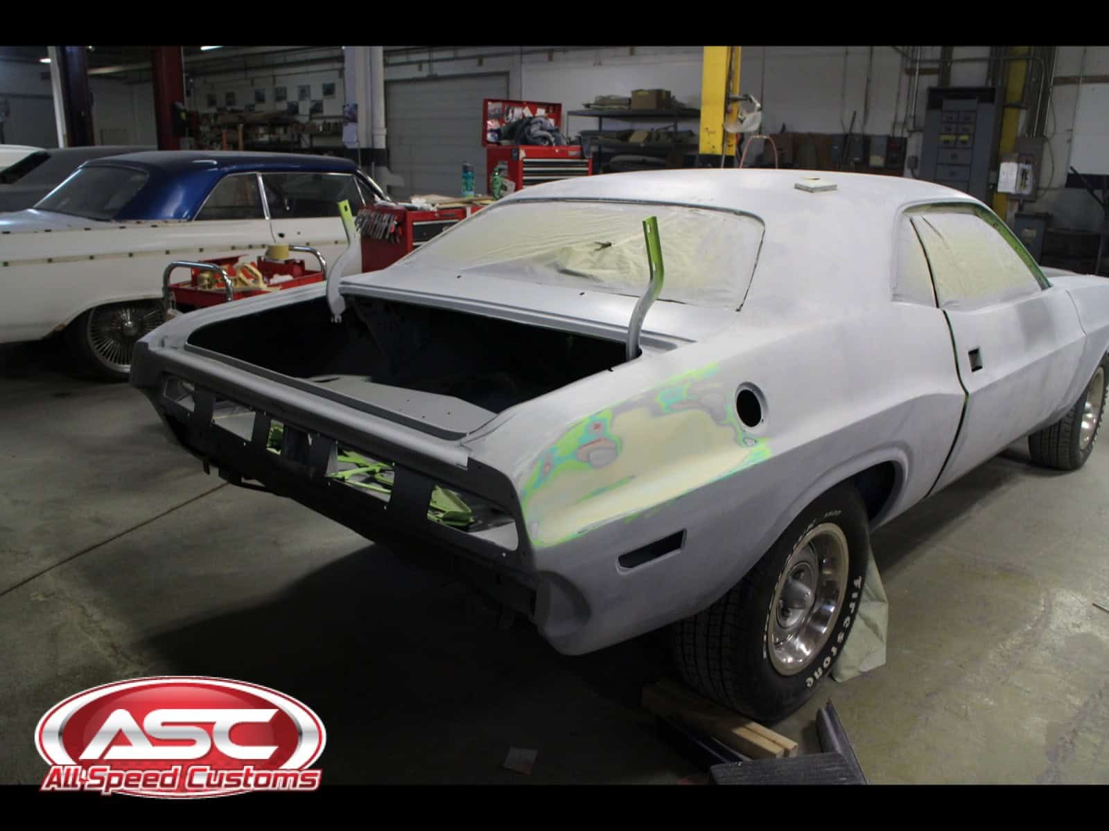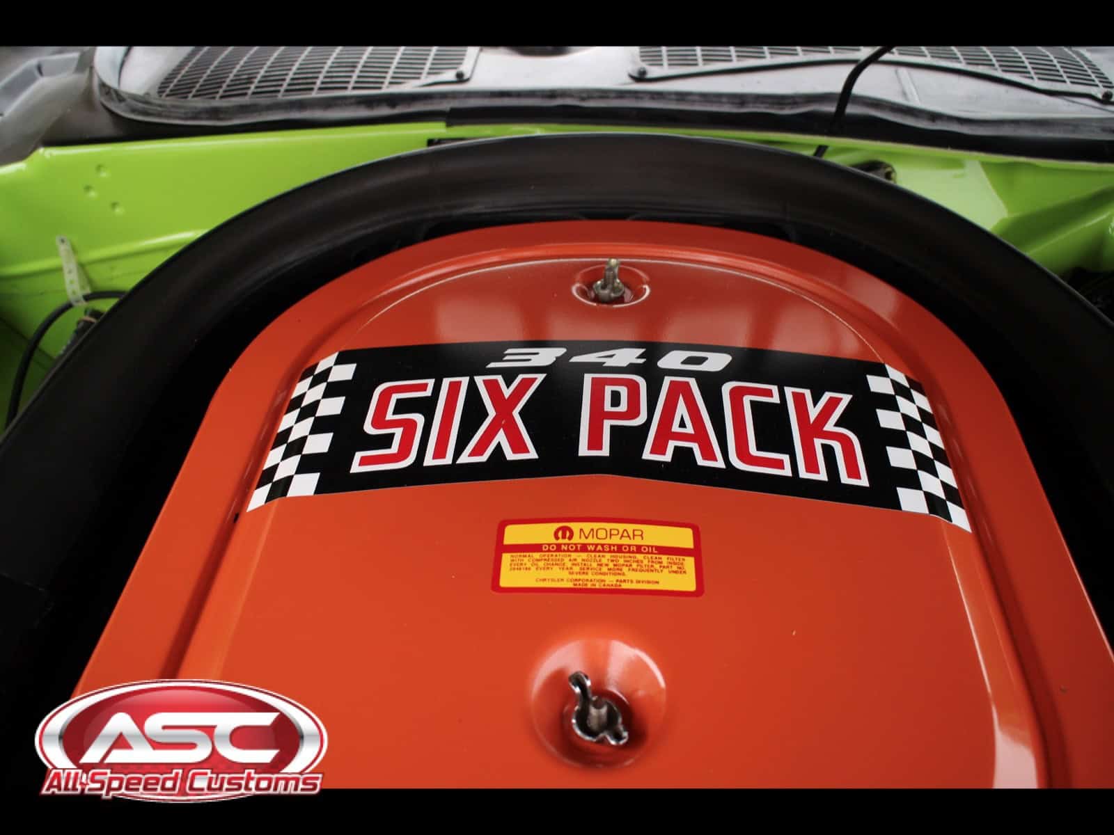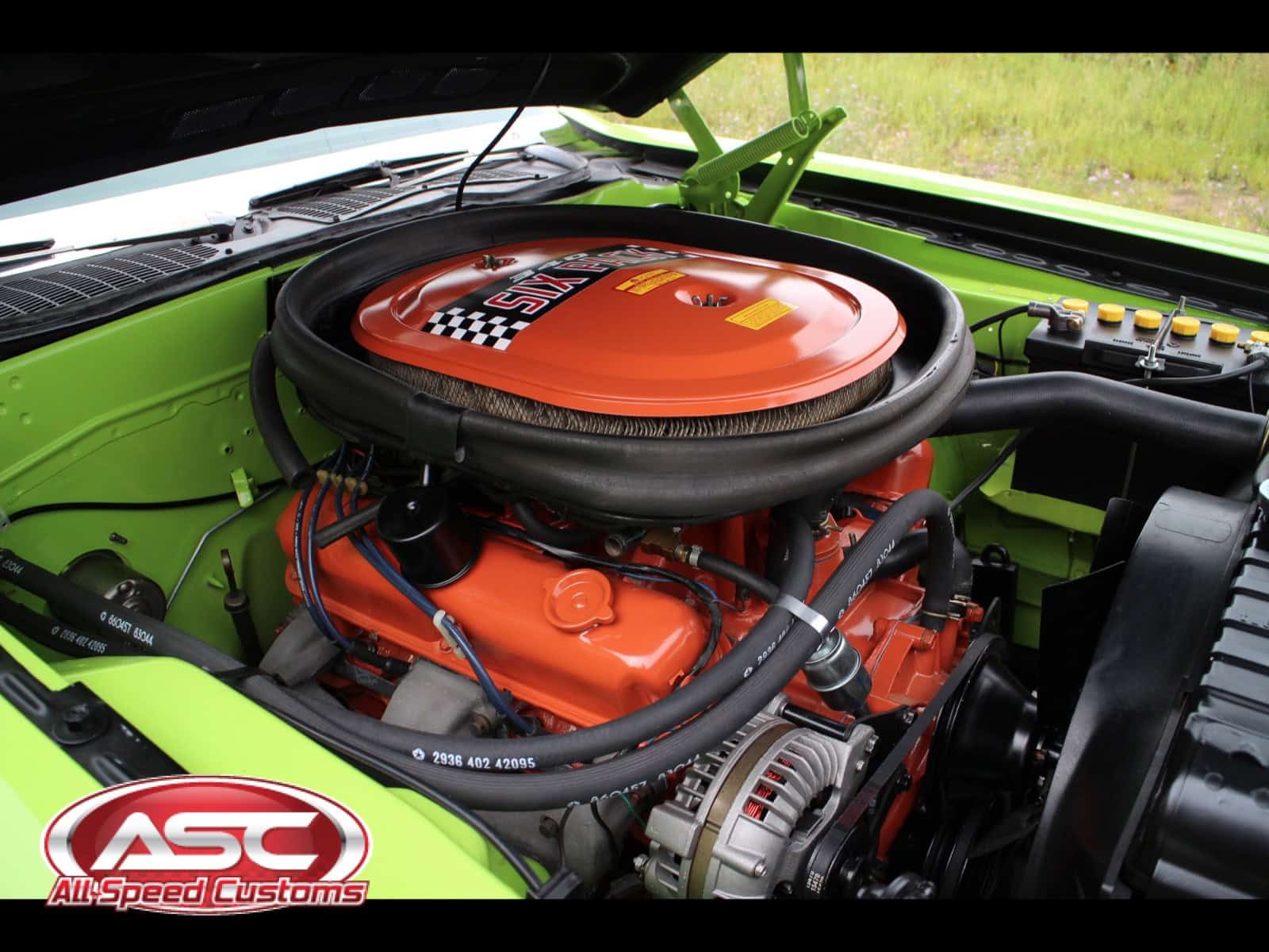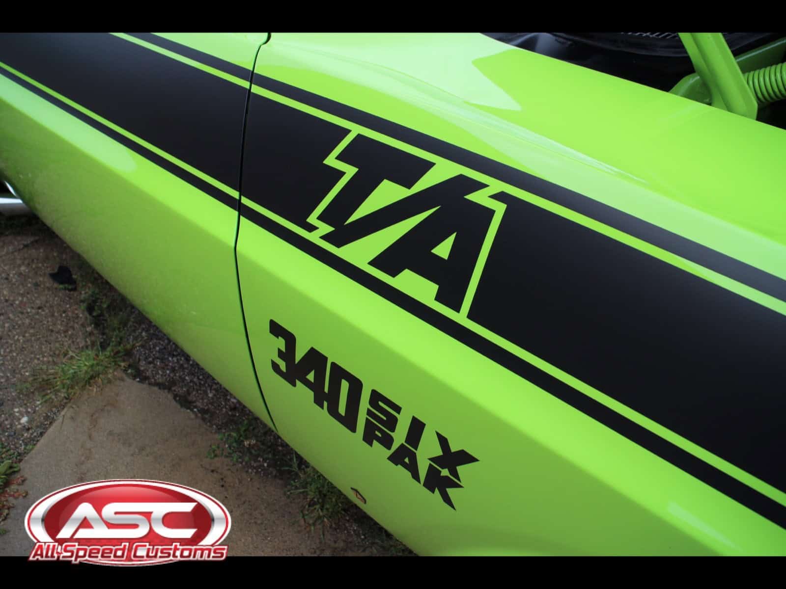 This 1970 Challenger came in for a complete repaint. The body was sanded and blocked by our body technicians and sprayed with a fresh coat of green in our paint booth. New period graphics were applied to complete the look.