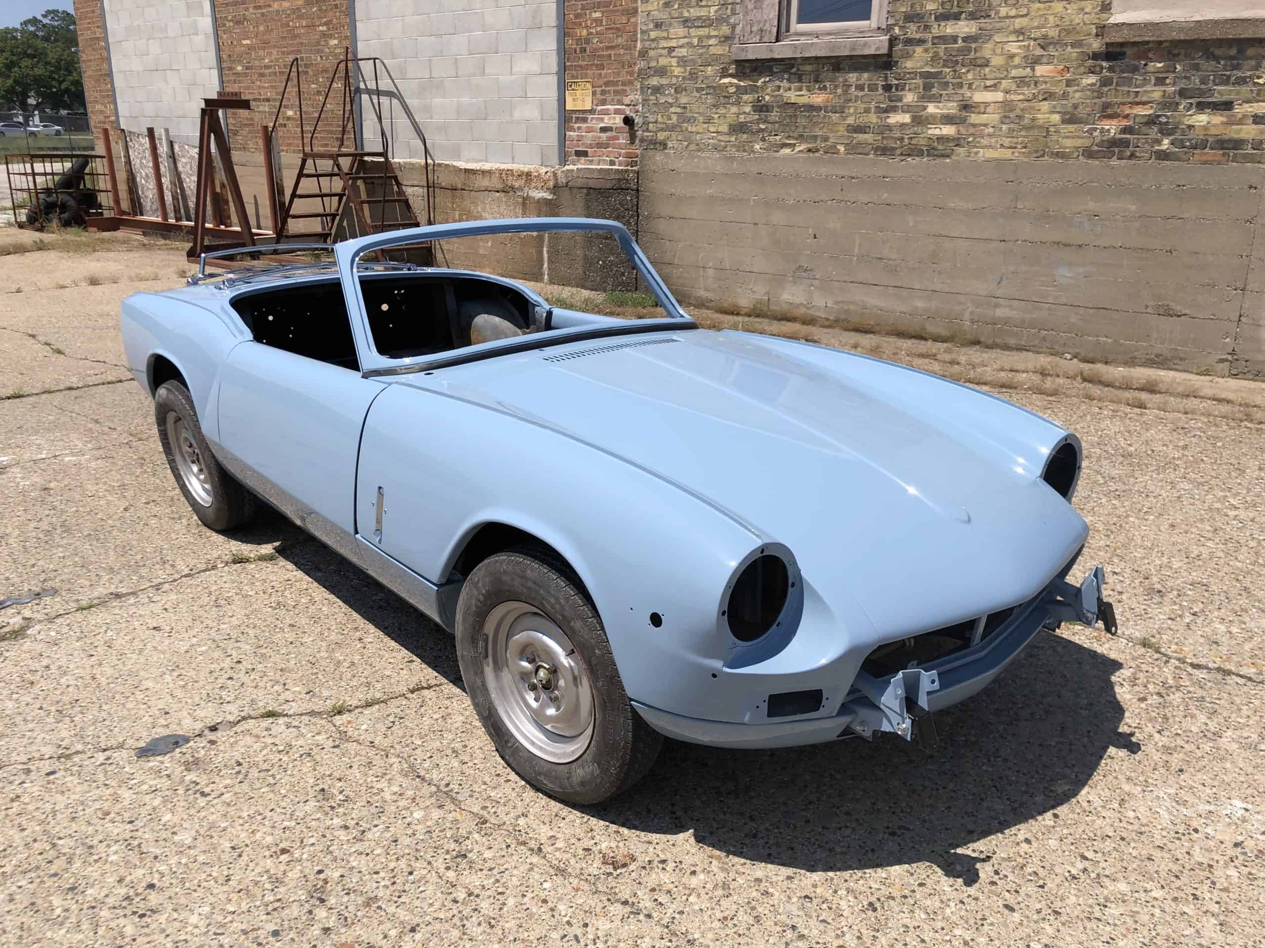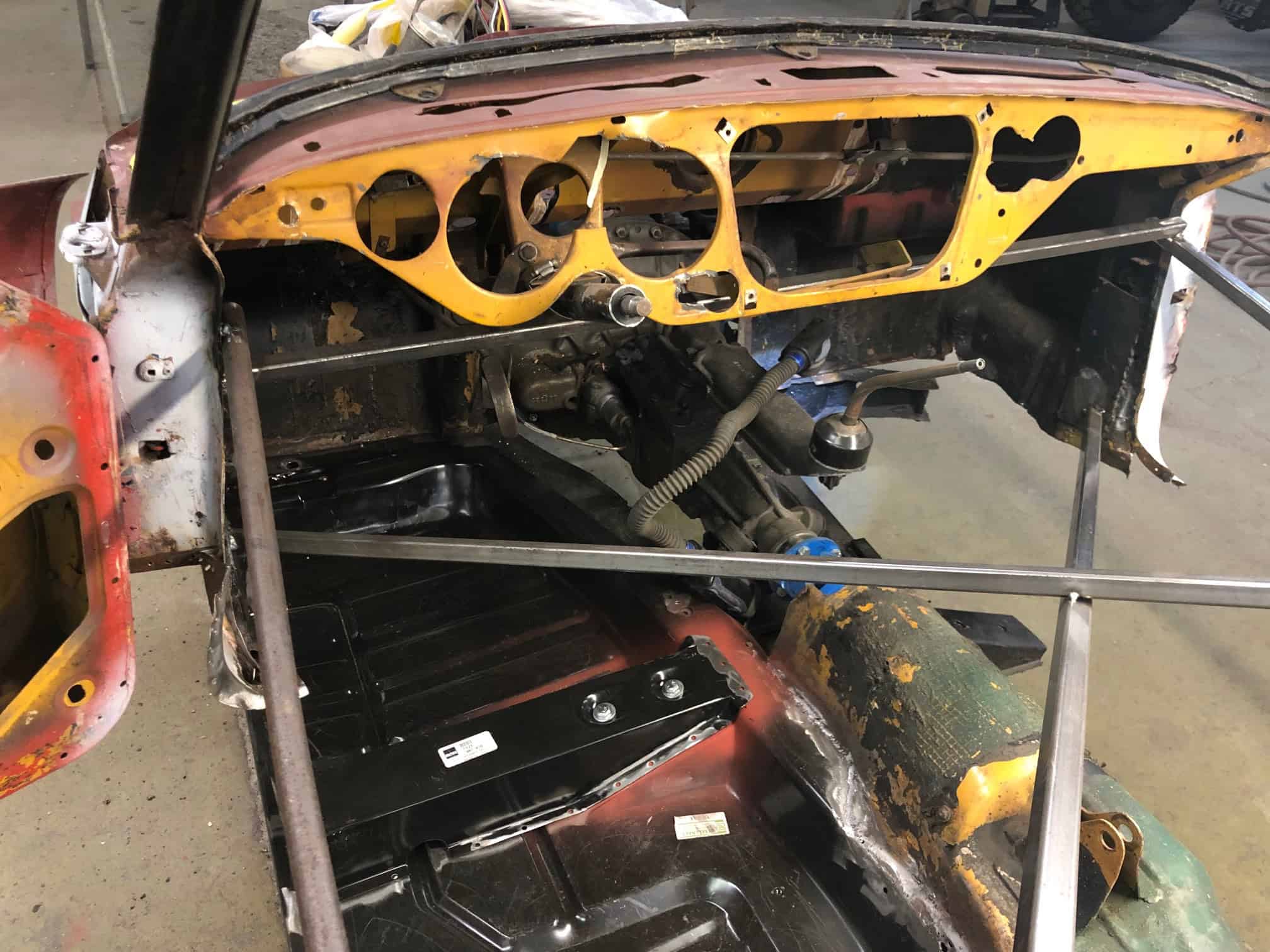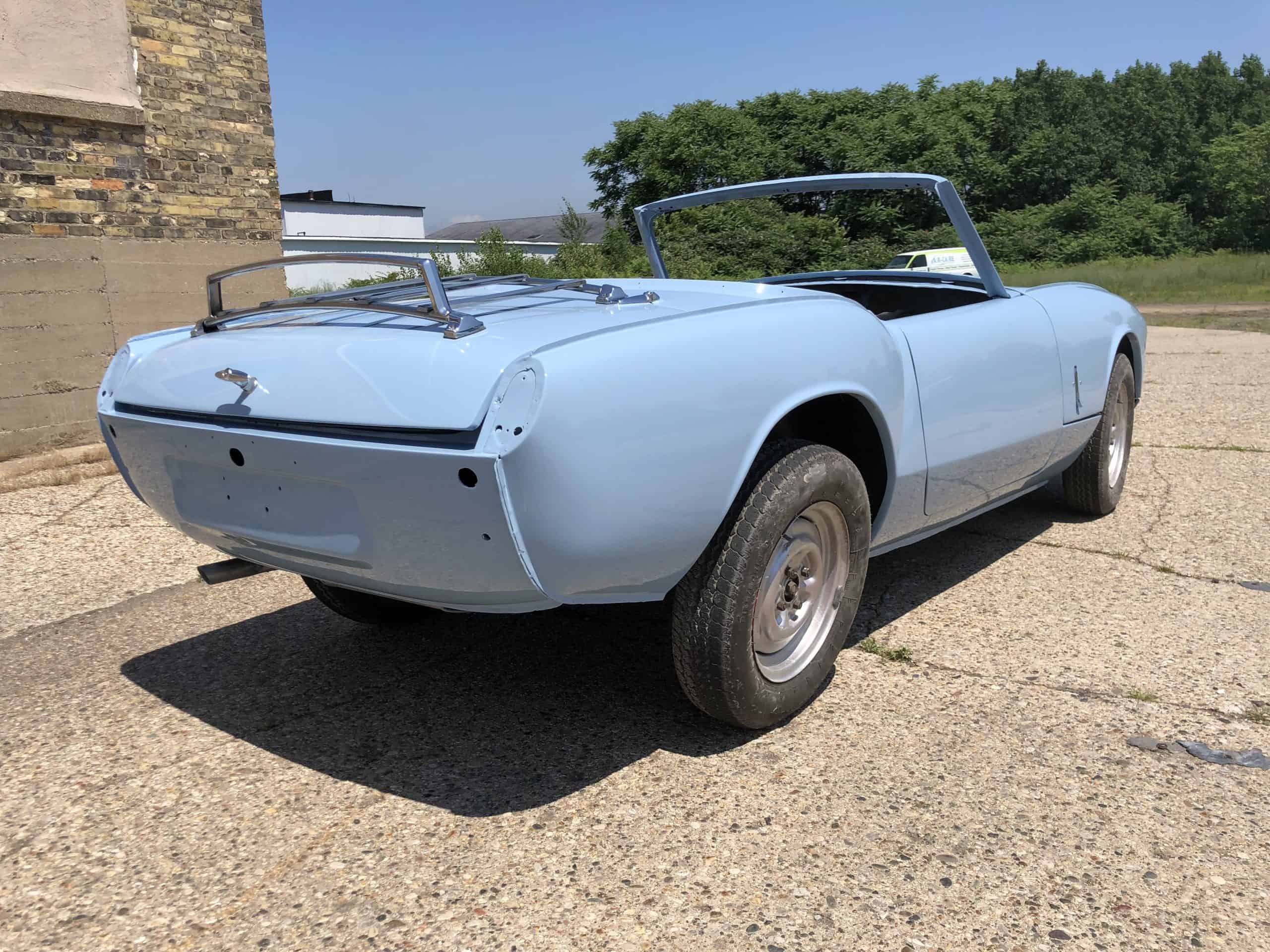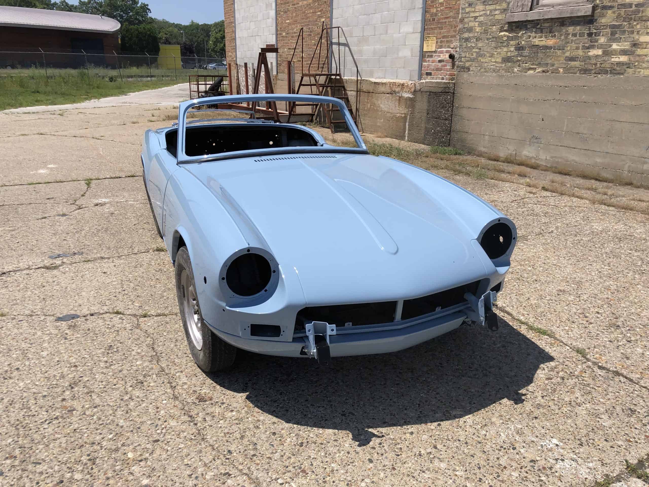 This Triumph came to us in very rough condition. The body had been patched several times and much of the structure and body panels were badly rusted. We removed several of the old body panels including the complete floor boards, inner and outer rocker panel, both complete 1/4 panels and the rear valance panel. After repairing or replacing all of the rusted panels we completed all of the bodywork and continued to spray the car with PPG envirobase bisect and PPG Global high gloss clear coat.