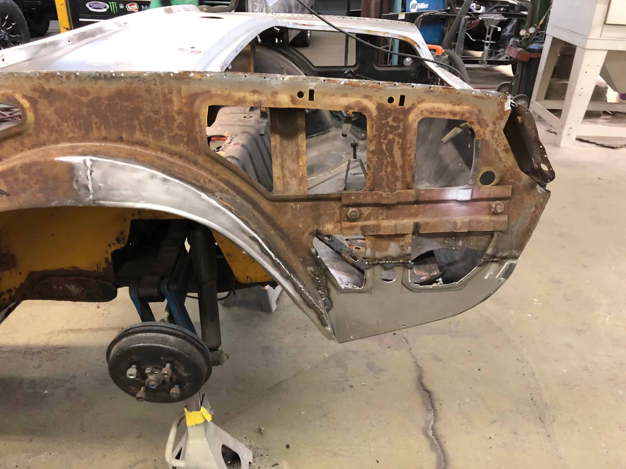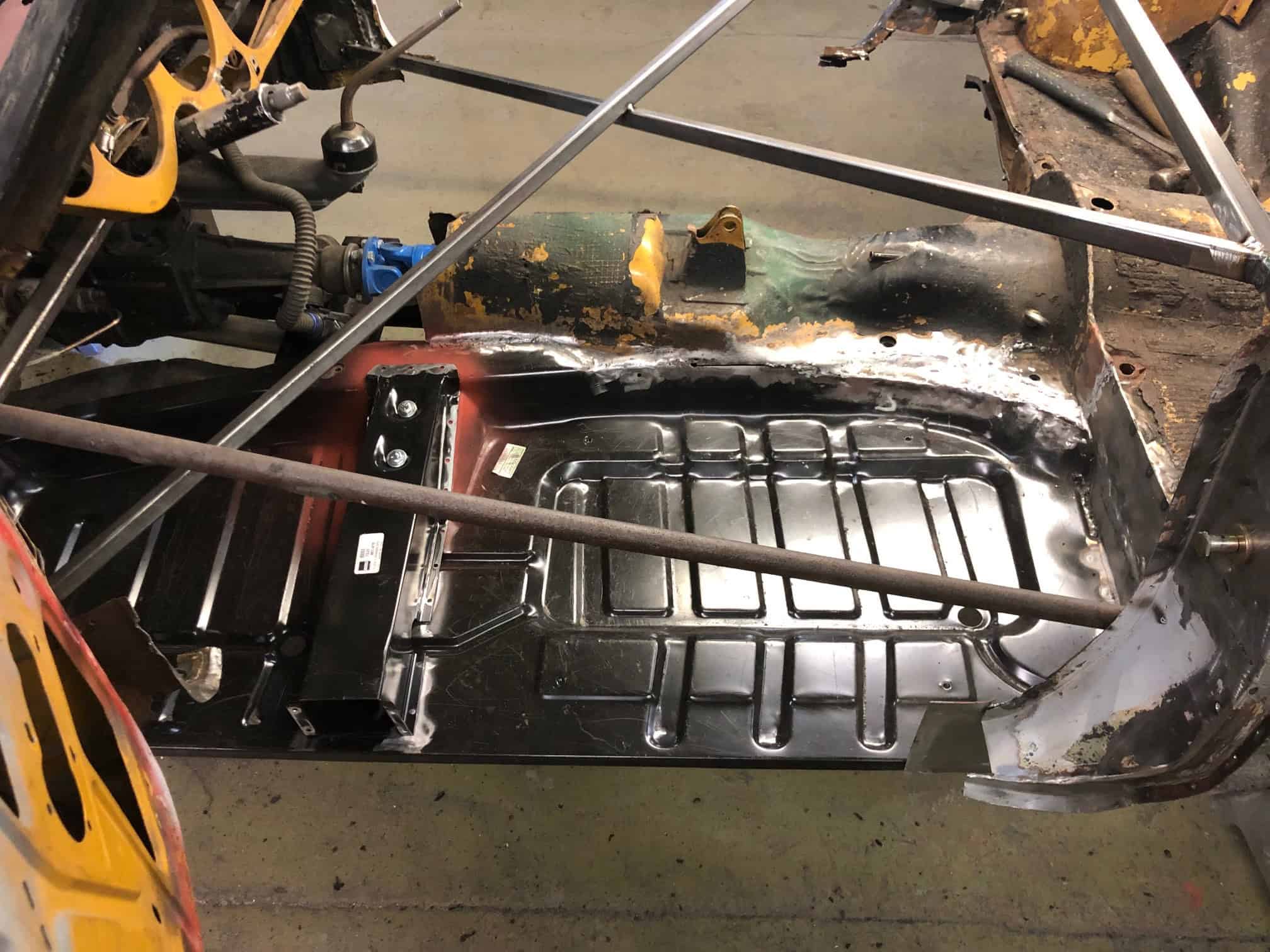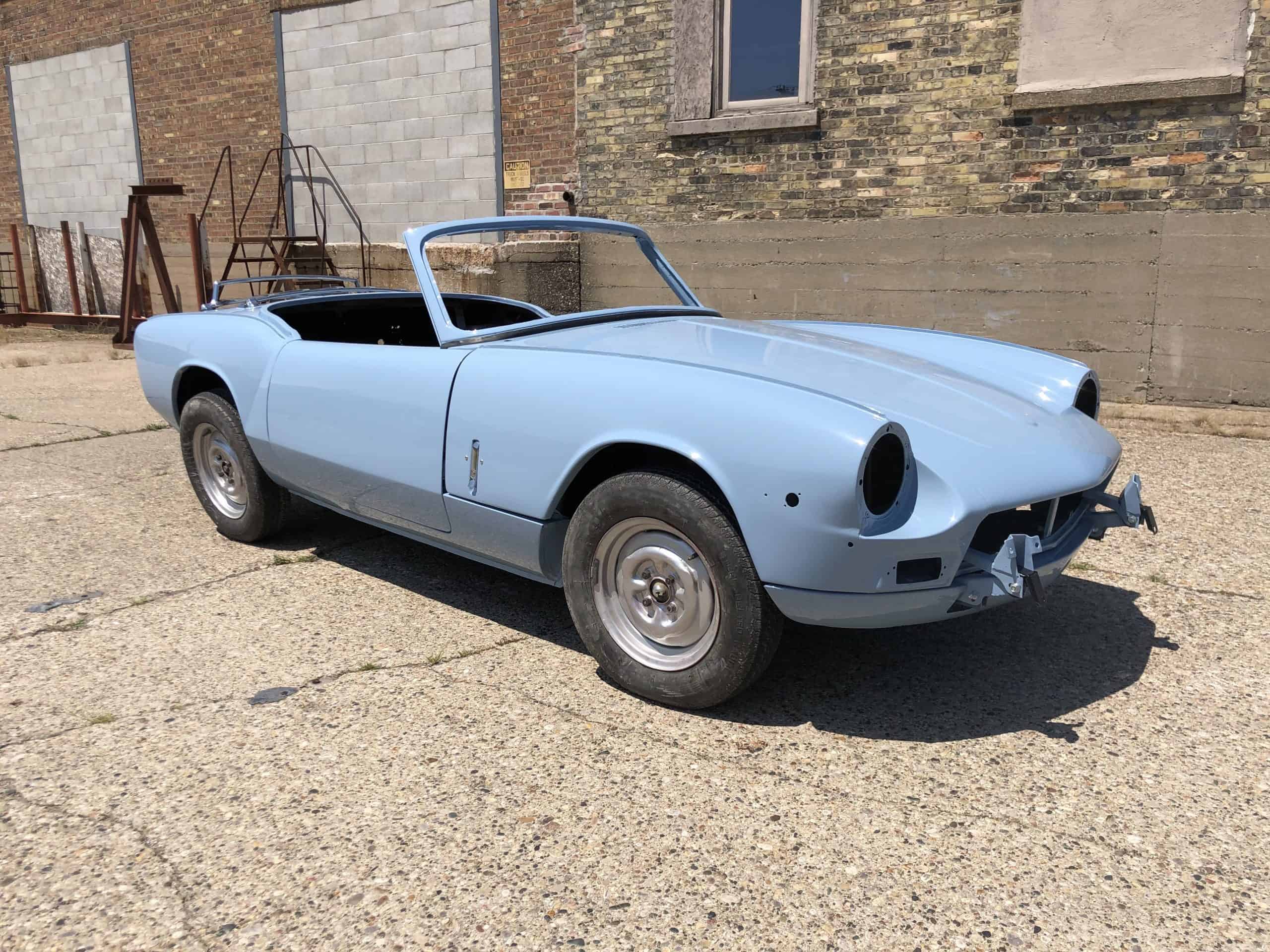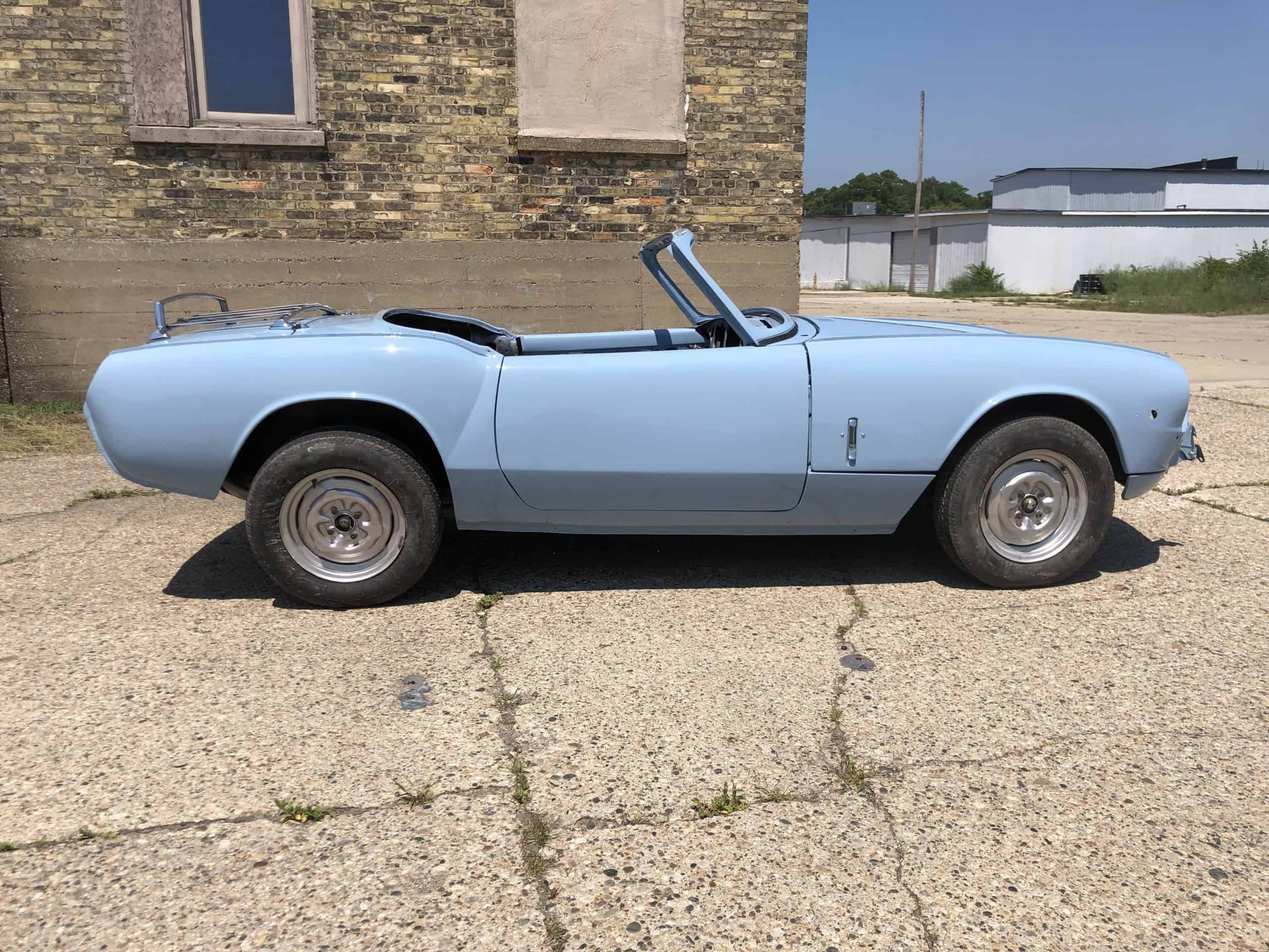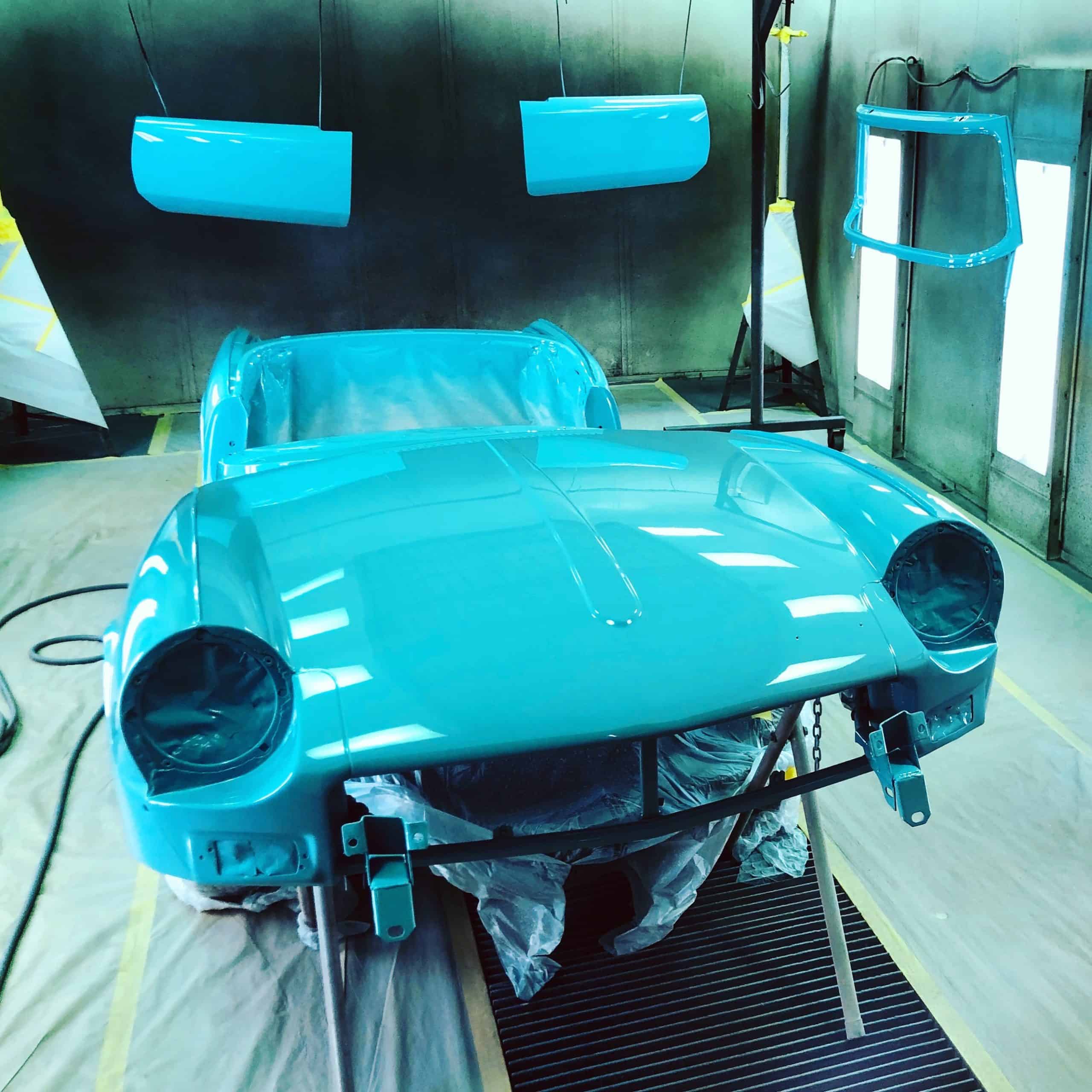 This Triumph came to us in very rough condition. The body had been patched several times and much of the structure and body panels were badly rusted. We removed several of the old body panels including the complete floor boards, inner and outer rocker panel, both complete 1/4 panels and the rear valance panel. After repairing or replacing all of the rusted panels we completed all of the bodywork and continued to spray the car with PPG envirobase bisect and PPG Global high gloss clear coat.