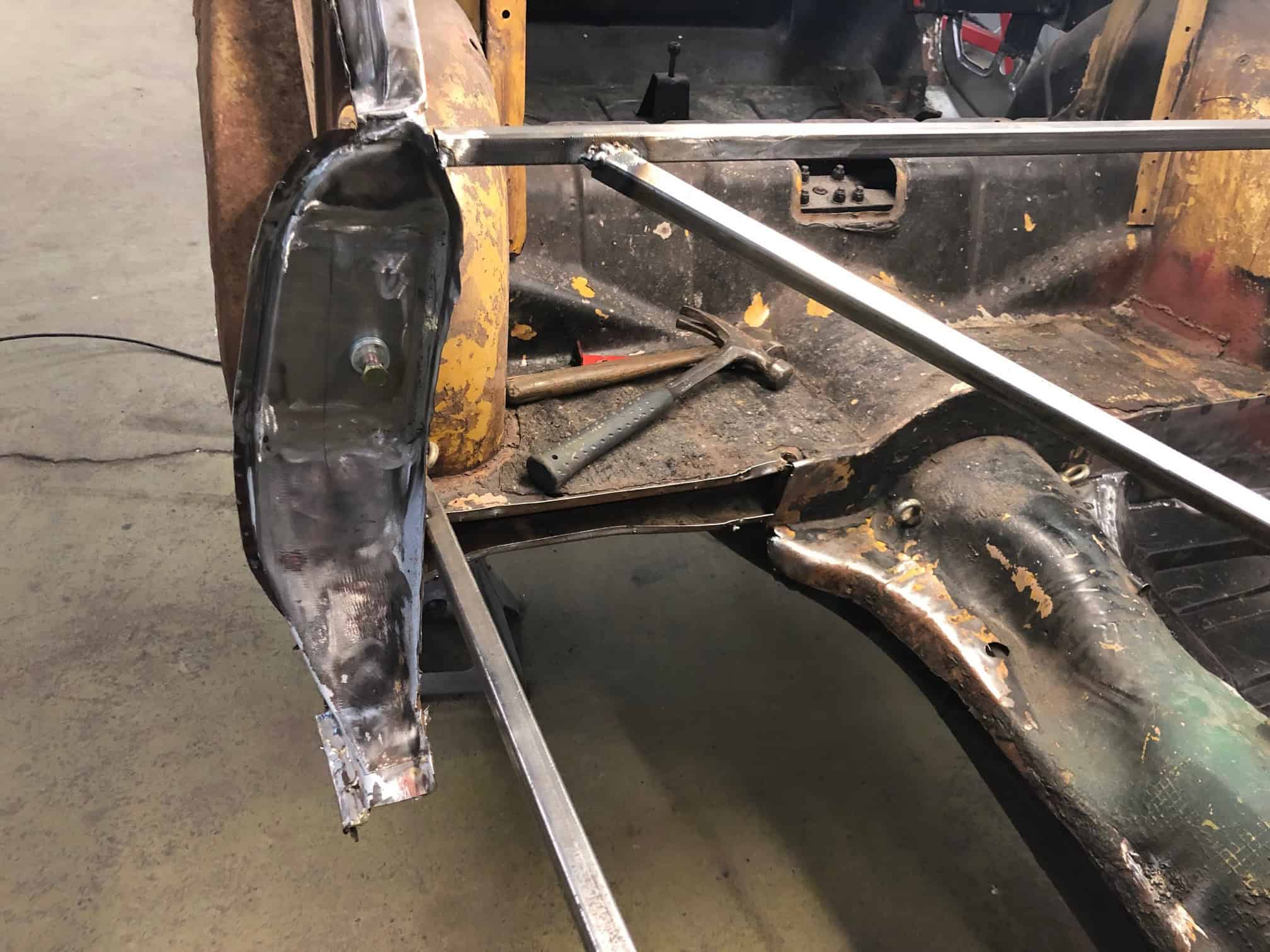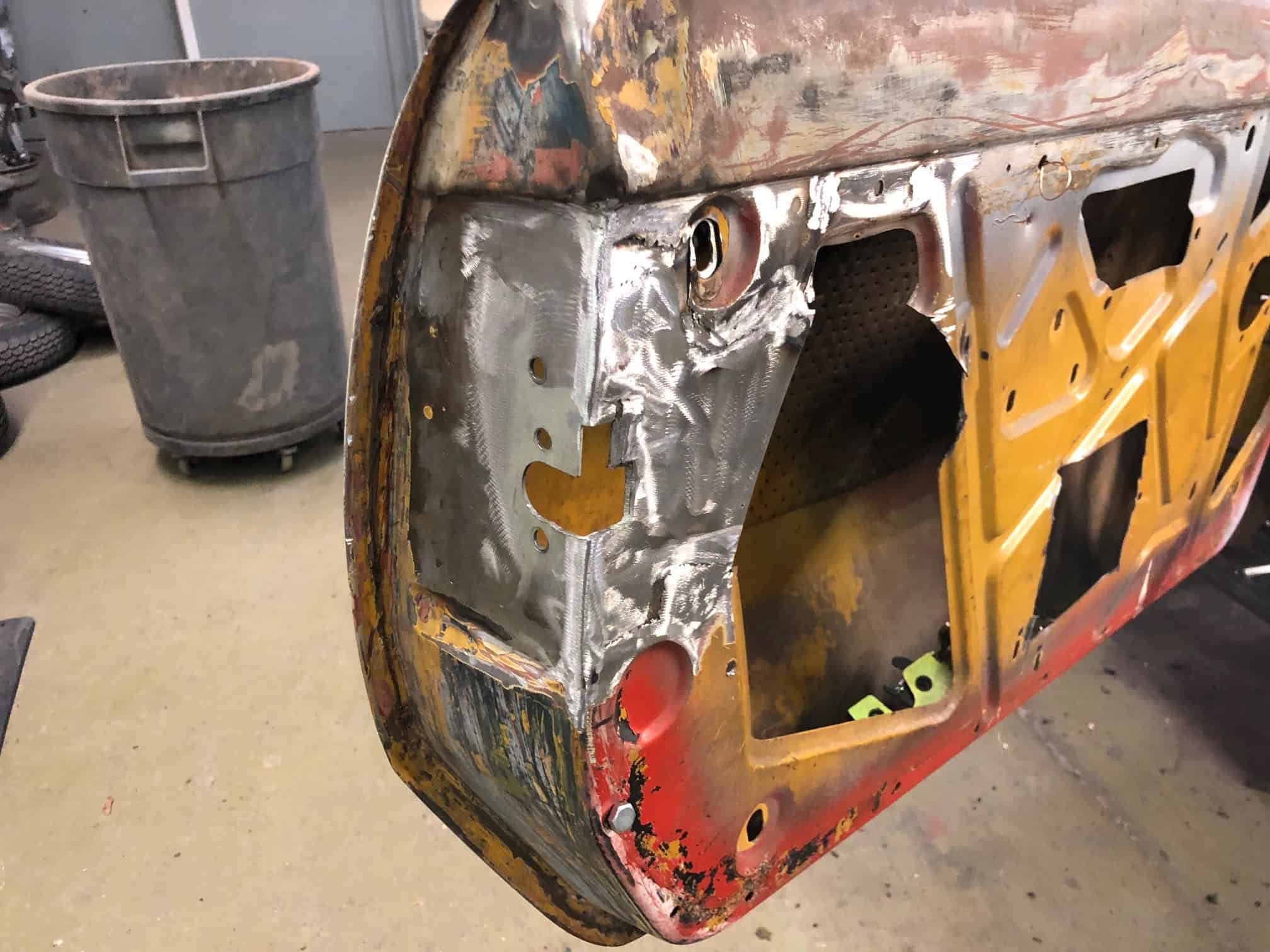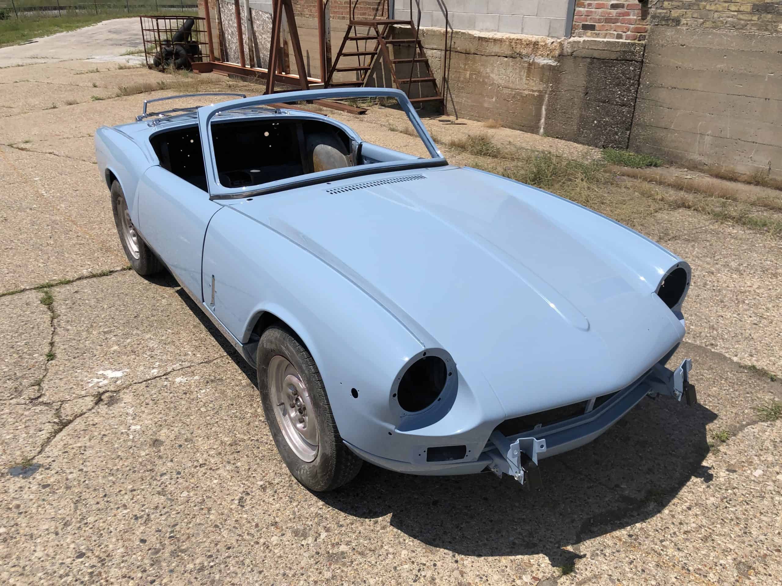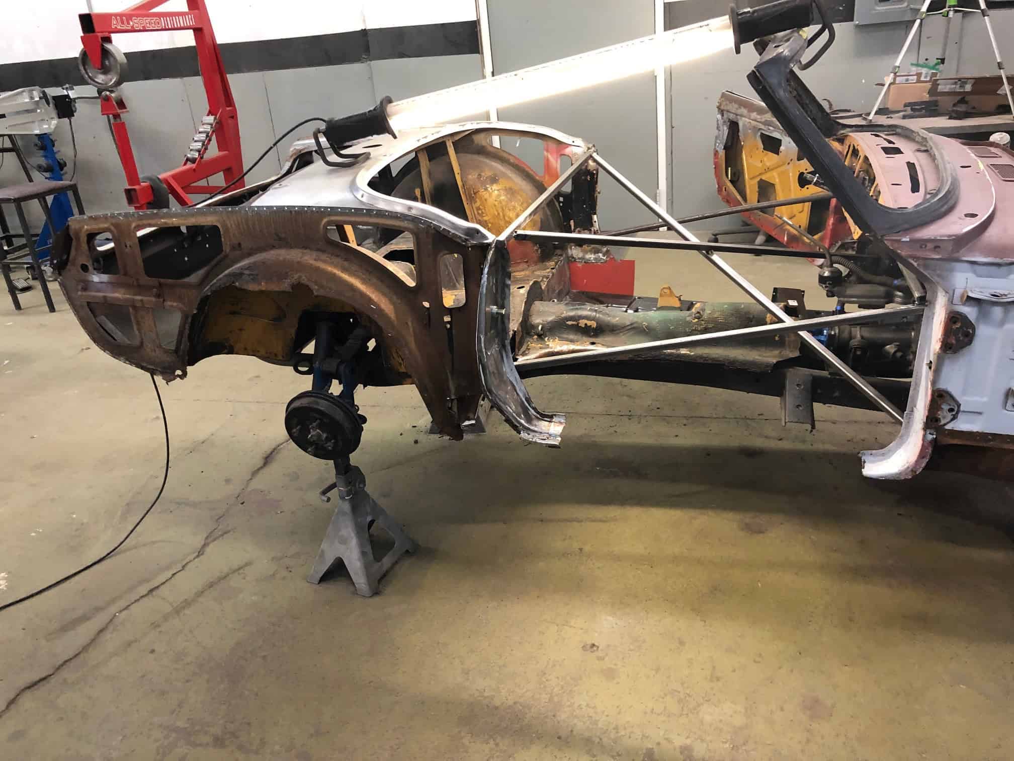 This Triumph came to us in very rough condition. The body had been patched several times and much of the structure and body panels were badly rusted. We removed several of the old body panels including the complete floor boards, inner and outer rocker panel, both complete 1/4 panels and the rear valance panel. After repairing or replacing all of the rusted panels we completed all of the bodywork and continued to spray the car with PPG envirobase bisect and PPG Global high gloss clear coat.