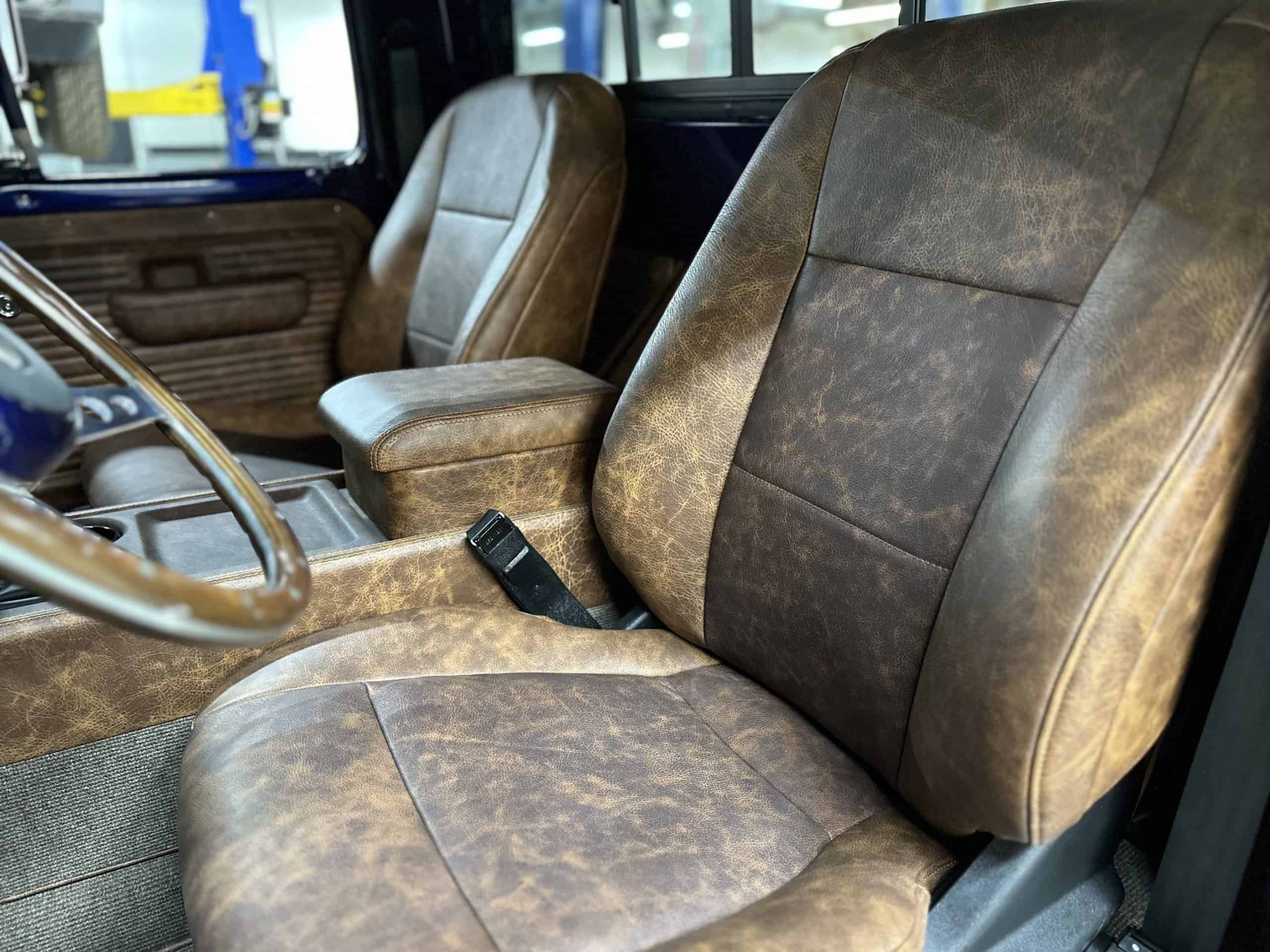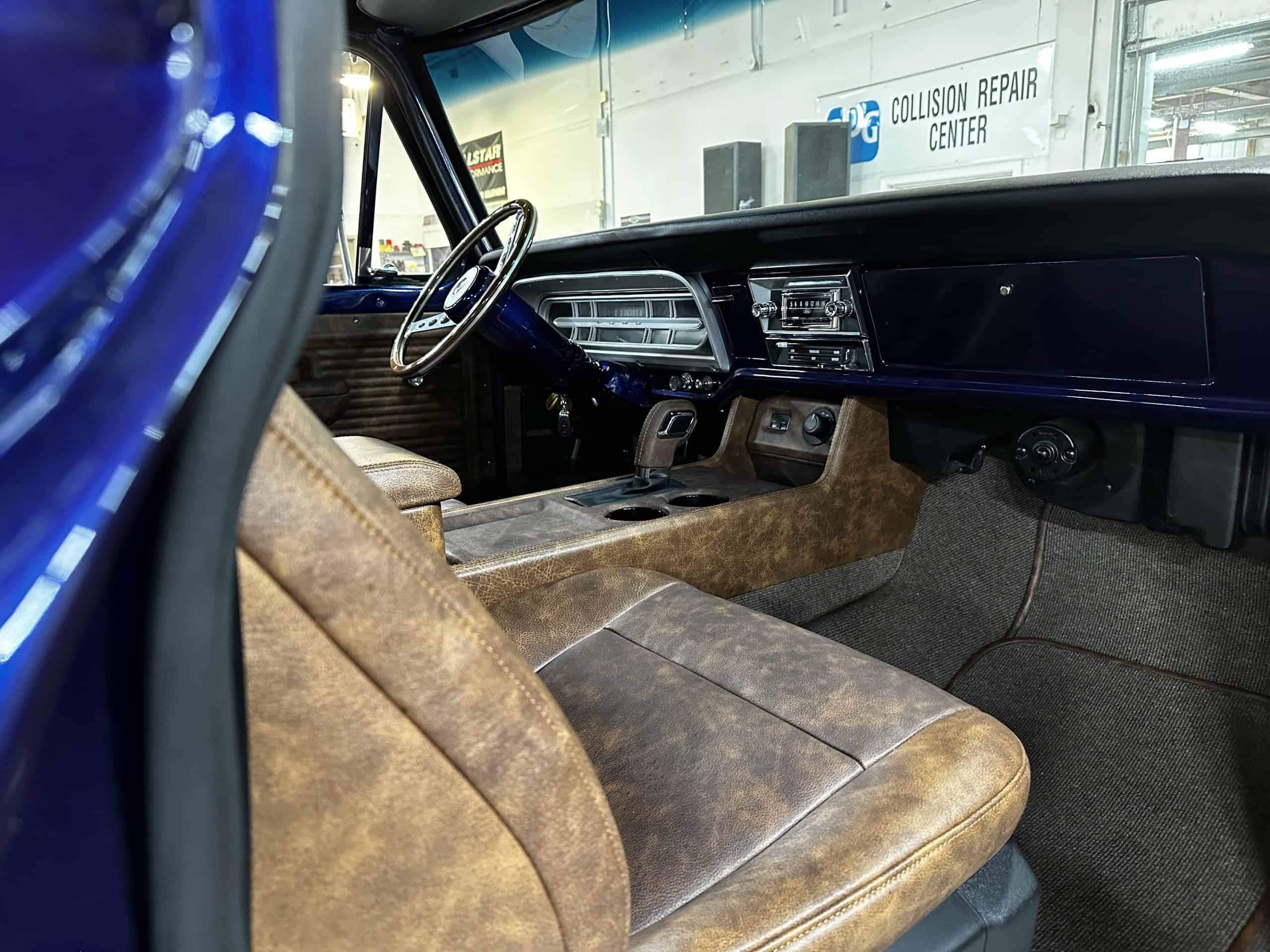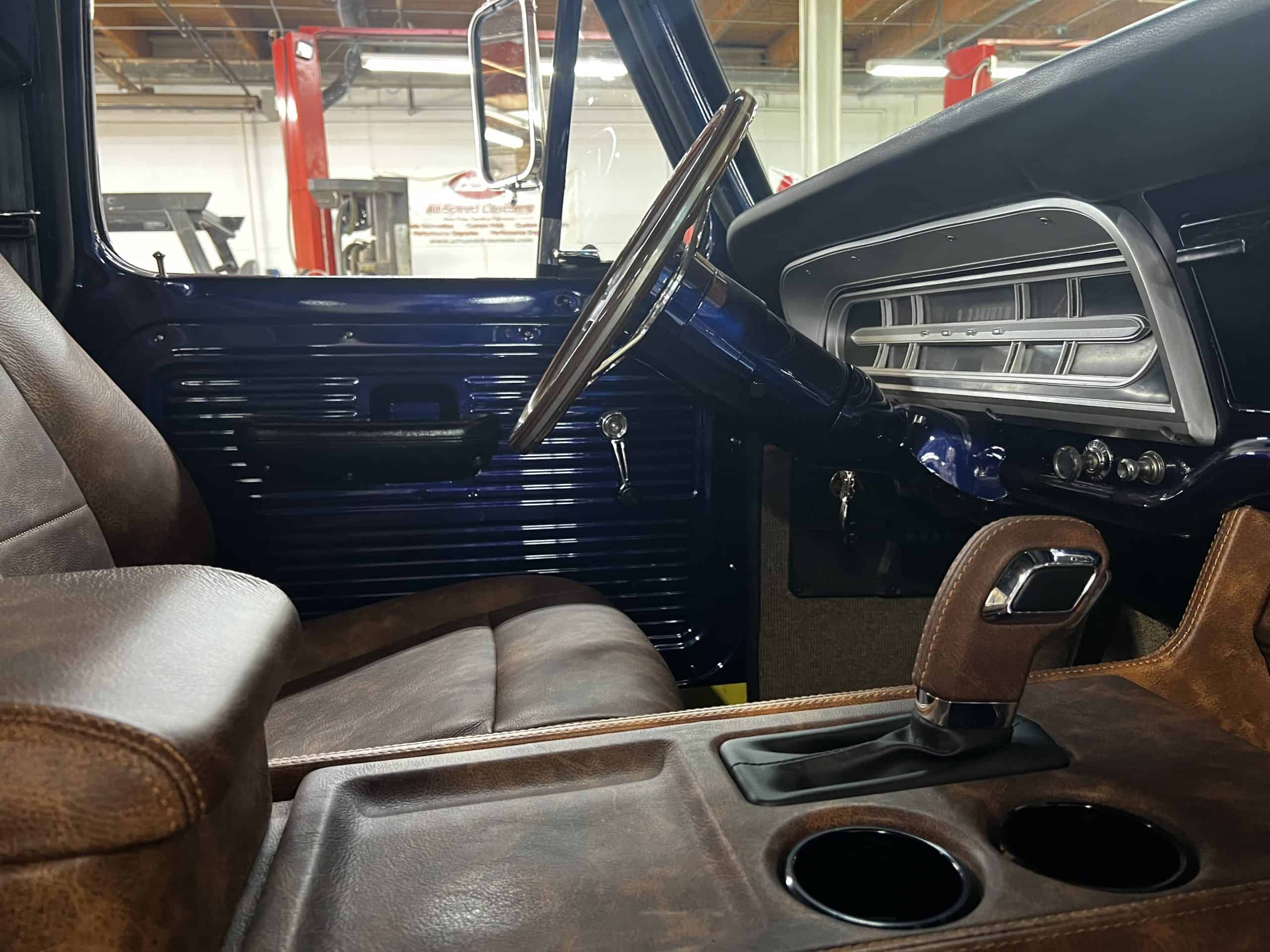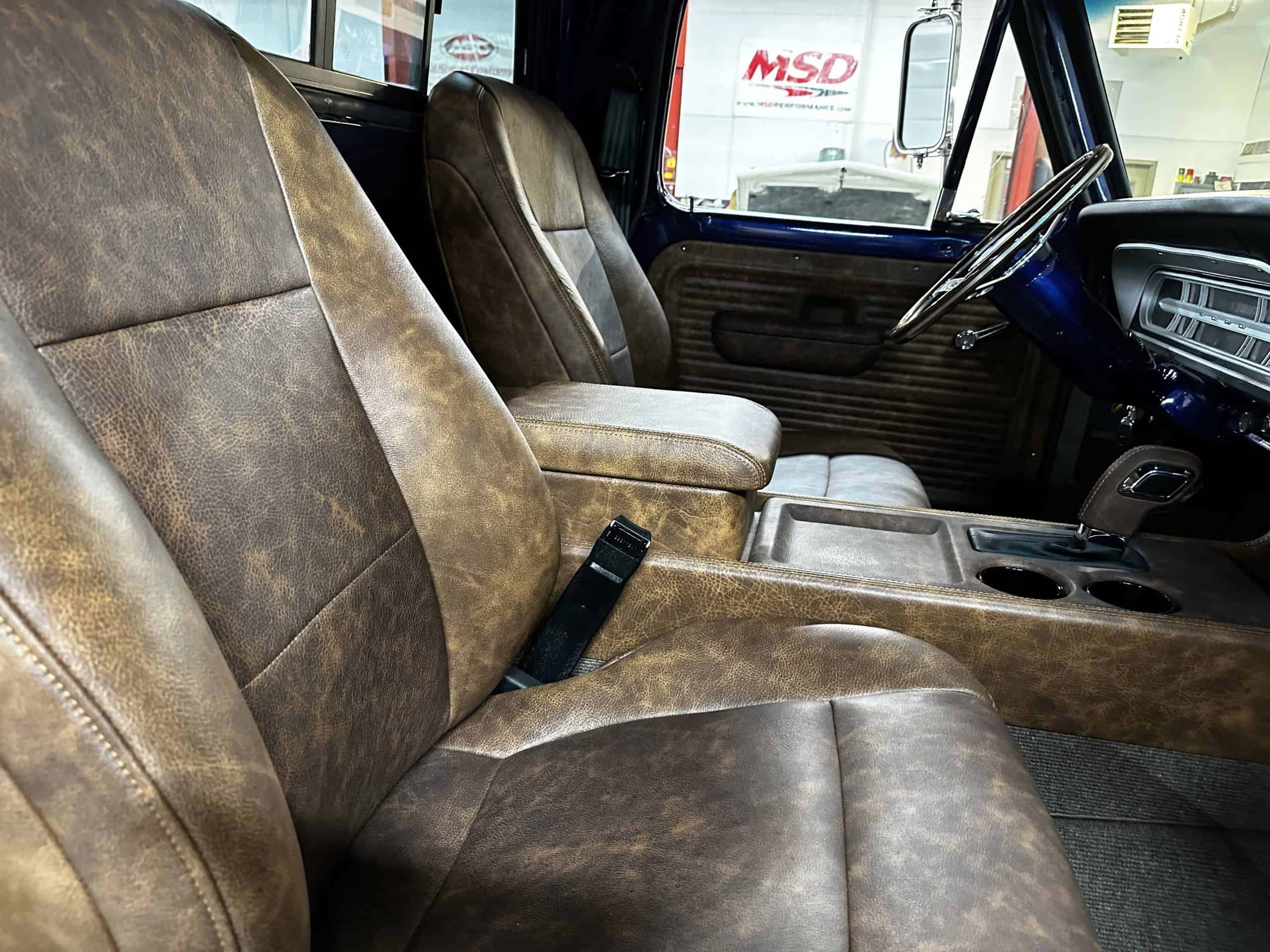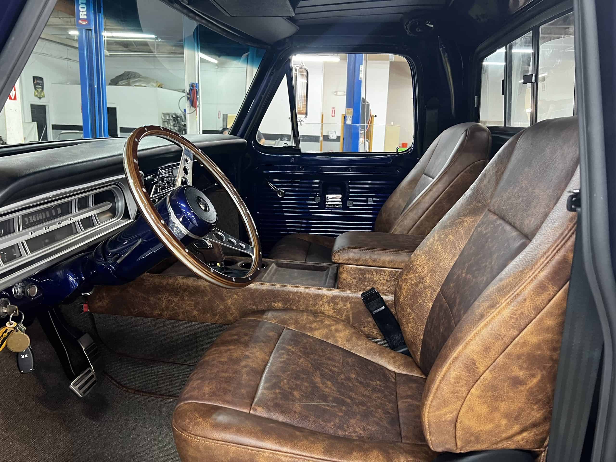 1975 FORD F-250 4 x 4 with a 4″ lift 40″ tires and a Coyote 5.0 L swap to turn them. This is a beautiful classic F250 with just the right amount of modern technology to make it look and drive much better than the original. We upgraded the suspension and steering, converted to disc brakes, swapped the engine to a 5.0 L Coyote with automatic transmission and push button transfer case, completely restored the body and then built a fully customized leather interior with power bucket seats and a full length center console.