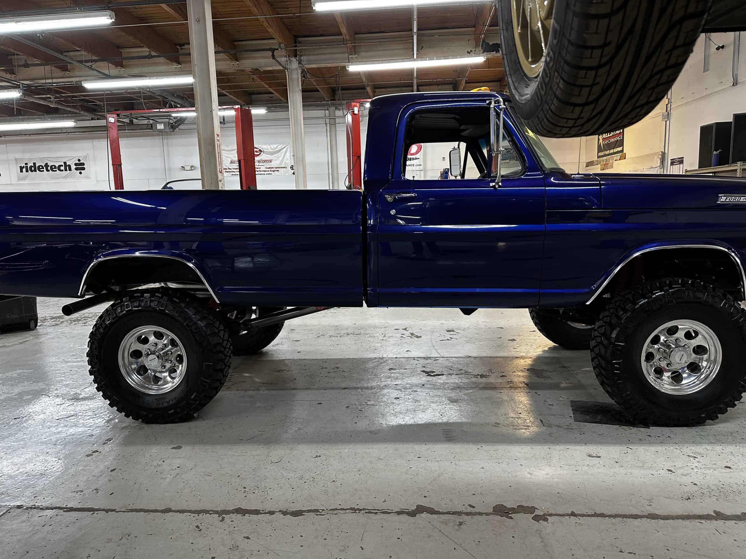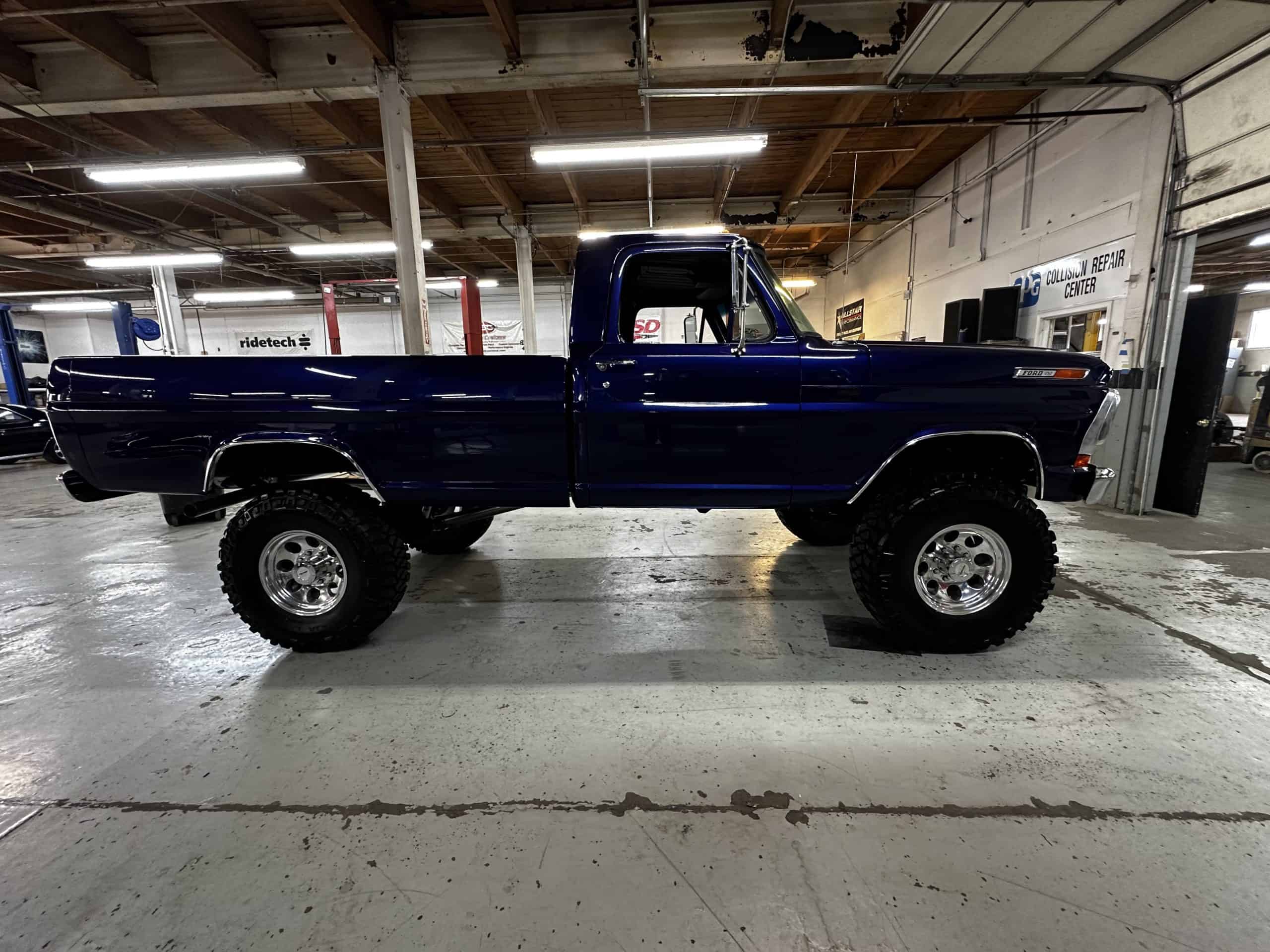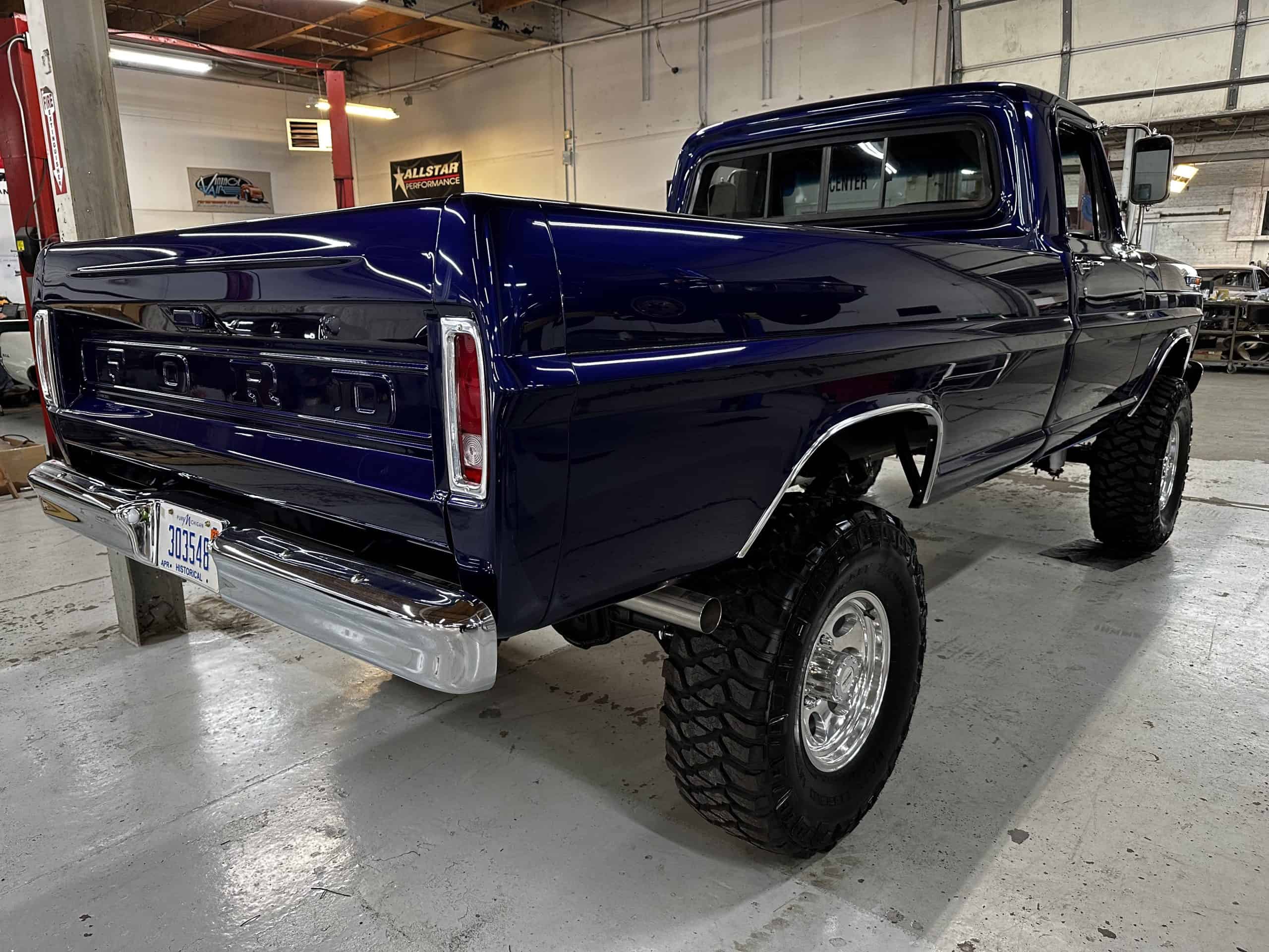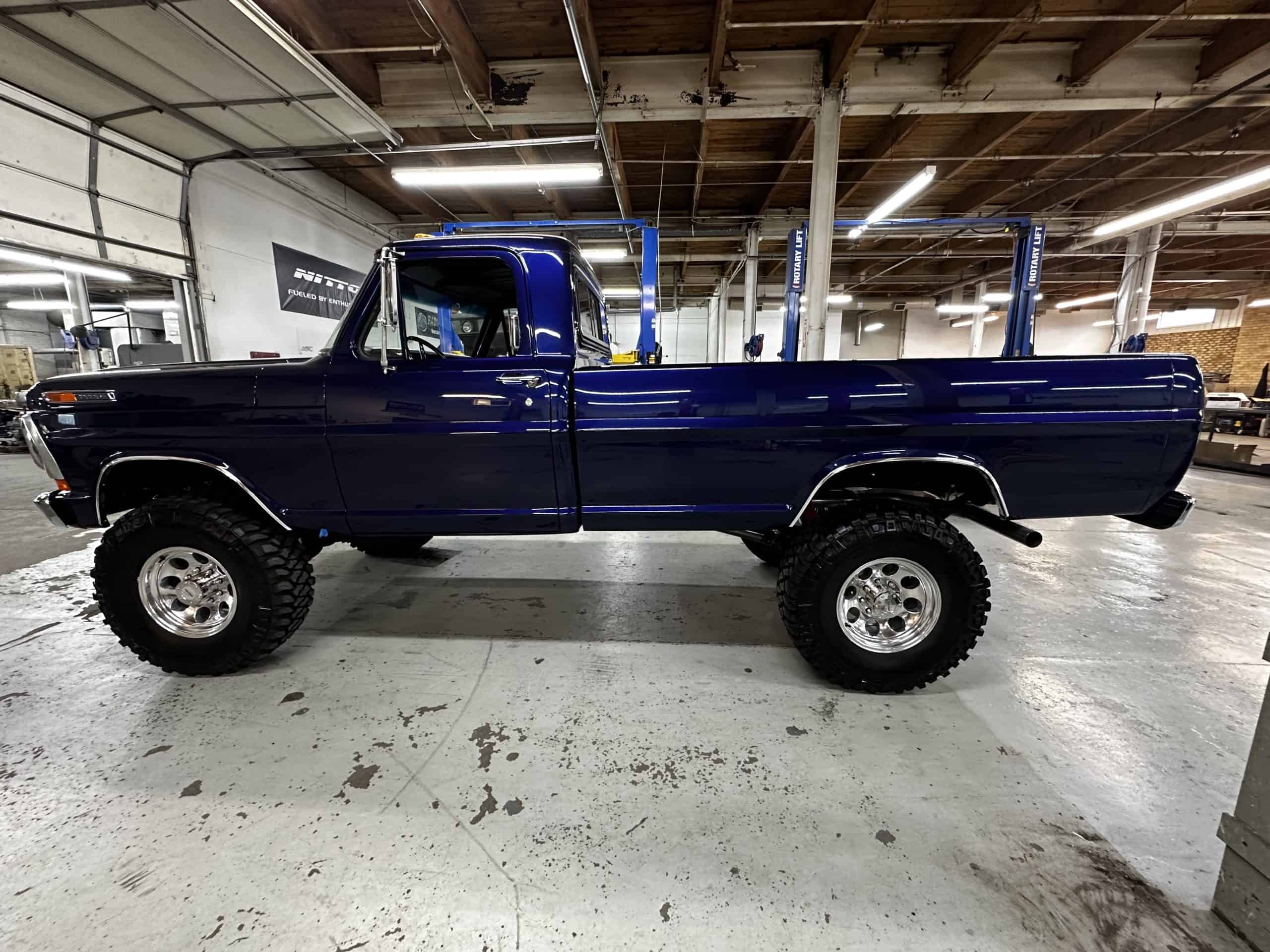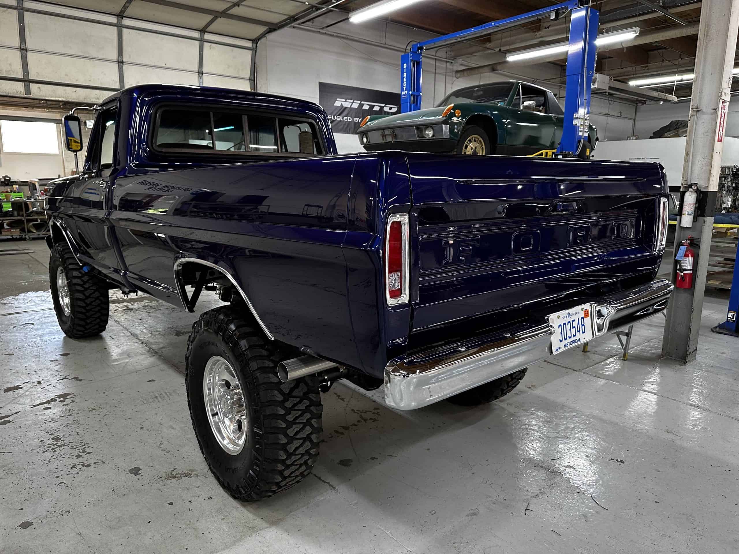 1975 FORD F-250 4 x 4 with a 4″ lift 40″ tires and a Coyote 5.0 L swap to turn them. This is a beautiful classic F250 with just the right amount of modern technology to make it look and drive much better than the original. We upgraded the suspension and steering, converted to disc brakes, swapped the engine to a 5.0 L Coyote with automatic transmission and push button transfer case, completely restored the body and then built a fully customized leather interior with power bucket seats and a full length center console.