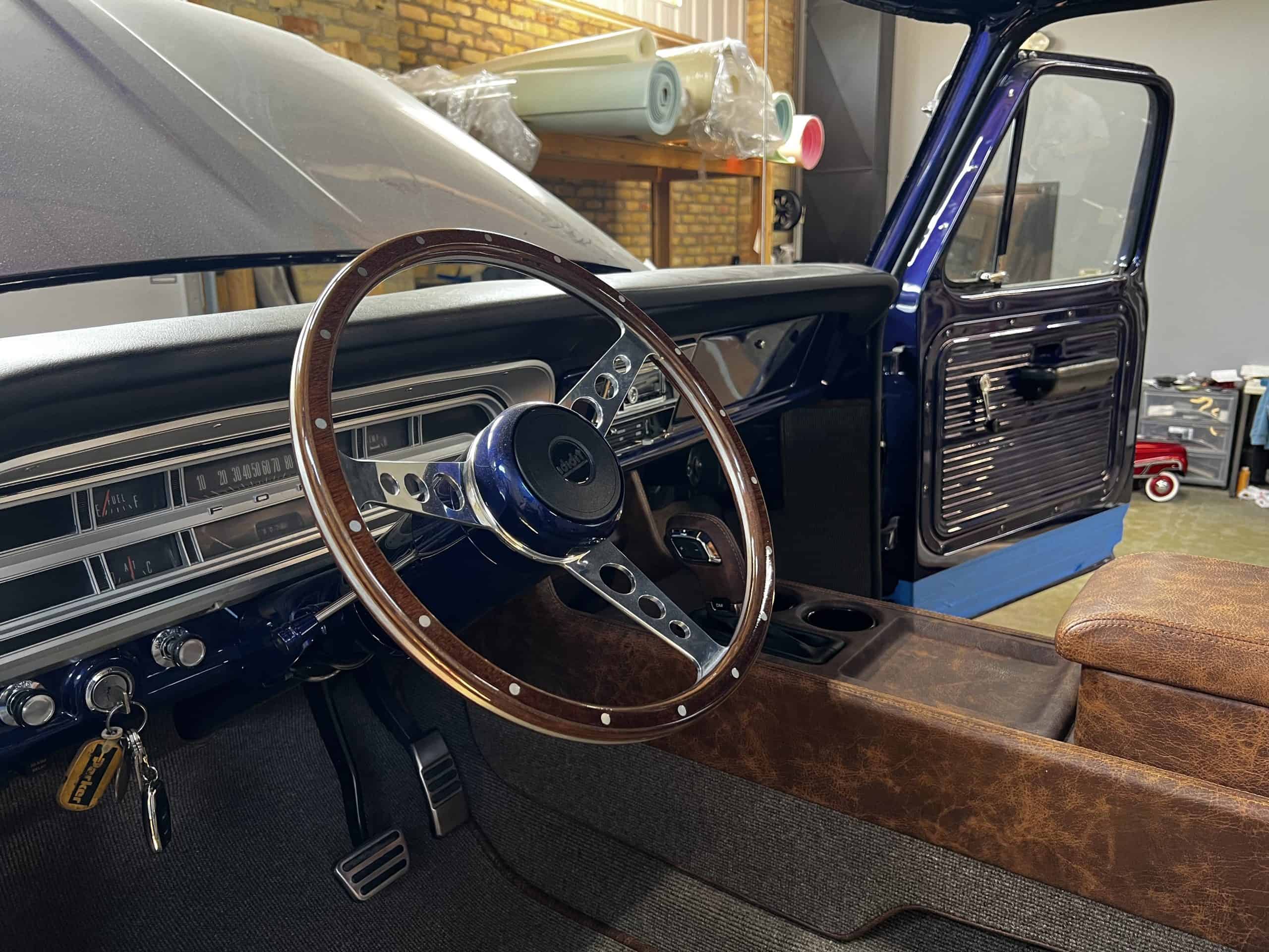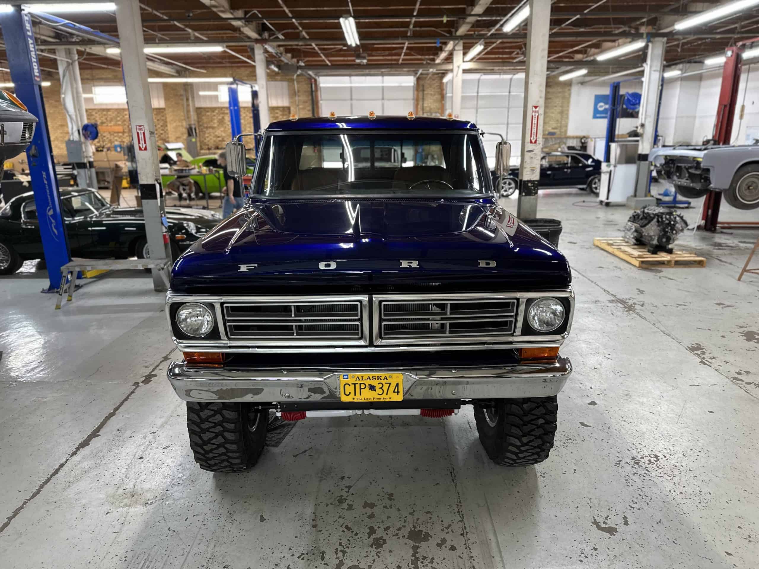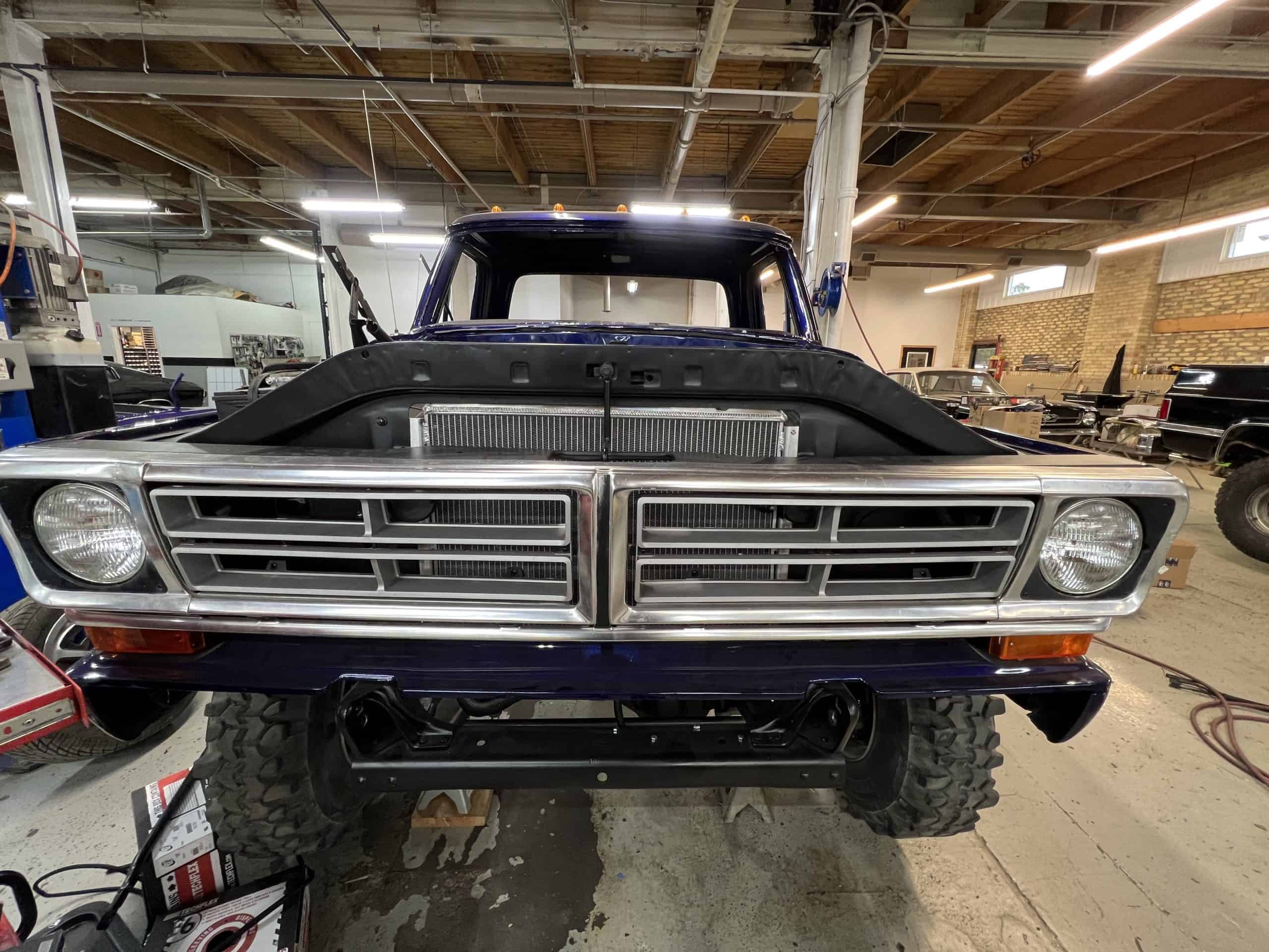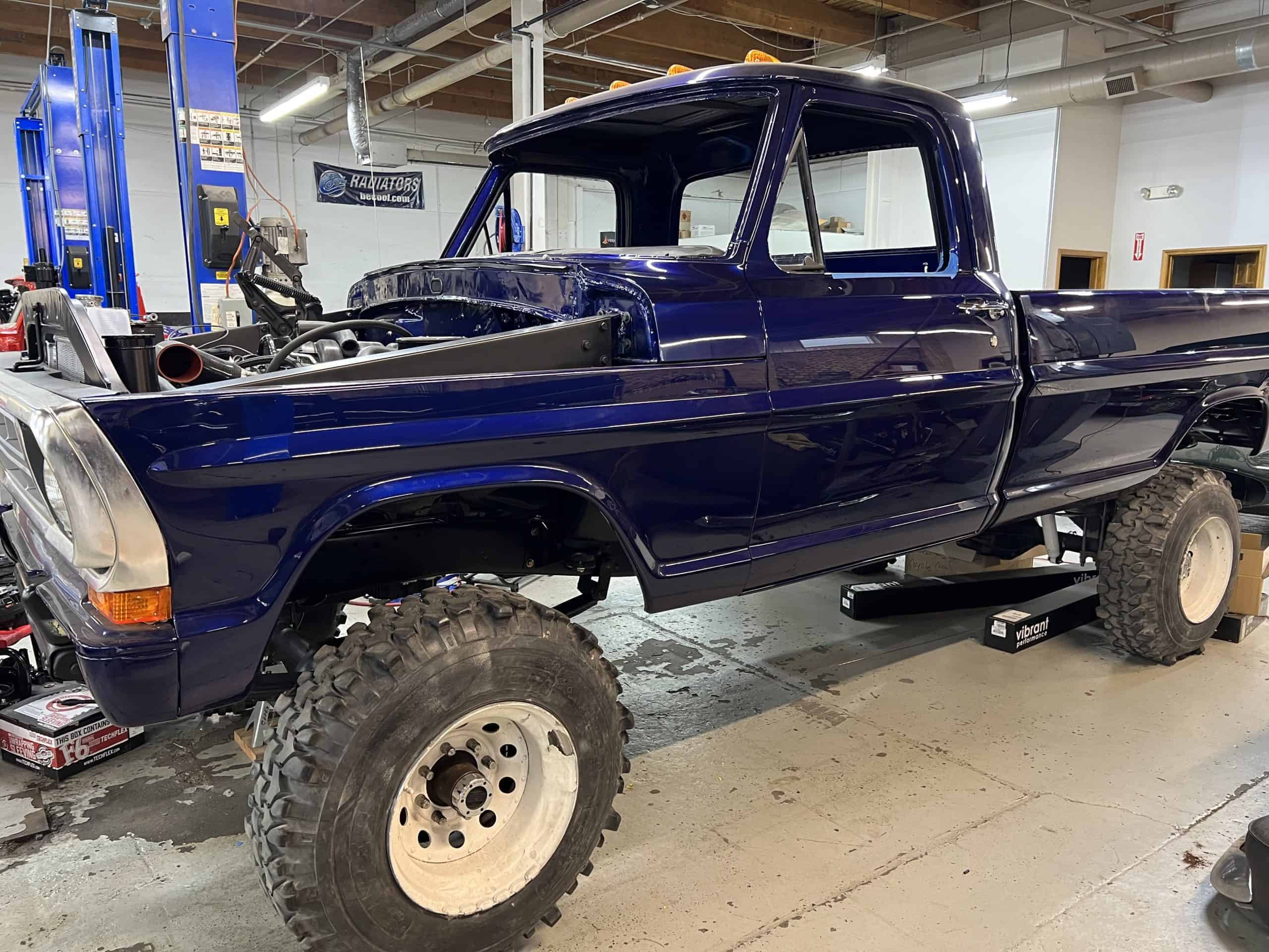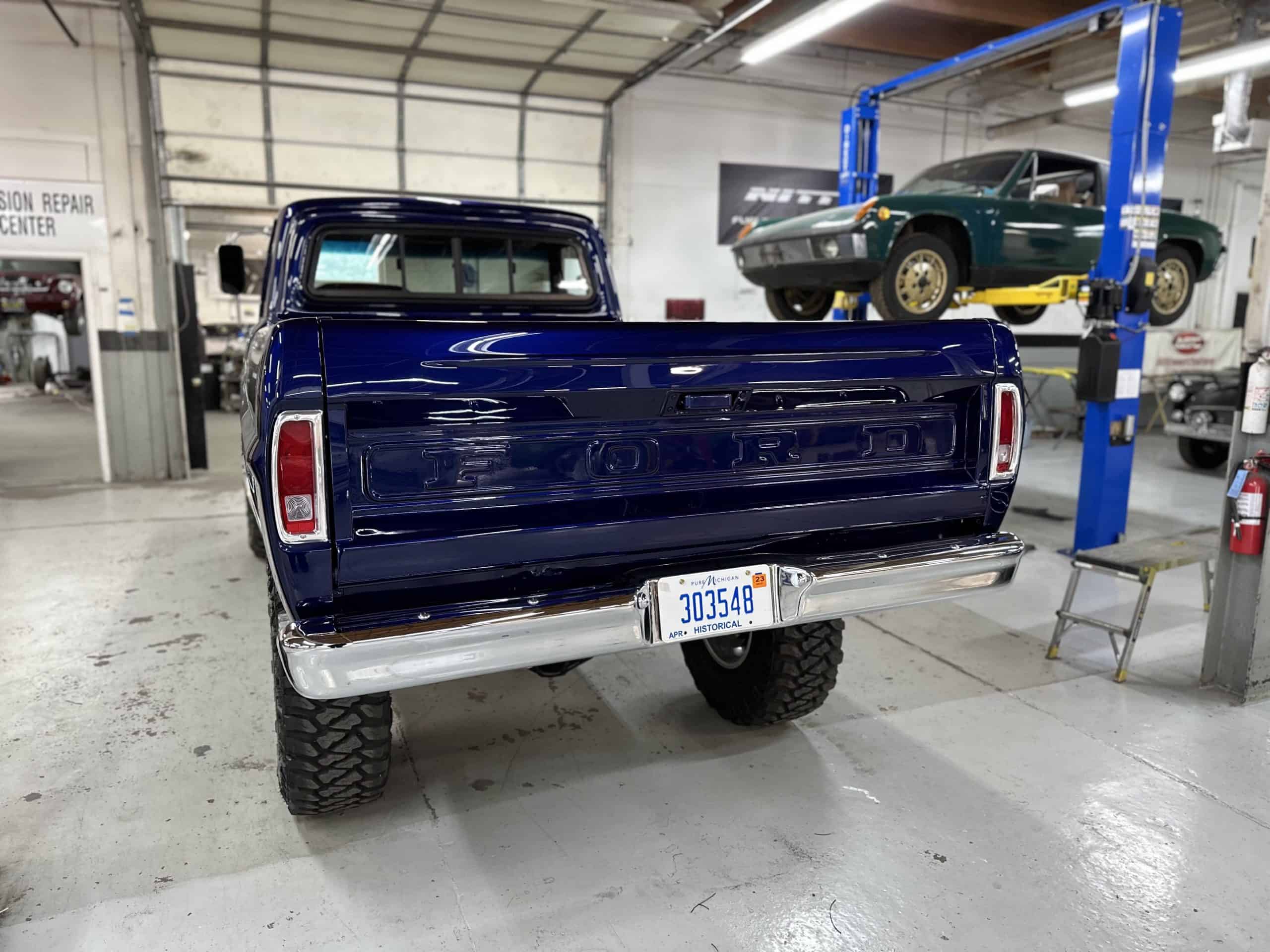 1975 FORD F-250 4 x 4 with a 4″ lift 40″ tires and a Coyote 5.0 L swap to turn them. This is a beautiful classic F250 with just the right amount of modern technology to make it look and drive much better than the original. We upgraded the suspension and steering, converted to disc brakes, swapped the engine to a 5.0 L Coyote with automatic transmission and push button transfer case, completely restored the body and then built a fully customized leather interior with power bucket seats and a full length center console.