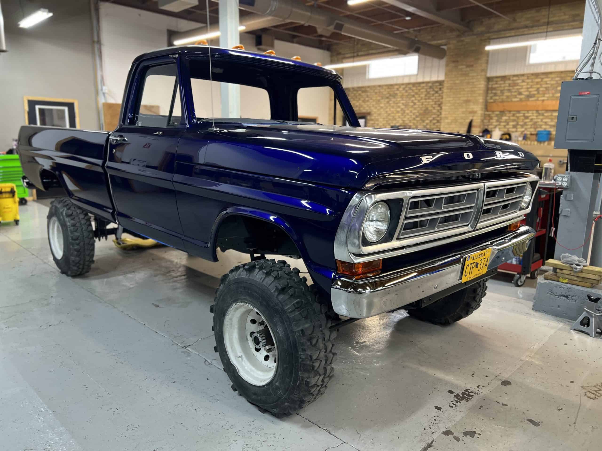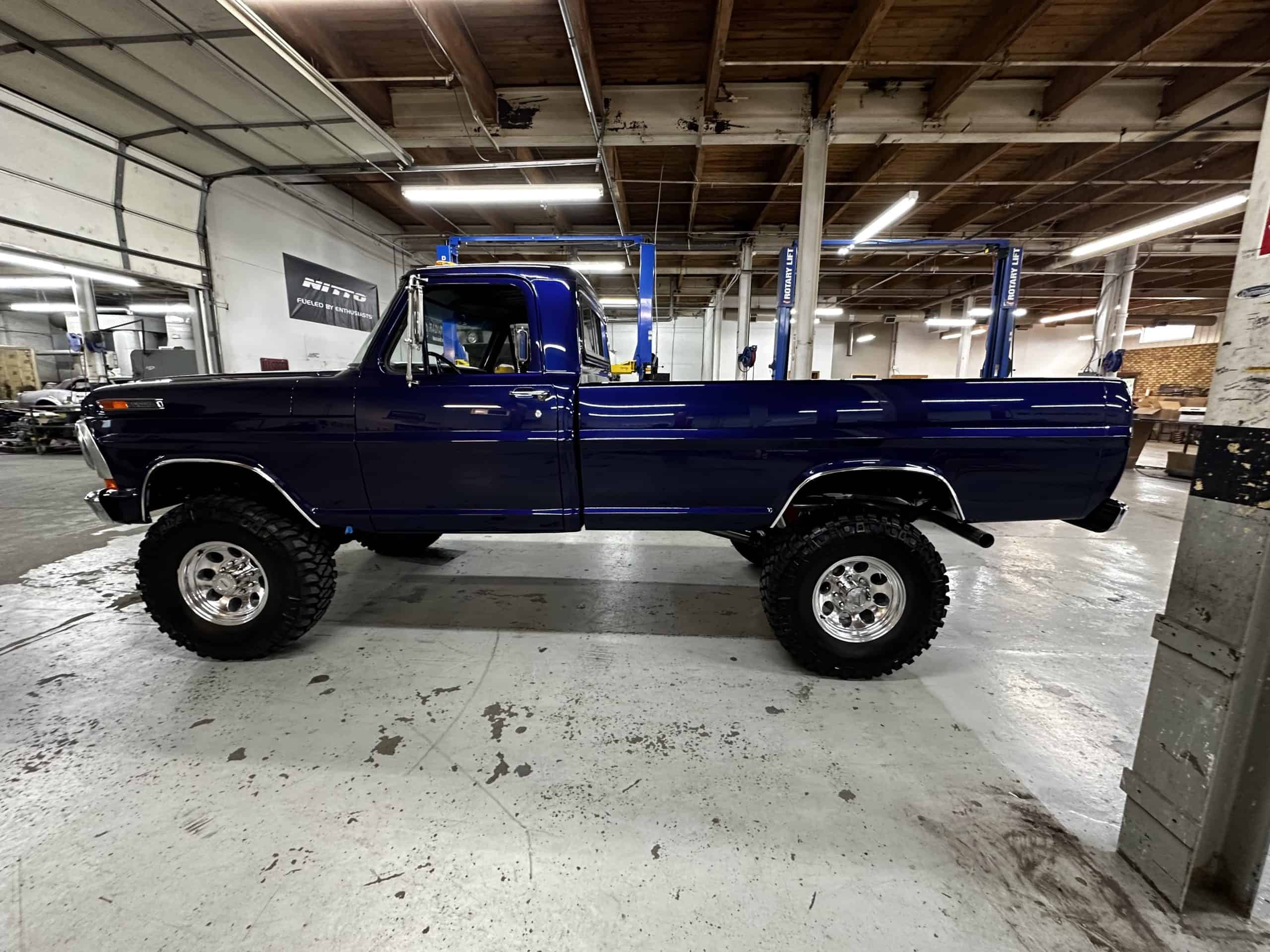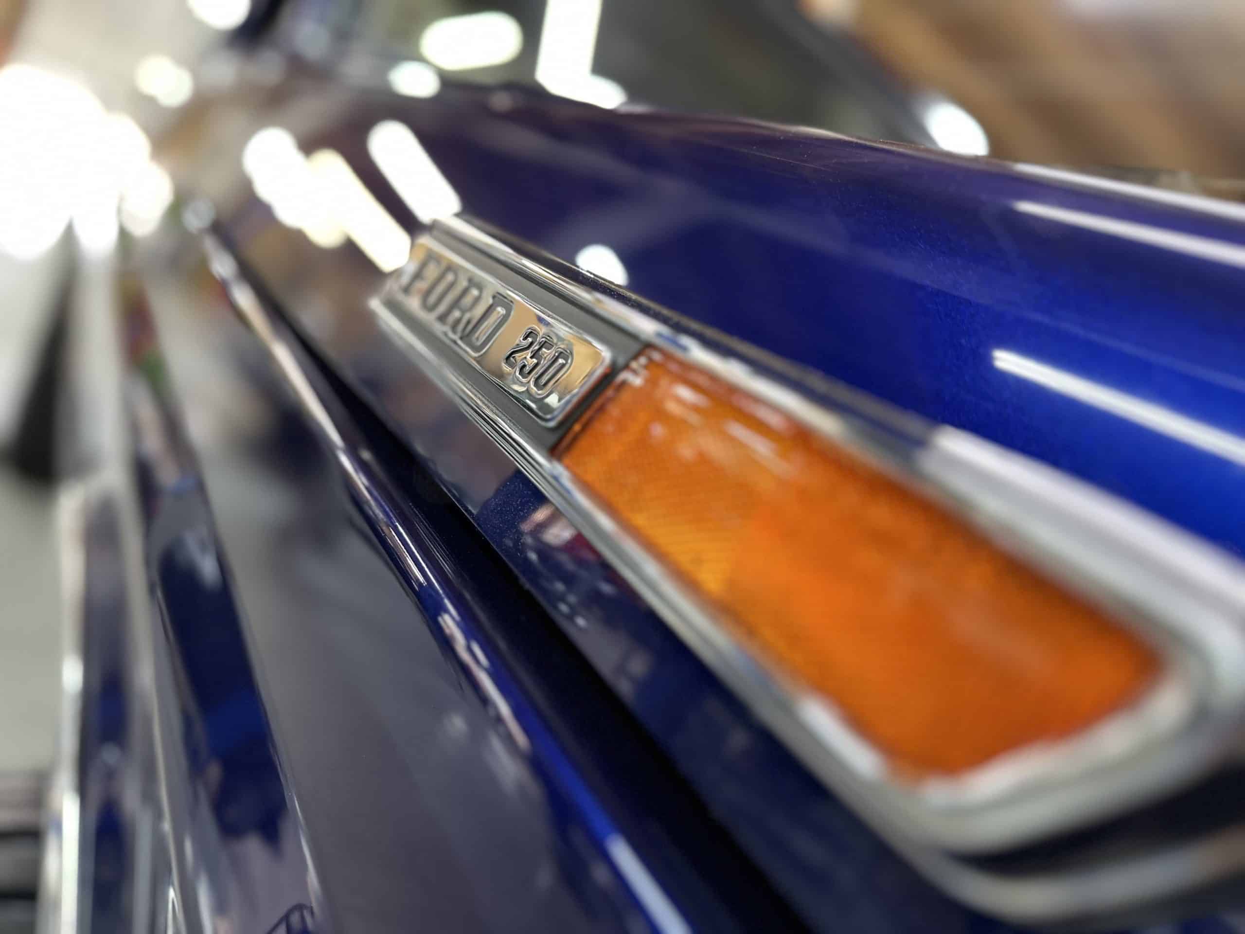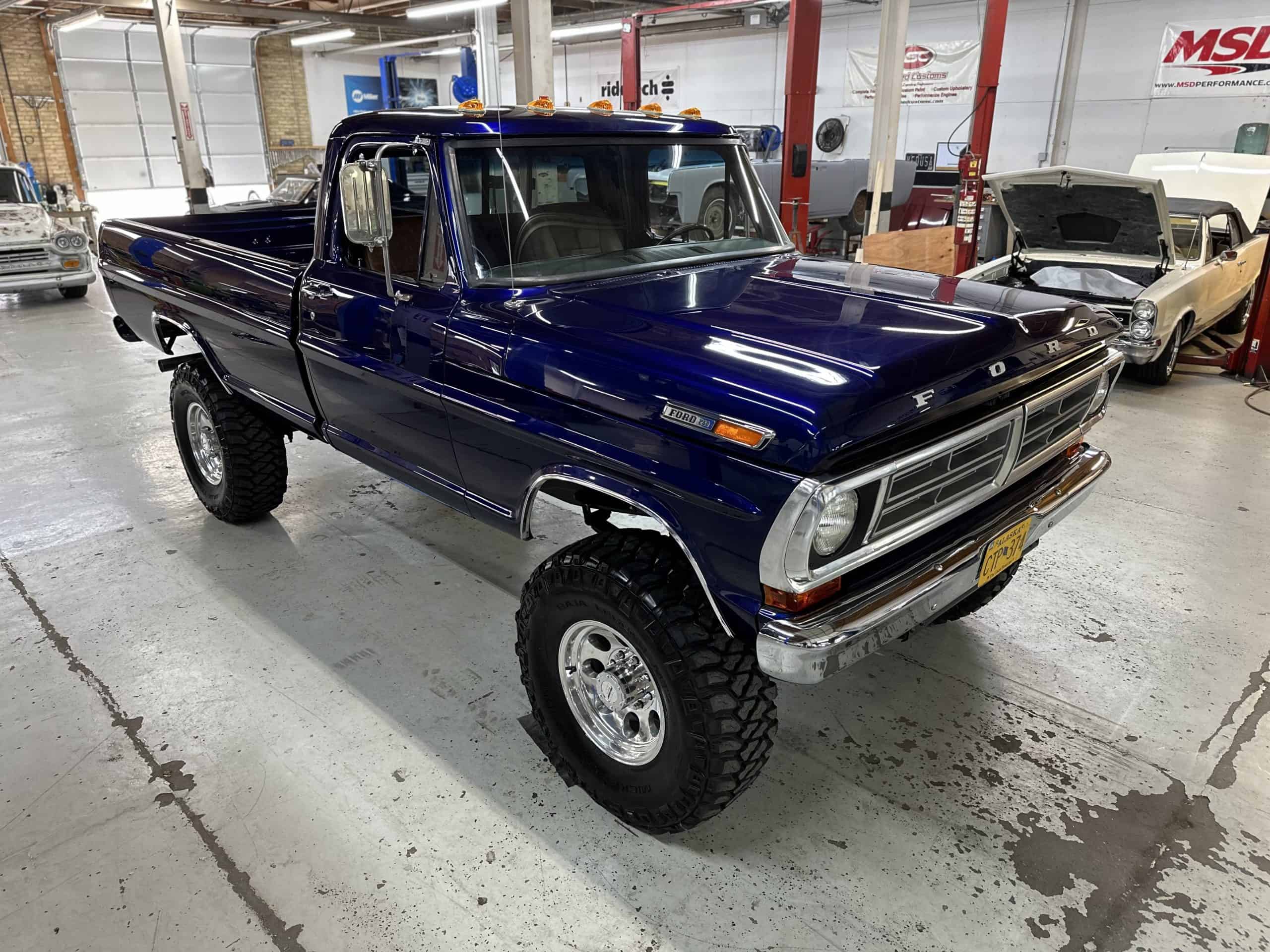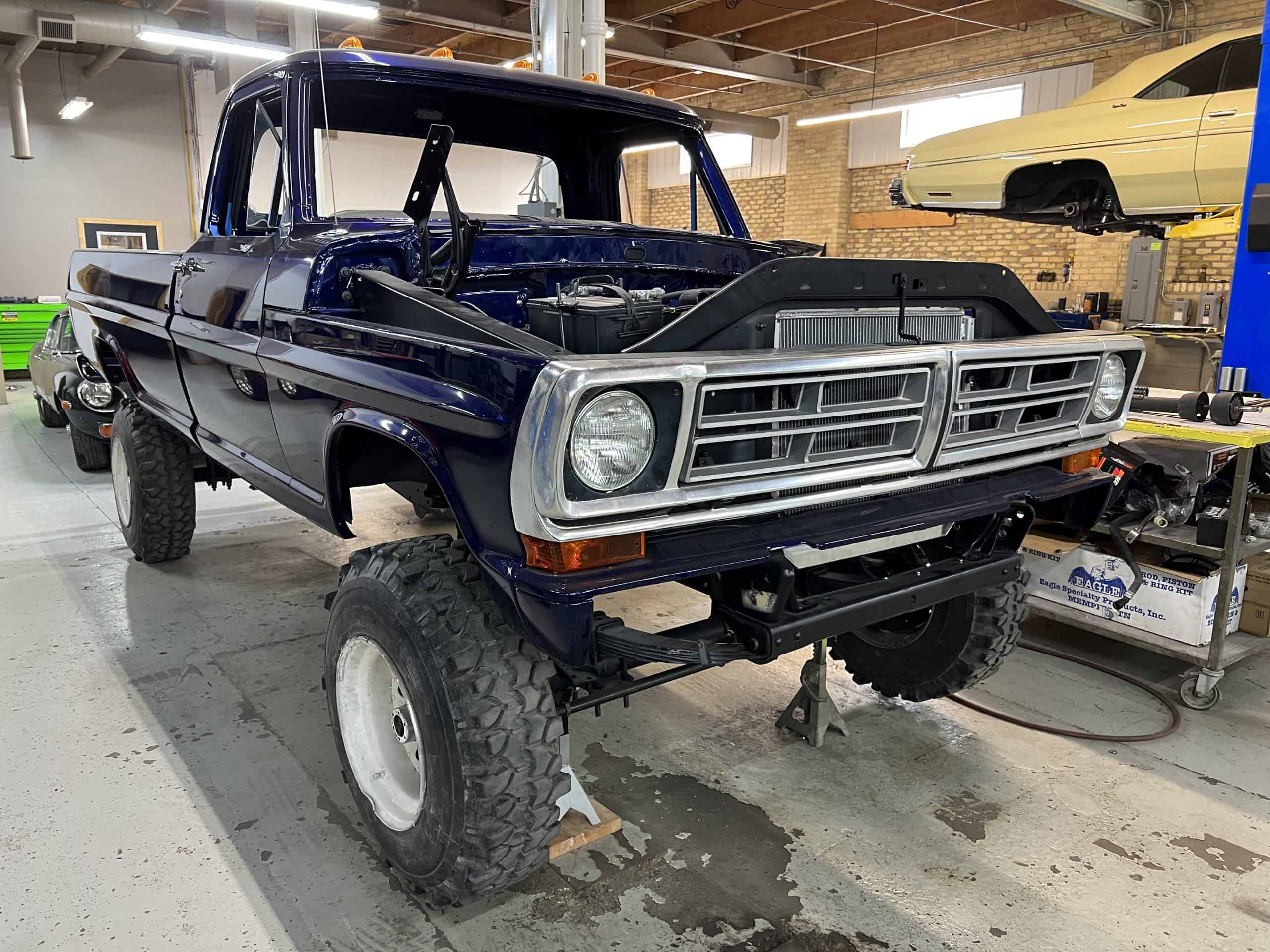 1975 FORD F-250 4 x 4 with a 4″ lift 40″ tires and a Coyote 5.0 L swap to turn them. This is a beautiful classic F250 with just the right amount of modern technology to make it look and drive much better than the original. We upgraded the suspension and steering, converted to disc brakes, swapped the engine to a 5.0 L Coyote with automatic transmission and push button transfer case, completely restored the body and then built a fully customized leather interior with power bucket seats and a full length center console.