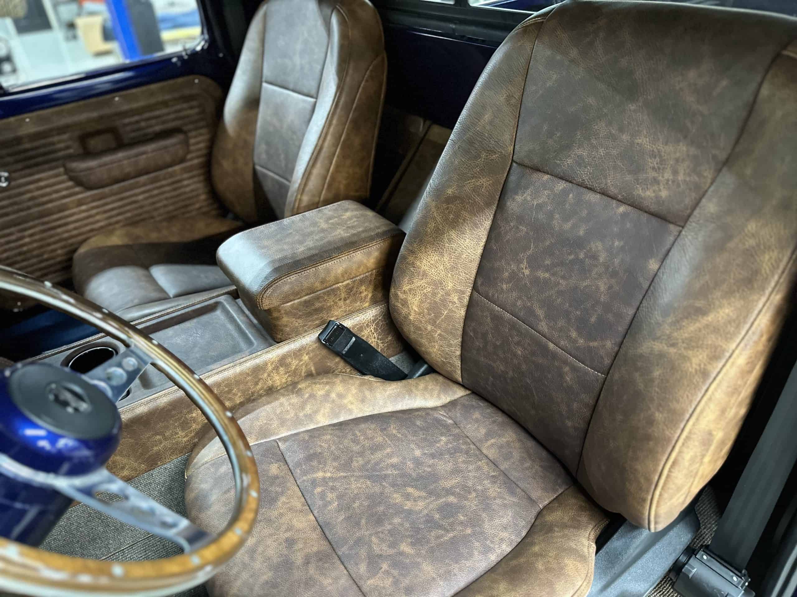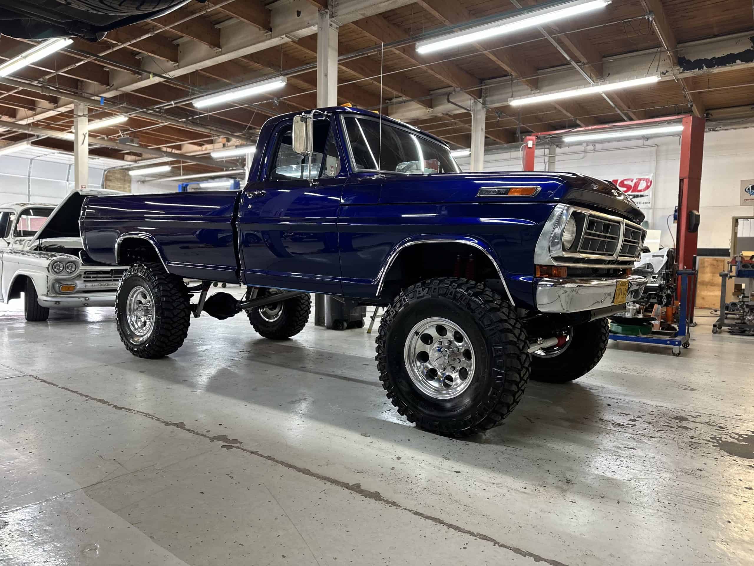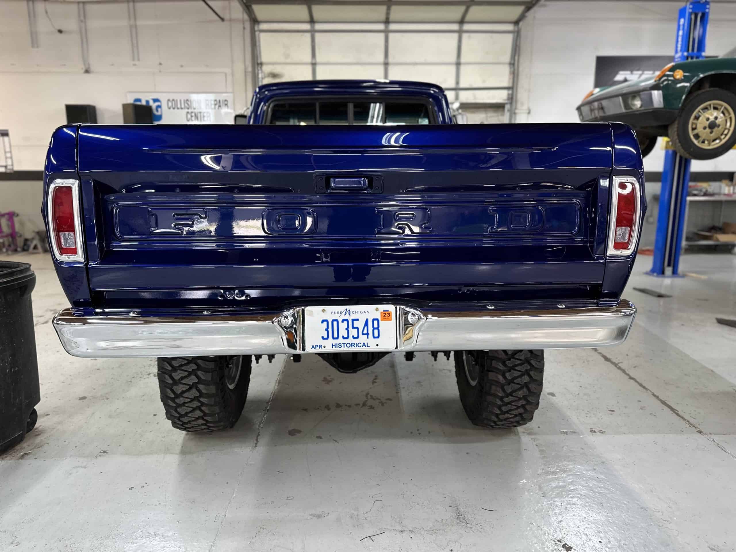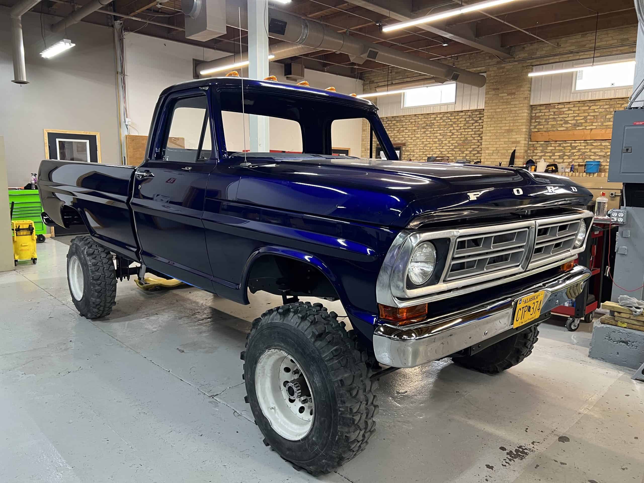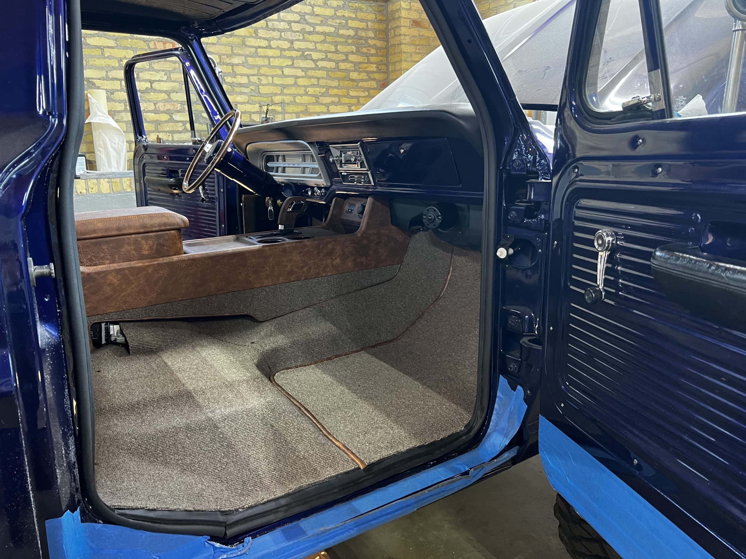 1975 FORD F-250 4 x 4 with a 4″ lift 40″ tires and a Coyote 5.0 L swap to turn them. This is a beautiful classic F250 with just the right amount of modern technology to make it look and drive much better than the original. We upgraded the suspension and steering, converted to disc brakes, swapped the engine to a 5.0 L Coyote with automatic transmission and push button transfer case, completely restored the body and then built a fully customized leather interior with power bucket seats and a full length center console.