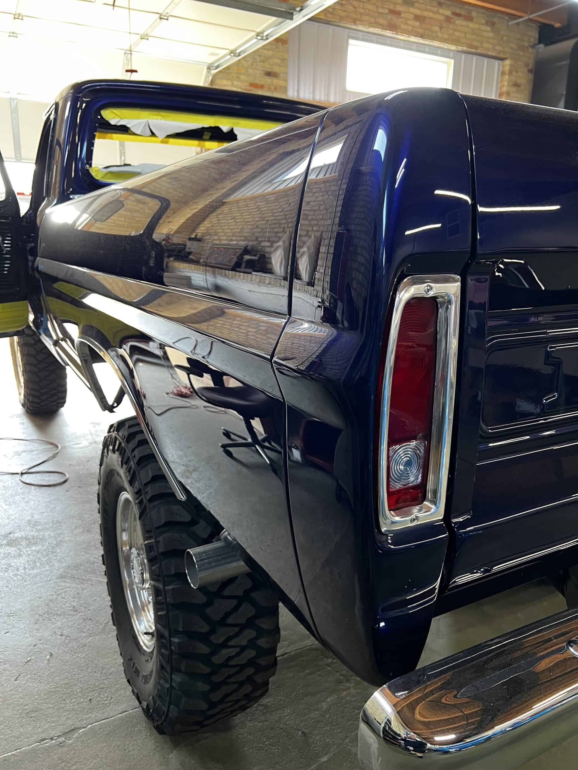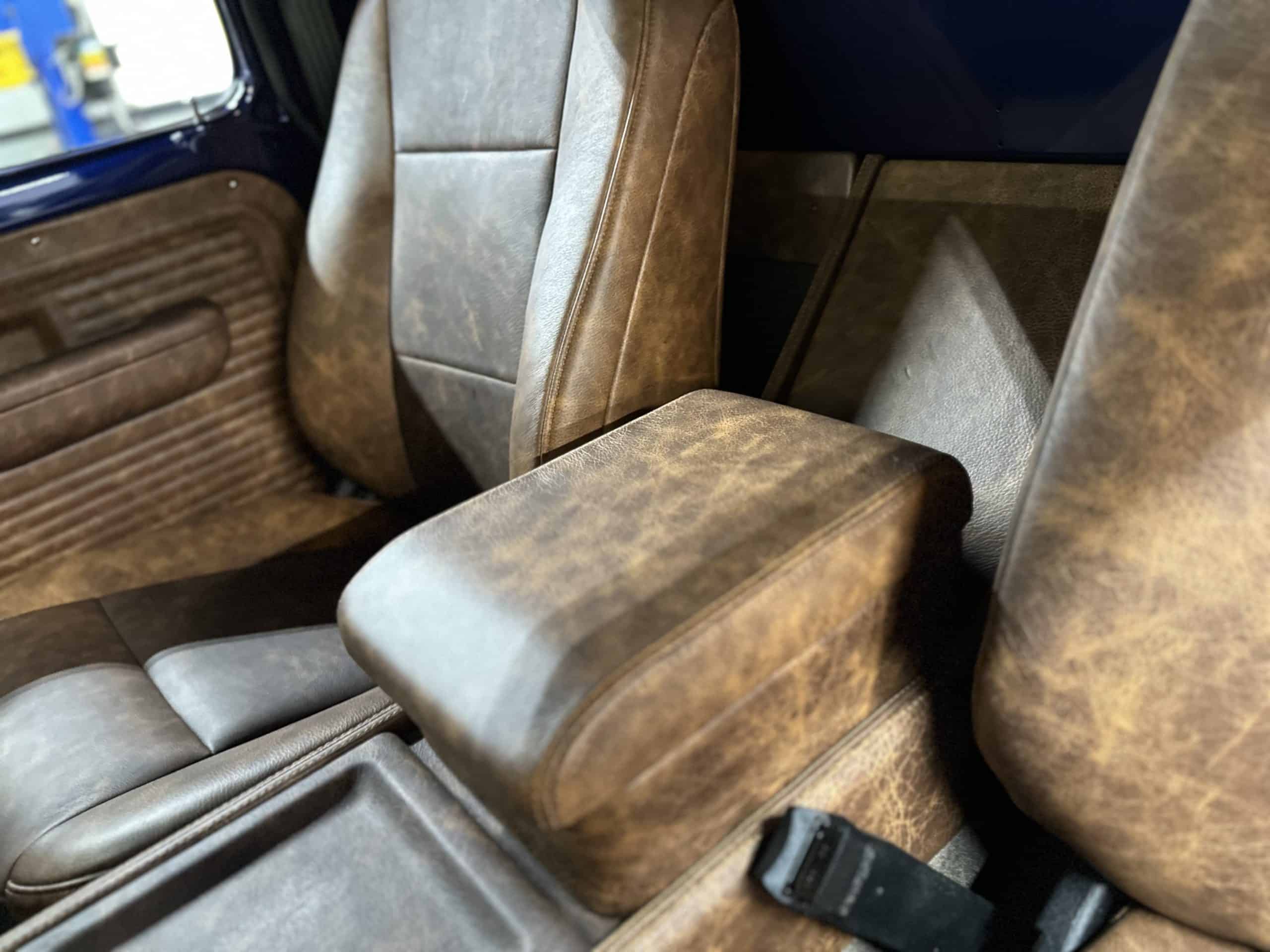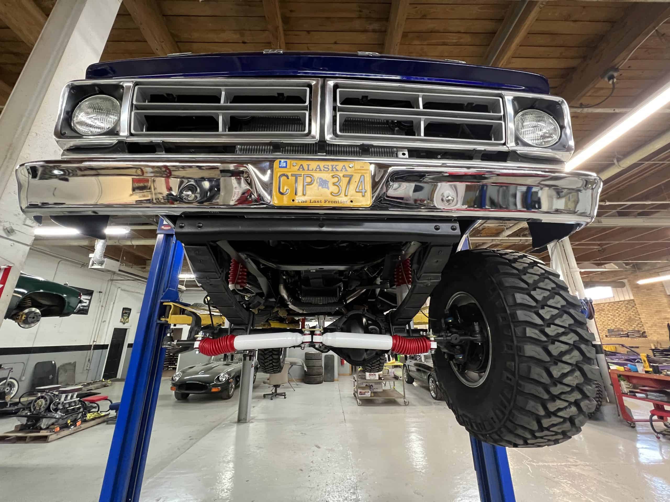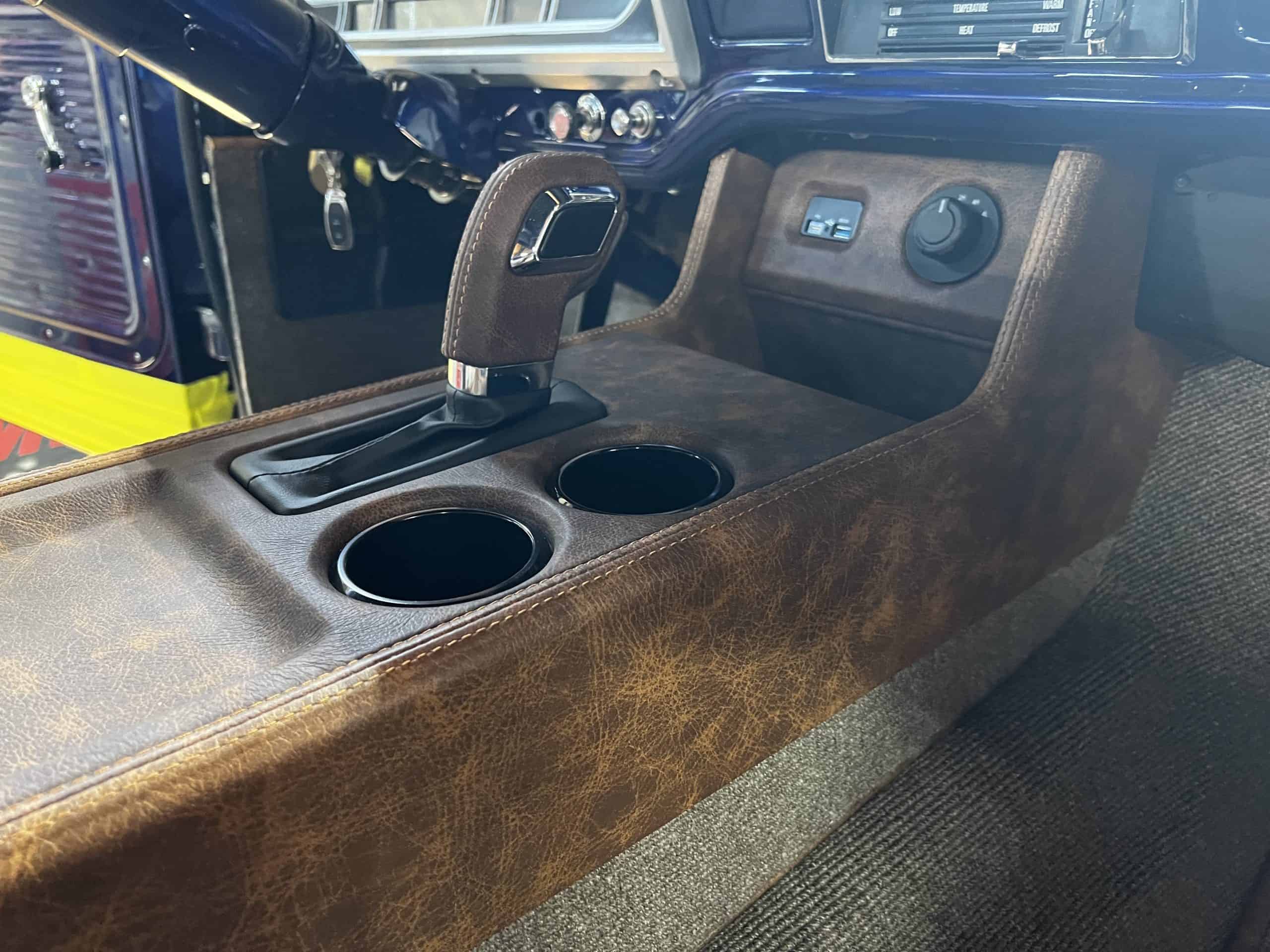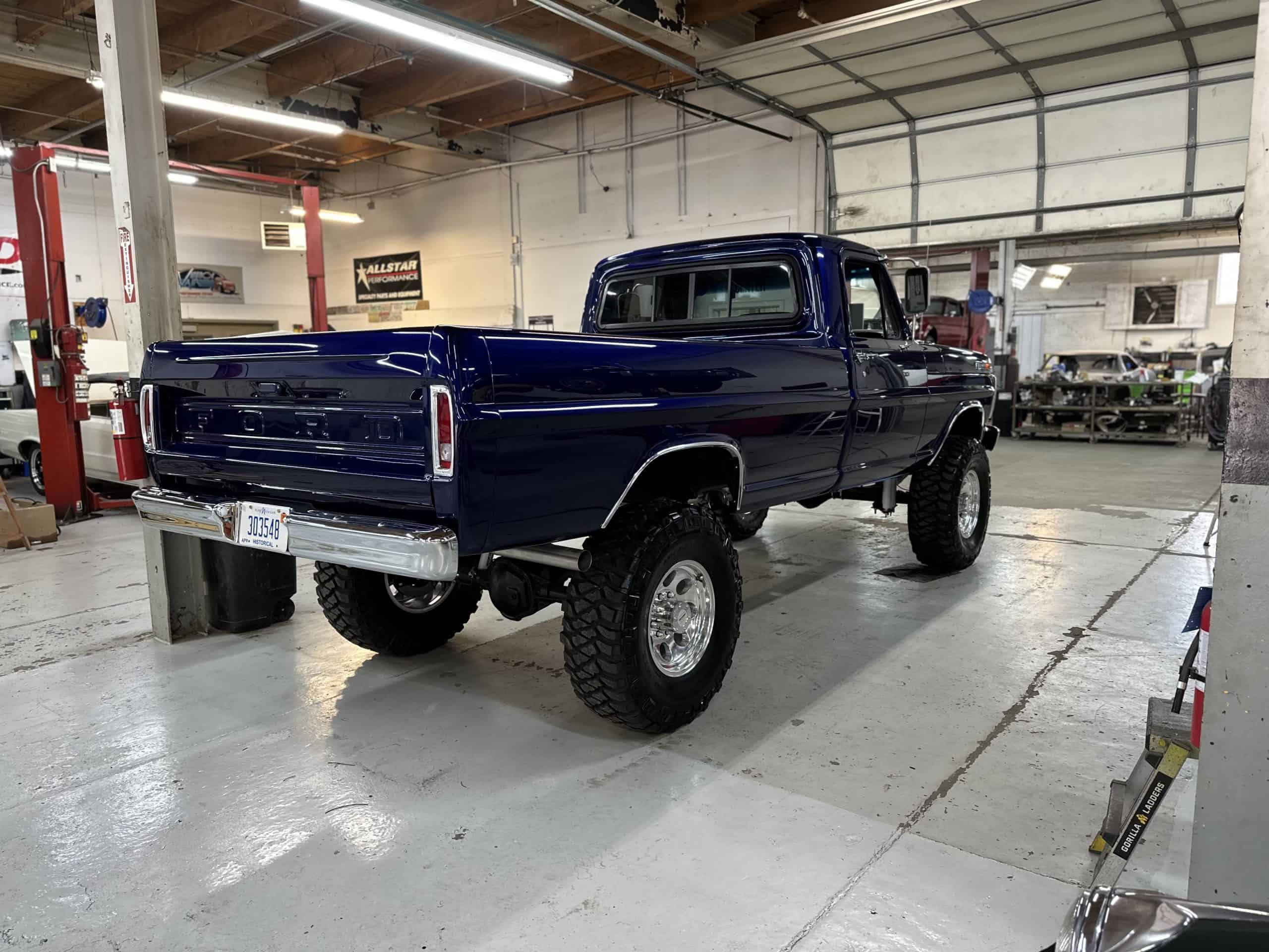 1975 FORD F-250 4 x 4 with a 4″ lift 40″ tires and a Coyote 5.0 L swap to turn them. This is a beautiful classic F250 with just the right amount of modern technology to make it look and drive much better than the original. We upgraded the suspension and steering, converted to disc brakes, swapped the engine to a 5.0 L Coyote with automatic transmission and push button transfer case, completely restored the body and then built a fully customized leather interior with power bucket seats and a full length center console.