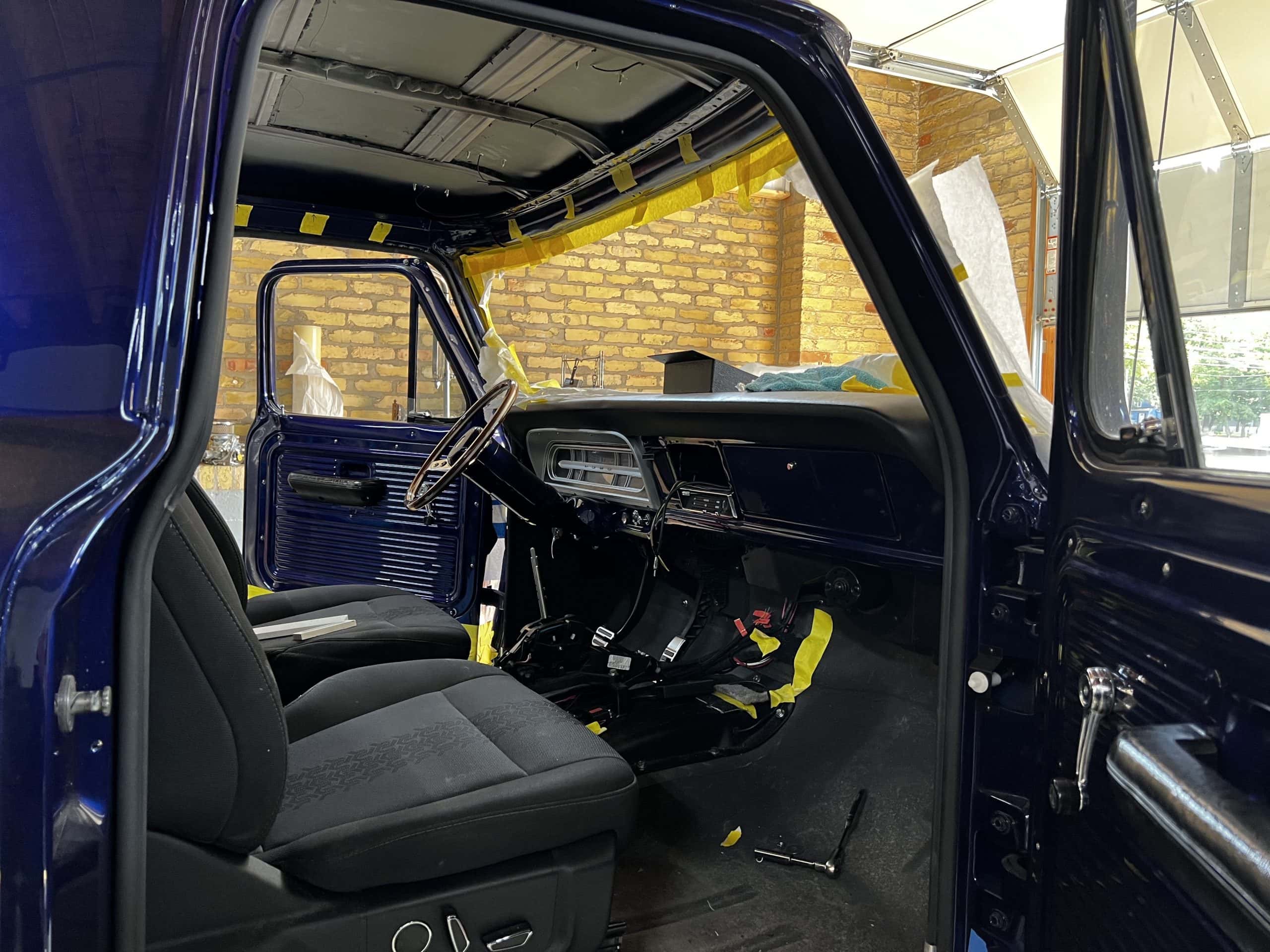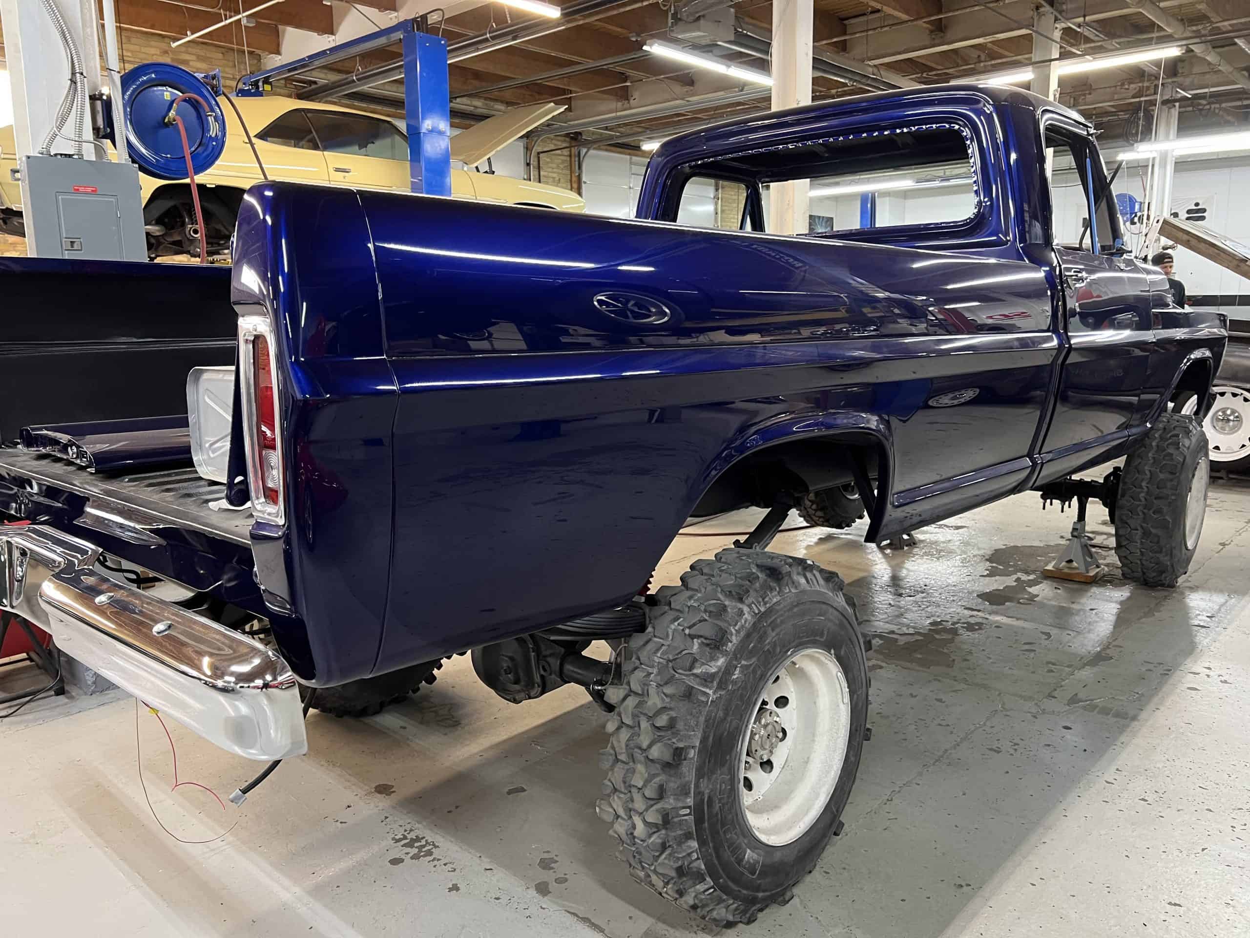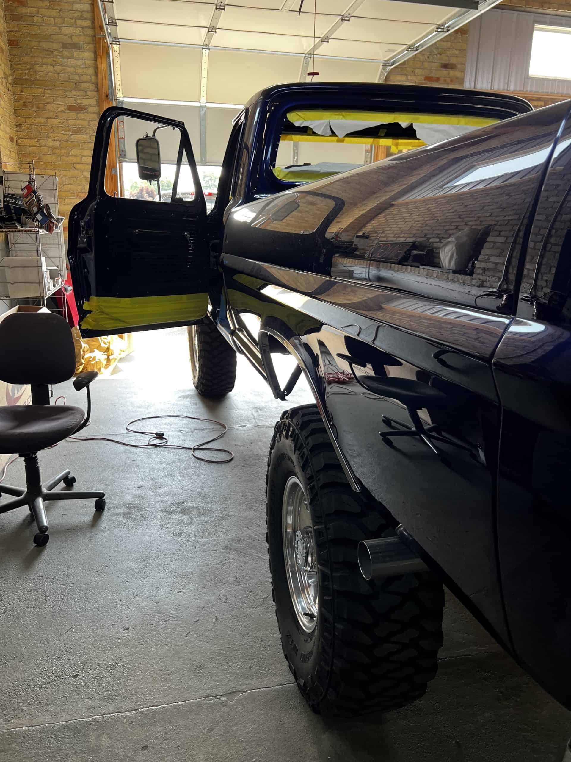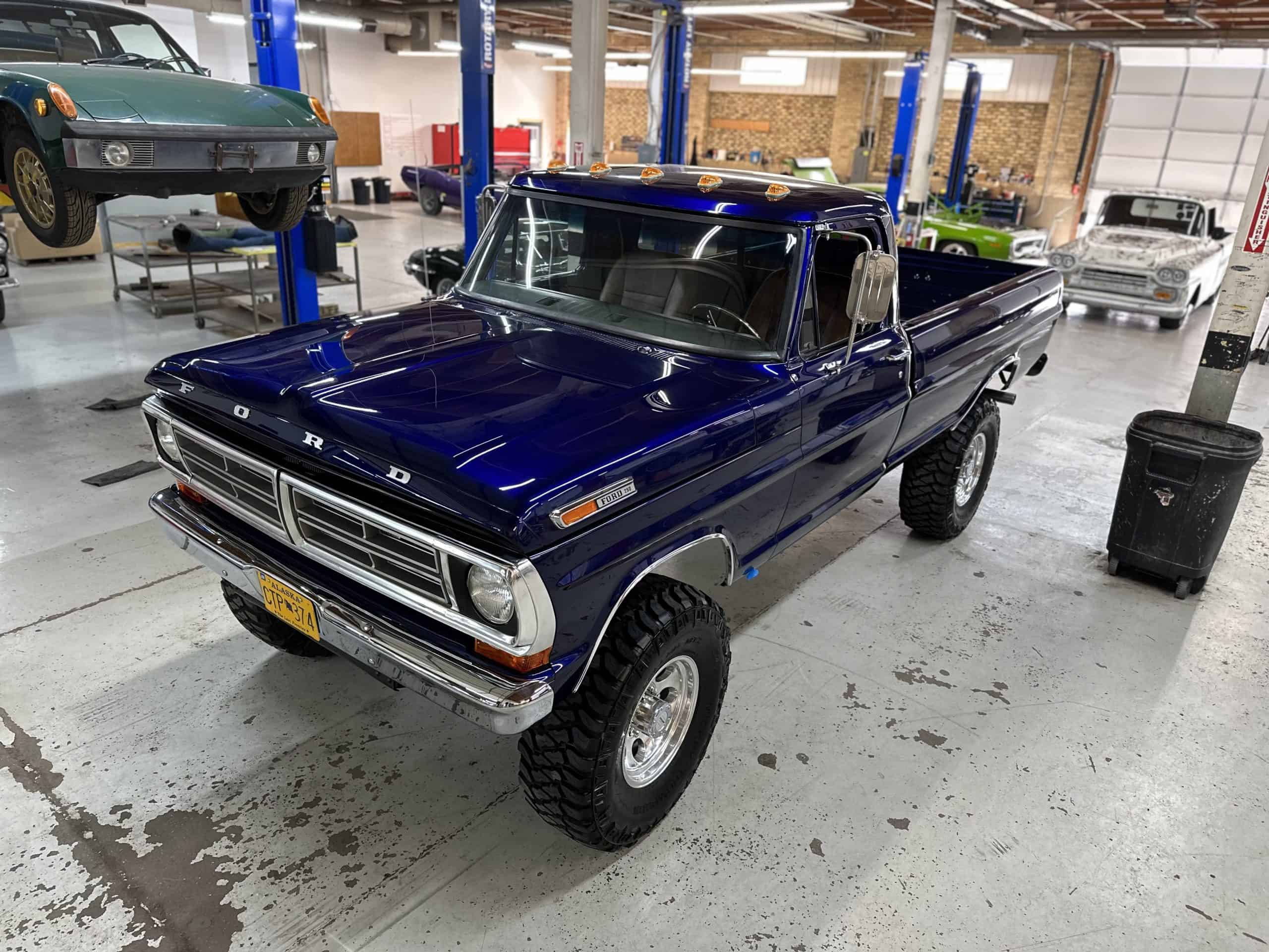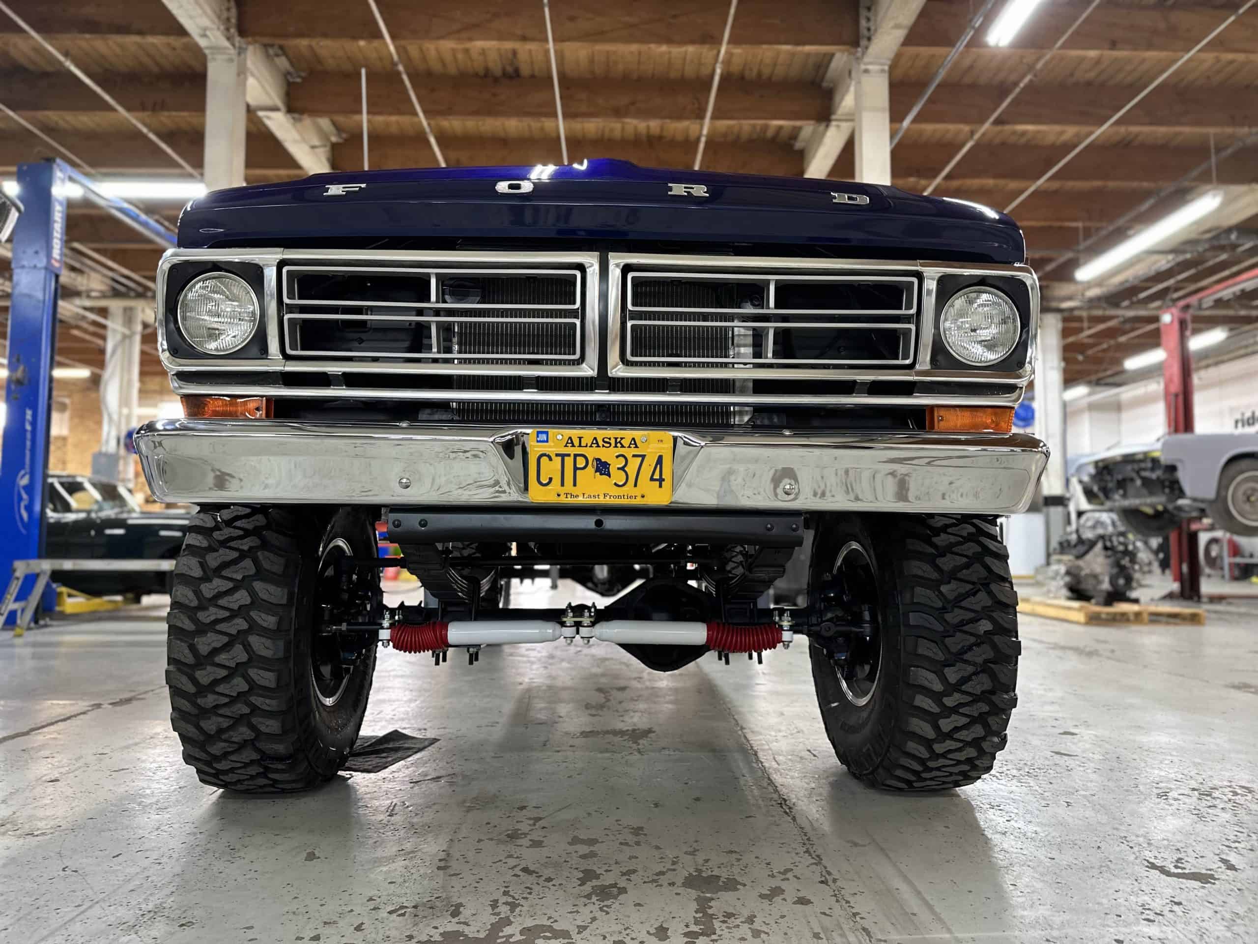1975 FORD F-250 4 x 4 with a 4″ lift 40″ tires and a Coyote 5.0 L swap to turn them. This is a beautiful classic F250 with just the right amount of modern technology to make it look and drive much better than the original. We upgraded the suspension and steering, converted to disc brakes, swapped the engine to a 5.0 L Coyote with automatic transmission and push button transfer case, completely restored the body and then built a fully customized leather interior with power bucket seats and a full length center console.