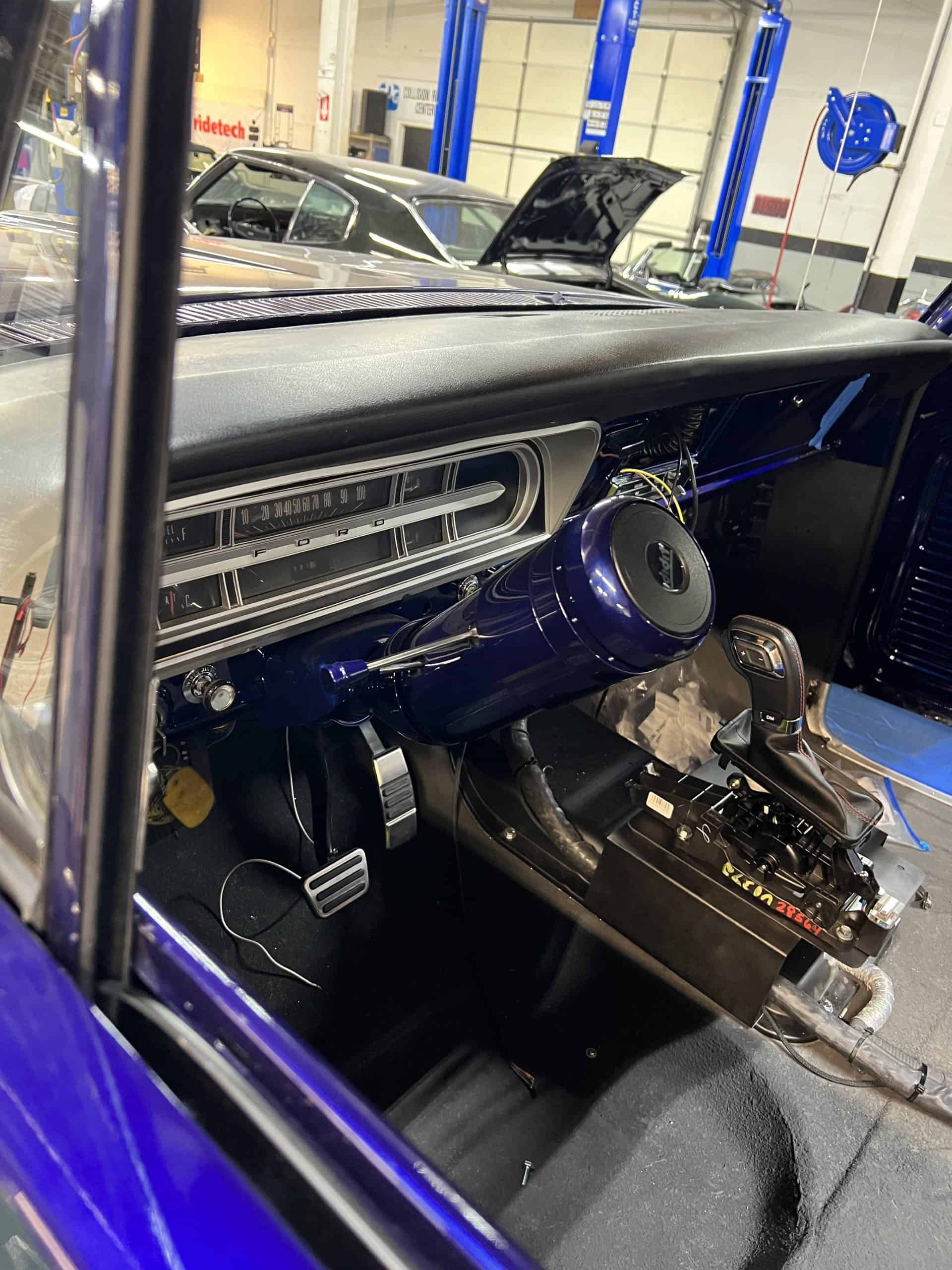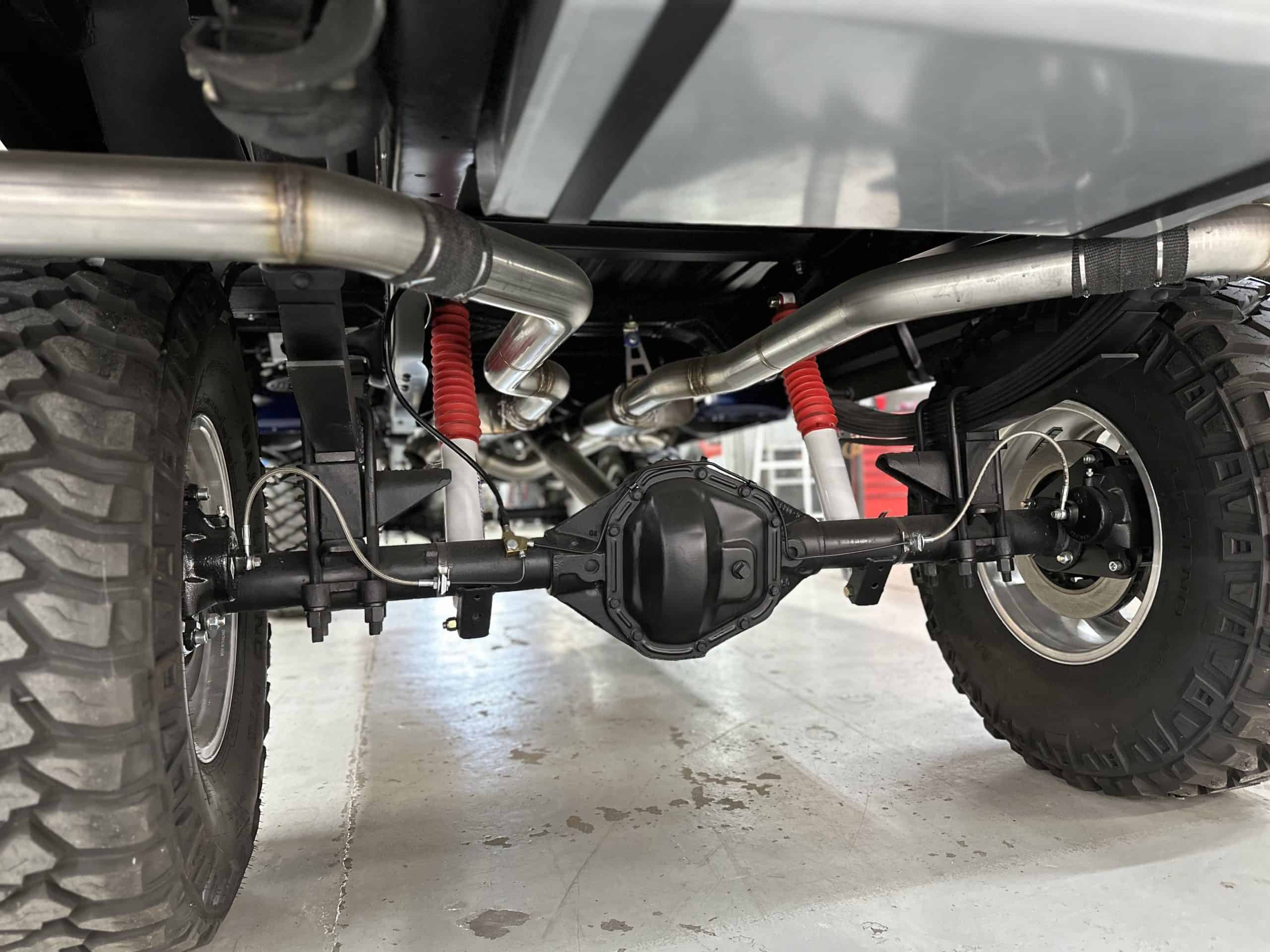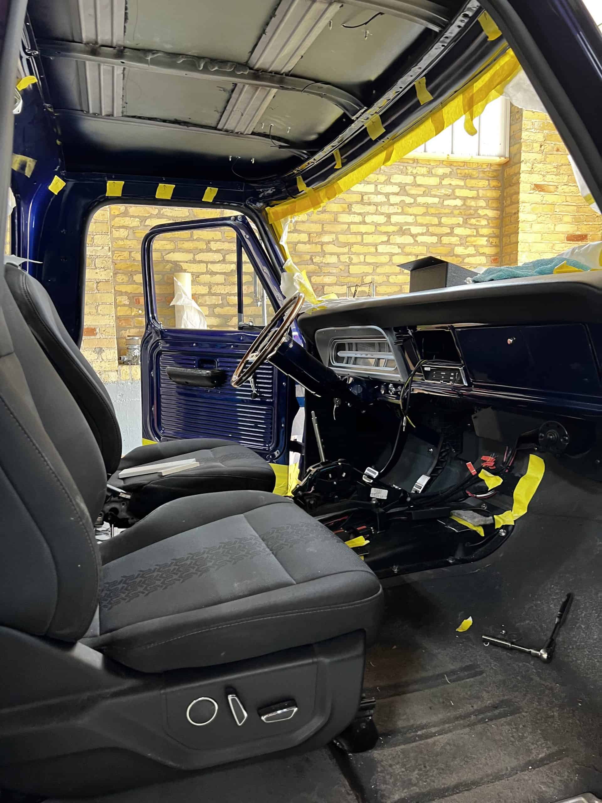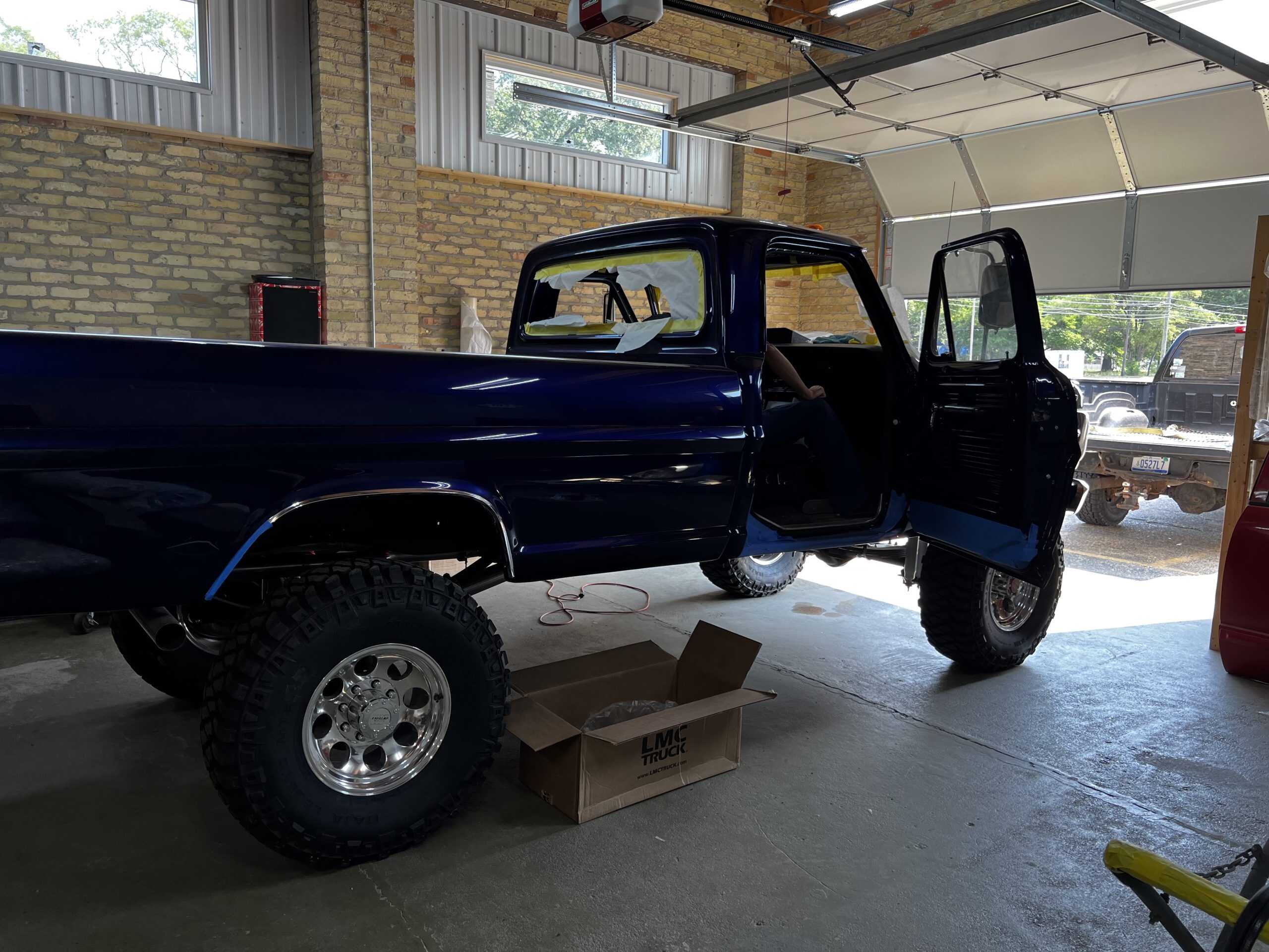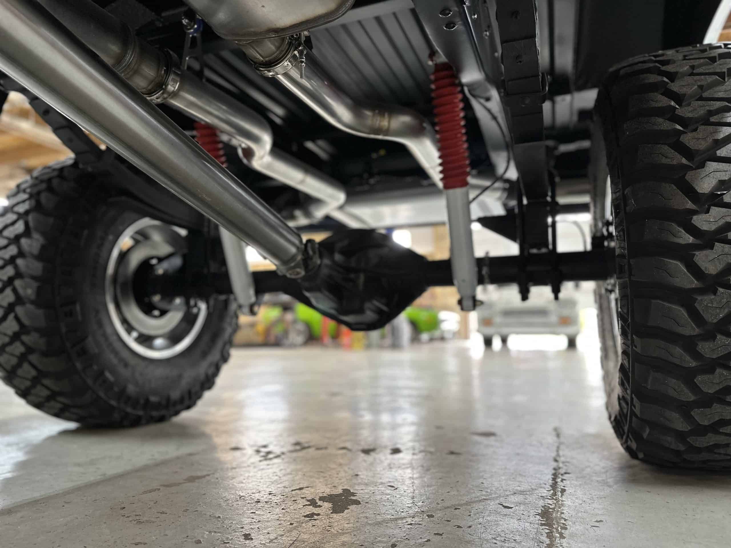1975 FORD F-250 4 x 4 with a 4″ lift 40″ tires and a Coyote 5.0 L swap to turn them. This is a beautiful classic F250 with just the right amount of modern technology to make it look and drive much better than the original. We upgraded the suspension and steering, converted to disc brakes, swapped the engine to a 5.0 L Coyote with automatic transmission and push button transfer case, completely restored the body and then built a fully customized leather interior with power bucket seats and a full length center console.