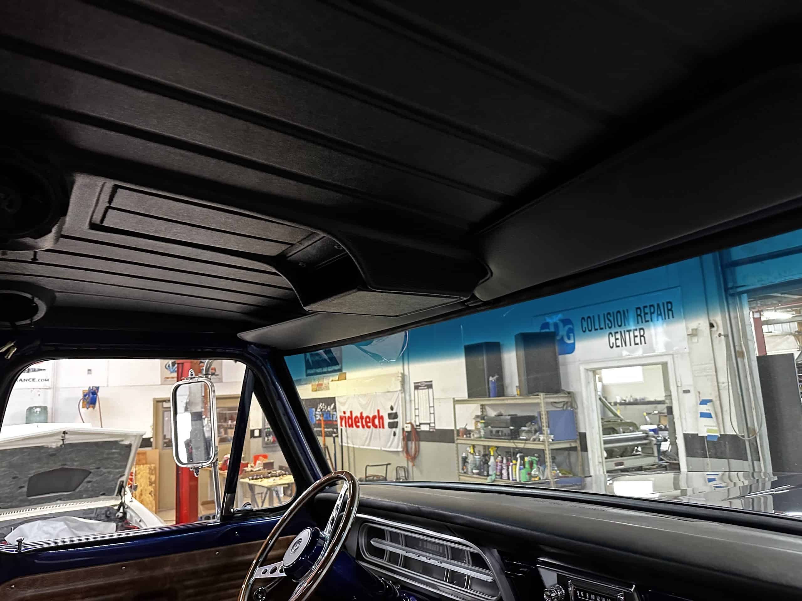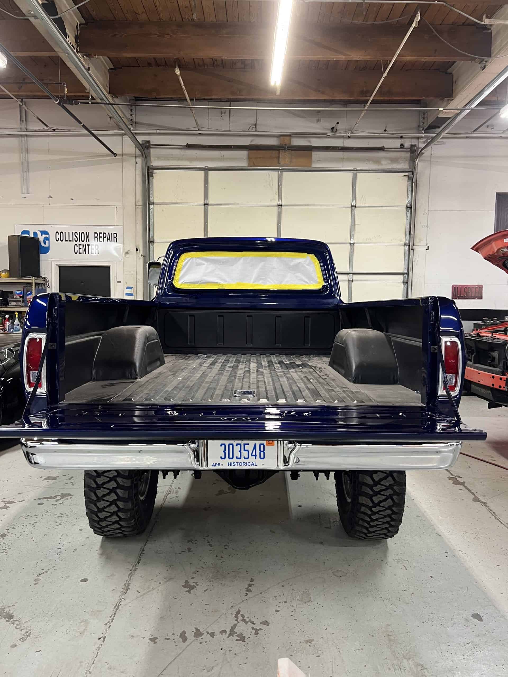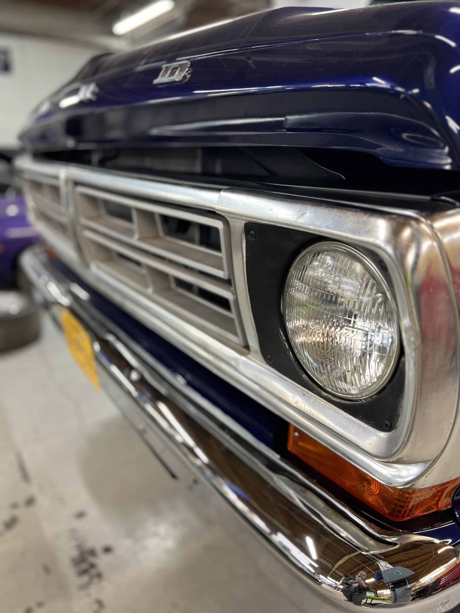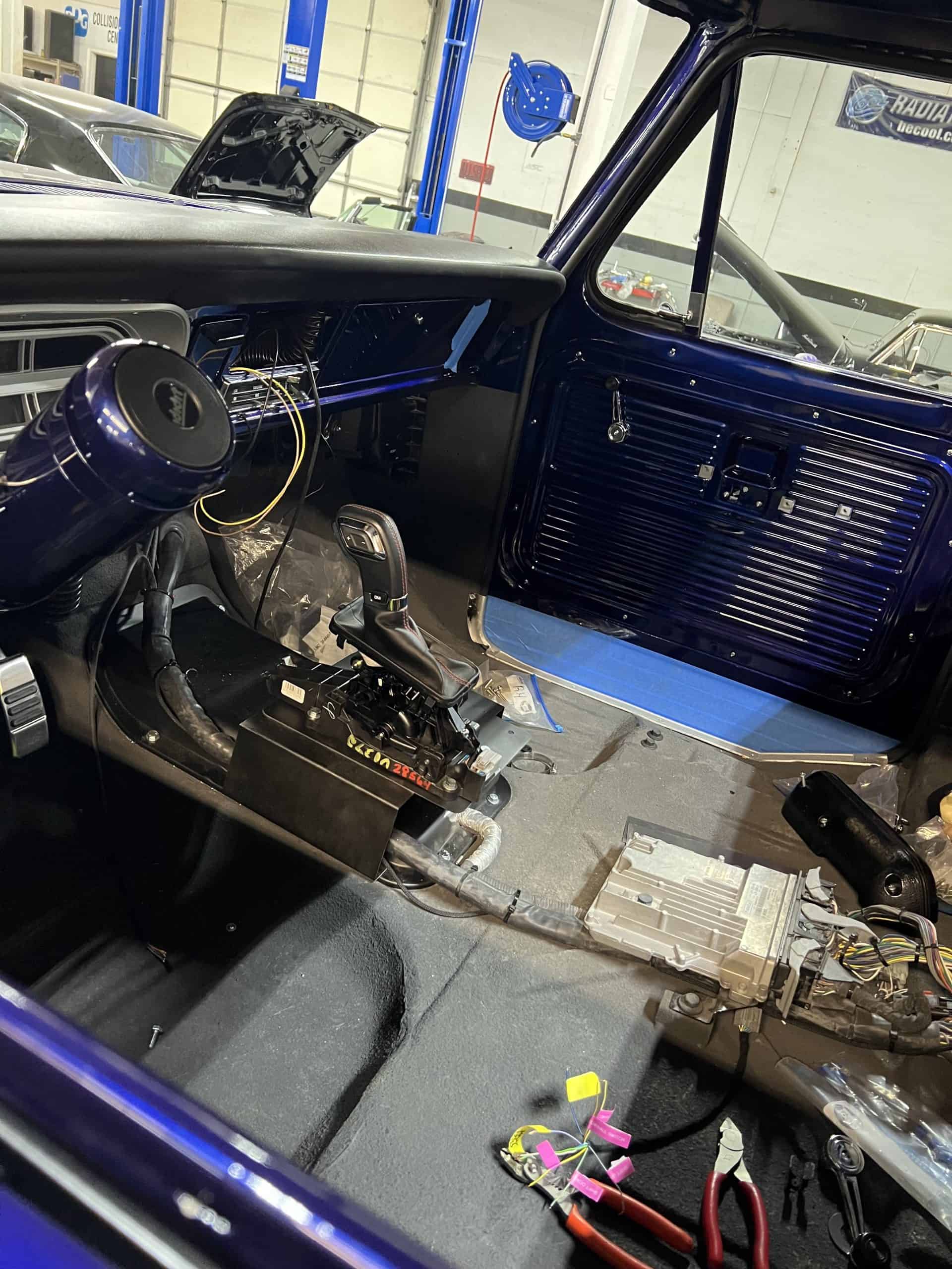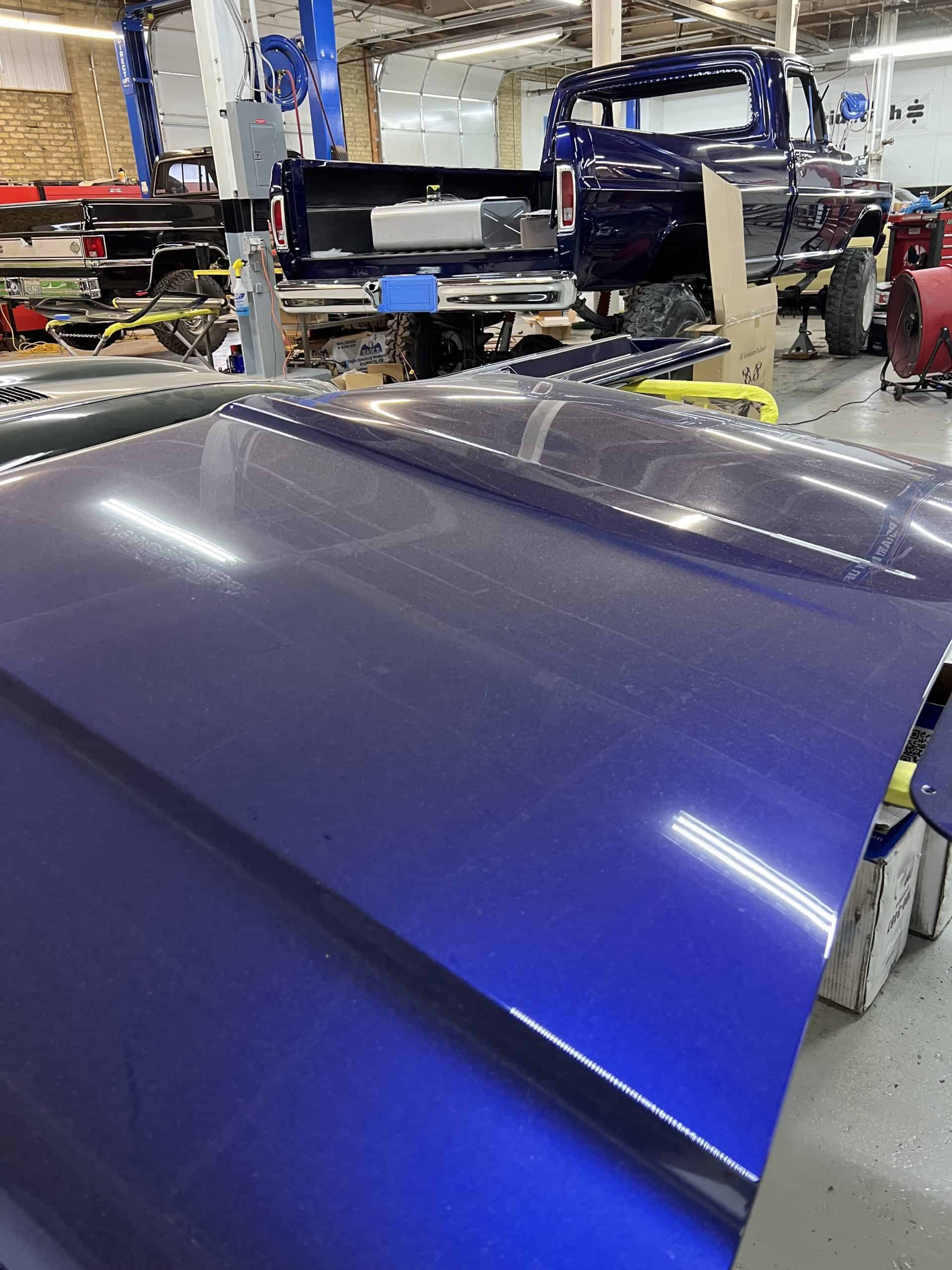 1975 FORD F-250 4 x 4 with a 4″ lift 40″ tires and a Coyote 5.0 L swap to turn them. This is a beautiful classic F250 with just the right amount of modern technology to make it look and drive much better than the original. We upgraded the suspension and steering, converted to disc brakes, swapped the engine to a 5.0 L Coyote with automatic transmission and push button transfer case, completely restored the body and then built a fully customized leather interior with power bucket seats and a full length center console.