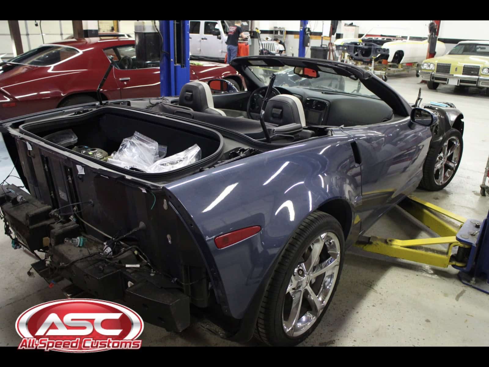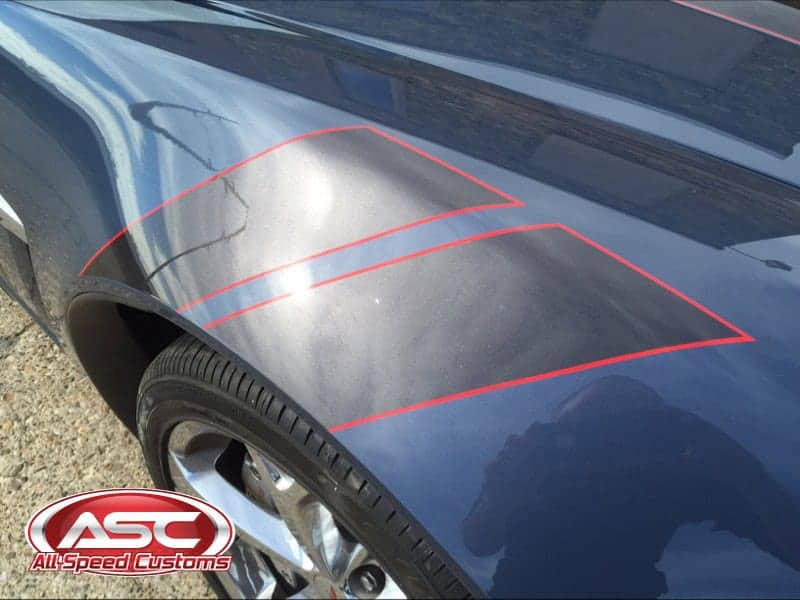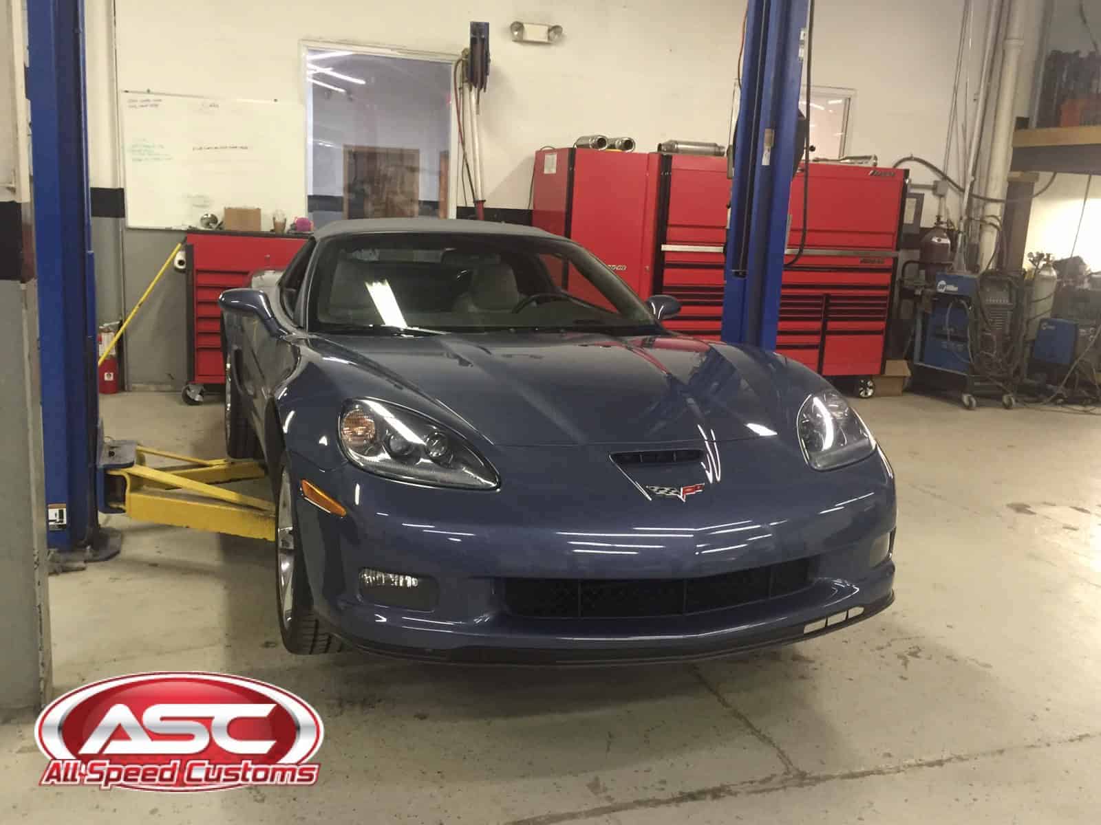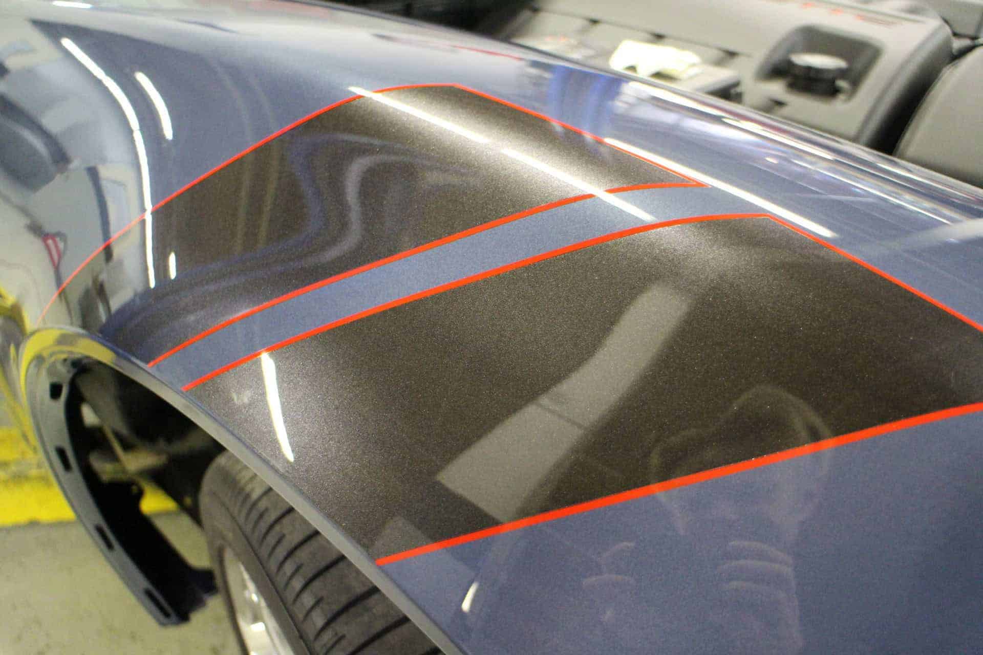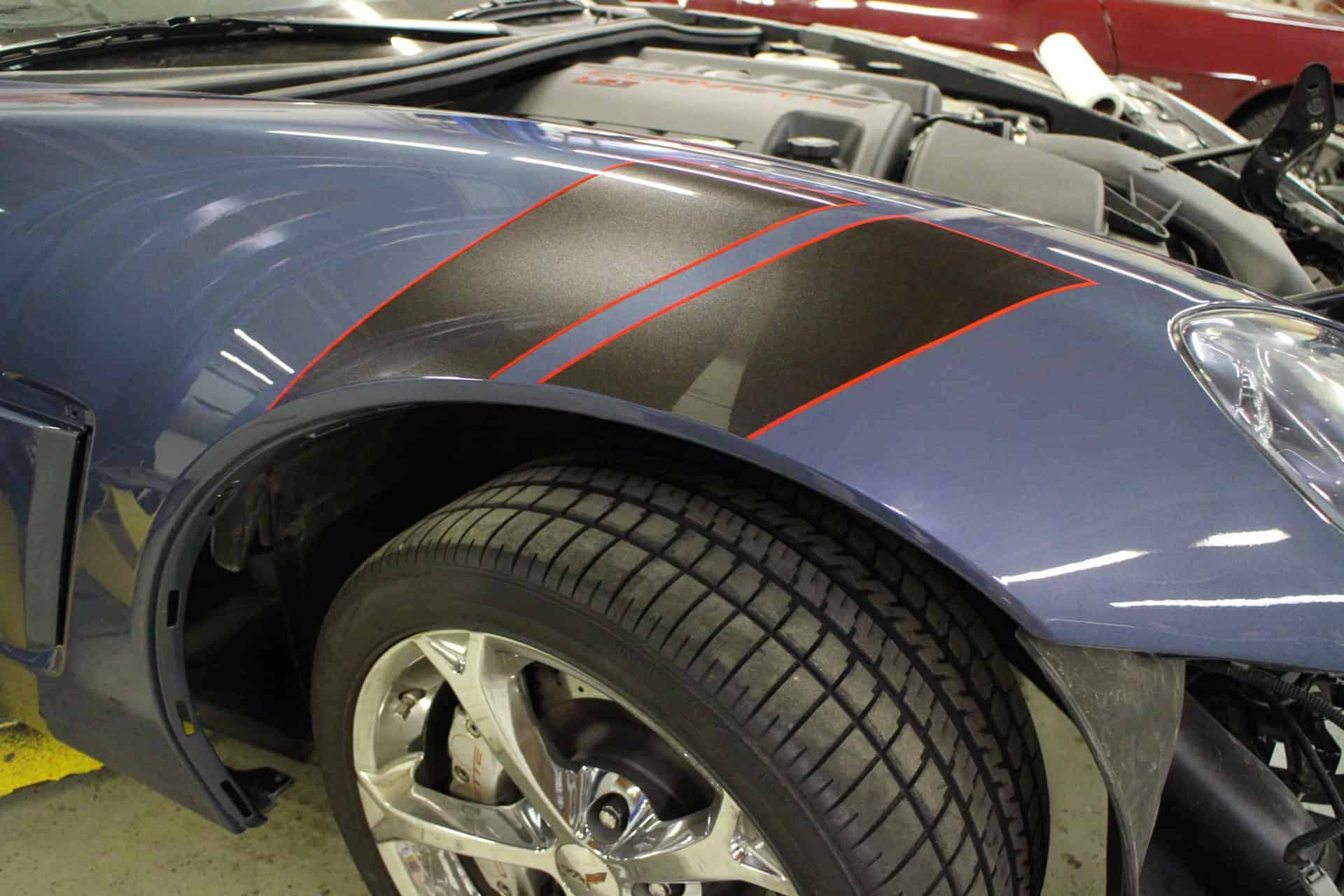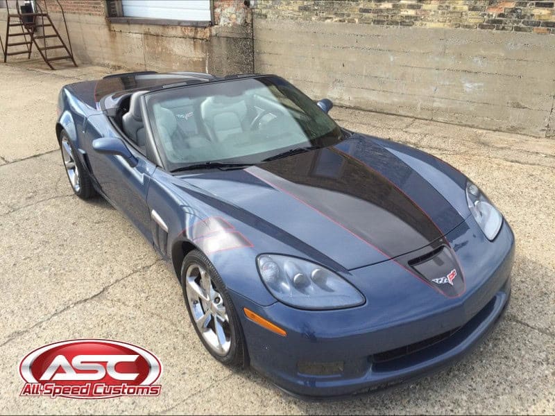 All Speed Customs received this 2012 Chevrolet CORVETTE Gran Sport Convertible, in need of a repaint with a few personal touches. The body was resprayed with its original purple color, and then metallic black was added as a large center stripe accent over the front bumper, hood, and trunk area. Gran Sport fender stripes were also added on the front fender, with red pinstriping outlining each accent area.