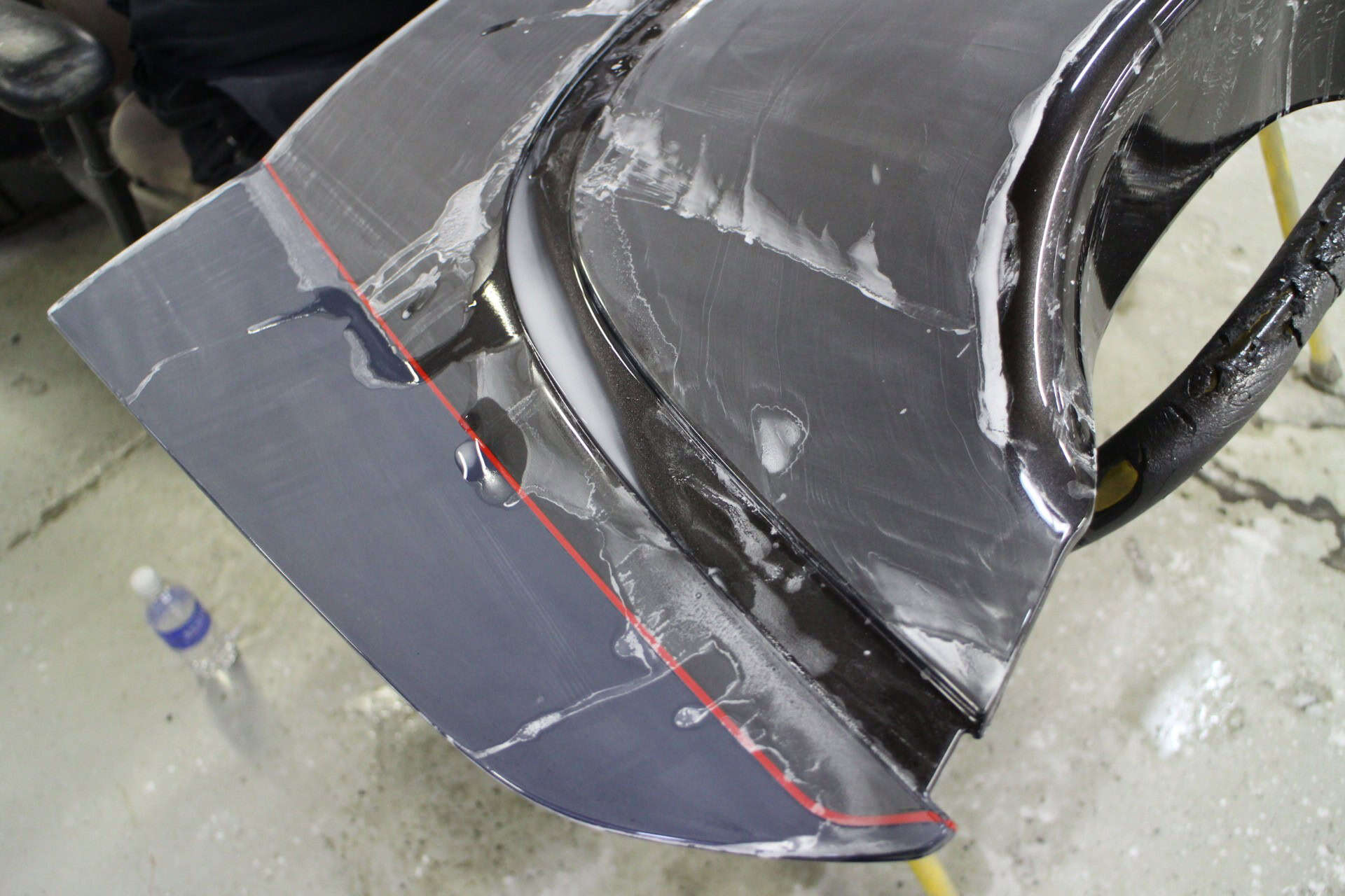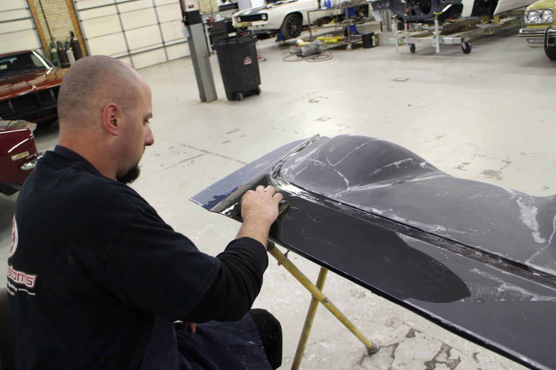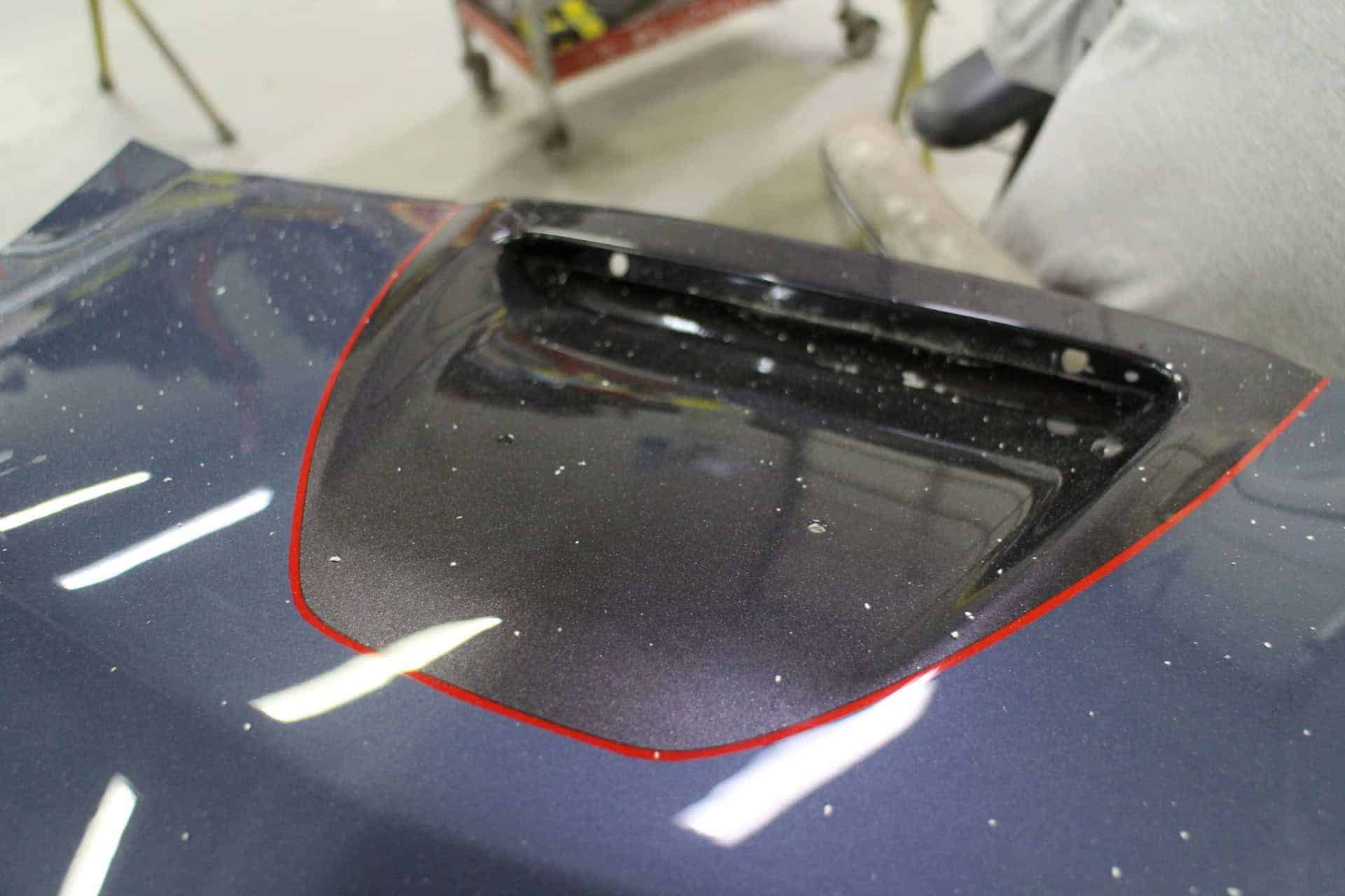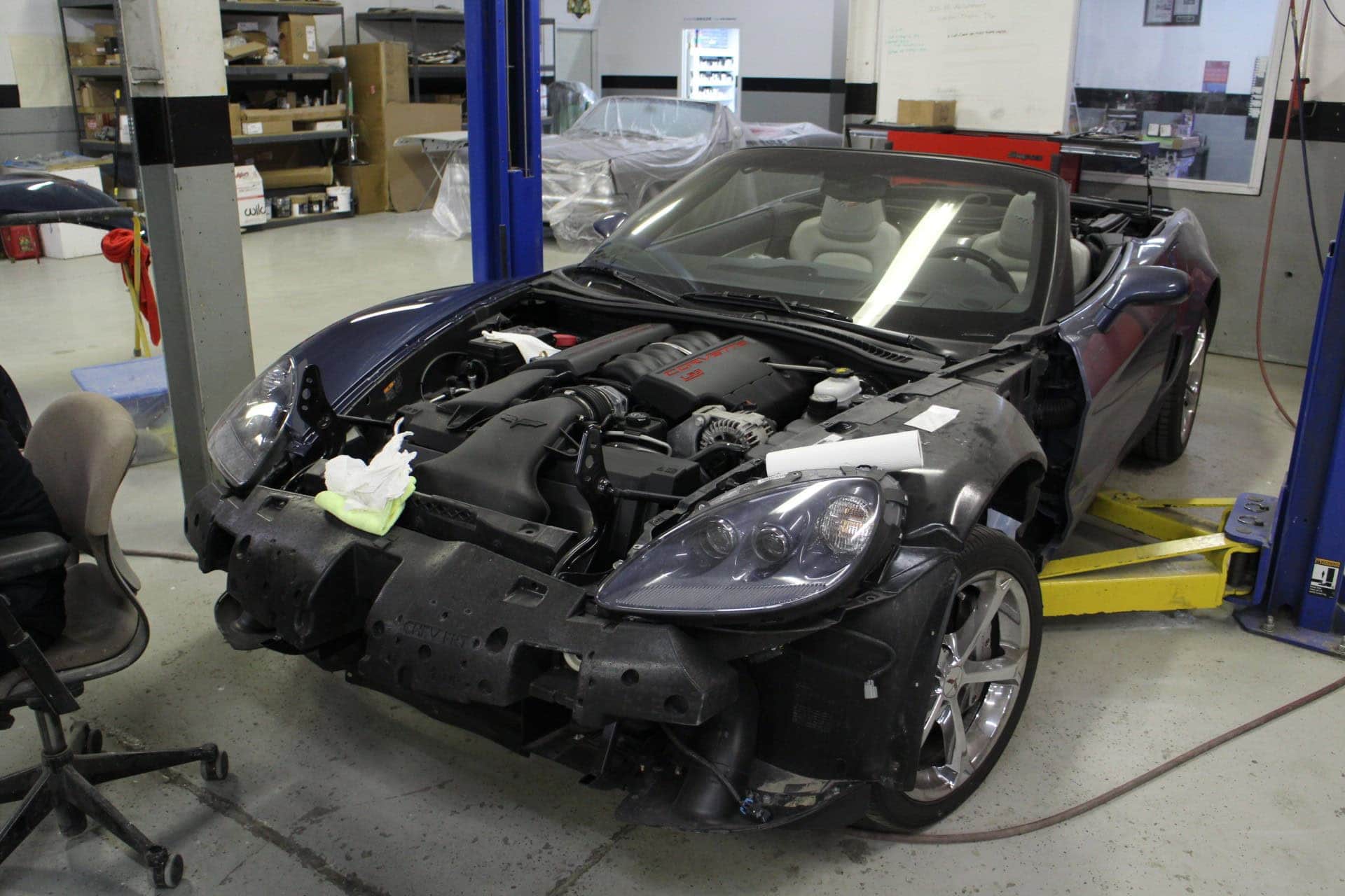 All Speed Customs received this 2012 Chevrolet CORVETTE Gran Sport Convertible, in need of a repaint with a few personal touches. The body was resprayed with its original purple color, and then metallic black was added as a large center stripe accent over the front bumper, hood, and trunk area. Gran Sport fender stripes were also added on the front fender, with red pinstriping outlining each accent area.